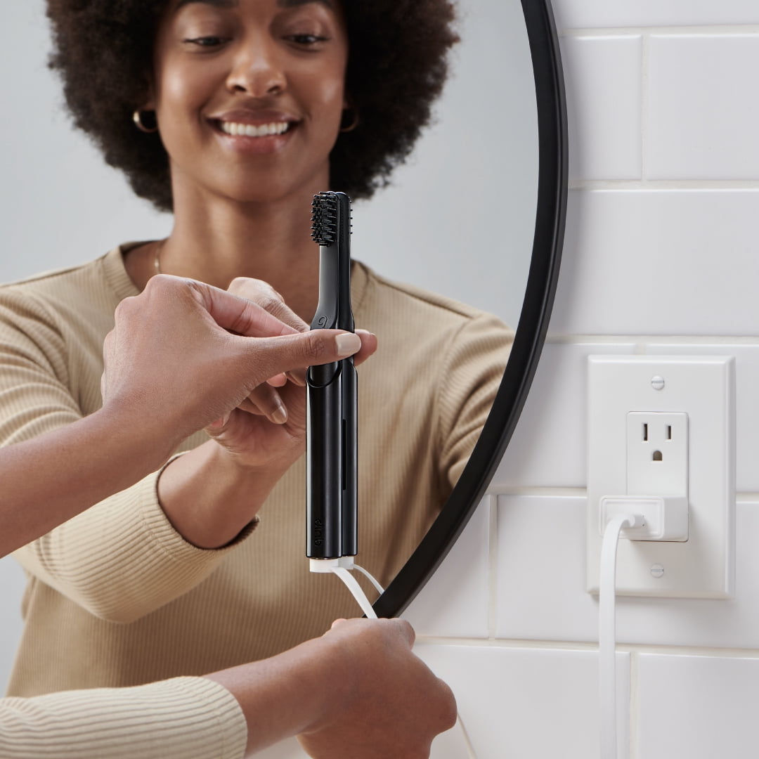 Quip Adult All-Black Plastic Smart Rechargeable Electric Toothbrush Stylish All-Black Design: Enhance your bathroom aesthetic with the sleek and modern all-black plastic finish of the Quip toothbrush. Help you prevent gingivitis Smart Vibrations: Experience advanced oral care with precise sonic vibrations that effectively remove plaque and debris for healthier gums and a brighter smile. Built-in Timer: Never cut your brushing time short again. The built-in timer guides you through a dentist-recommended two-minute brushing cycle, ensuring a thorough clean every time. Rechargeable Battery: Enjoy weeks of usage on a single charge thanks to the rechargeable battery. The included USB charging dock makes recharging convenient and hassle-free.