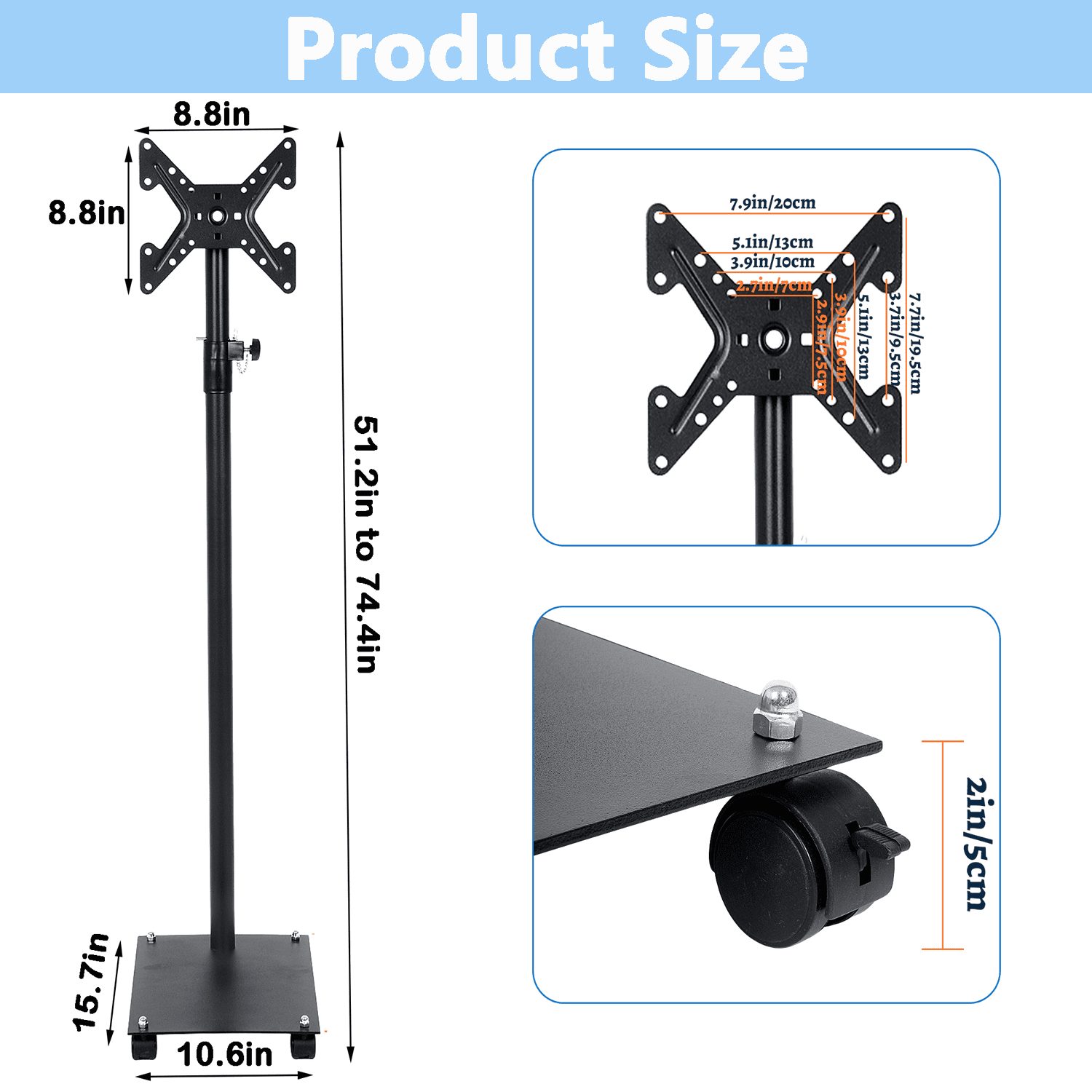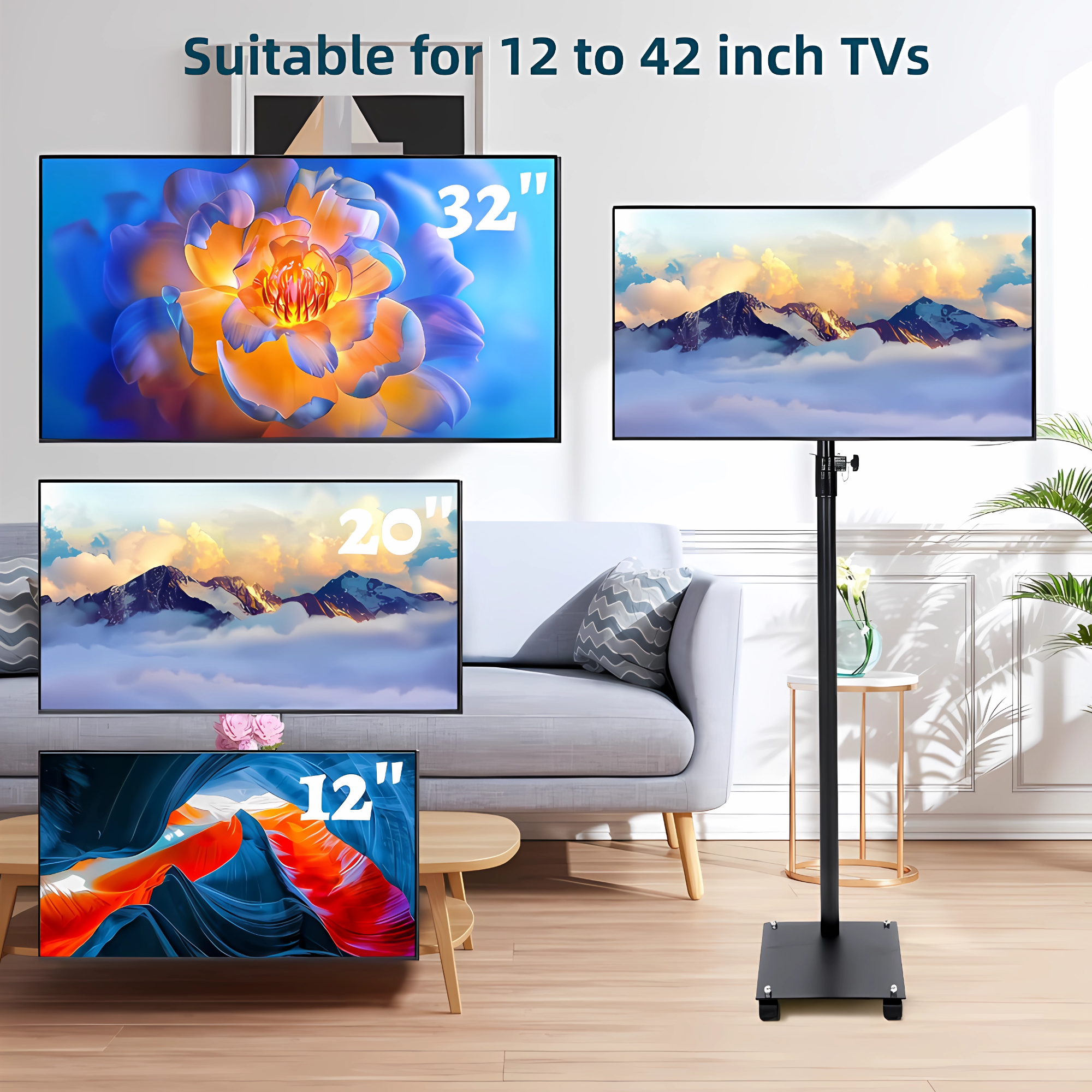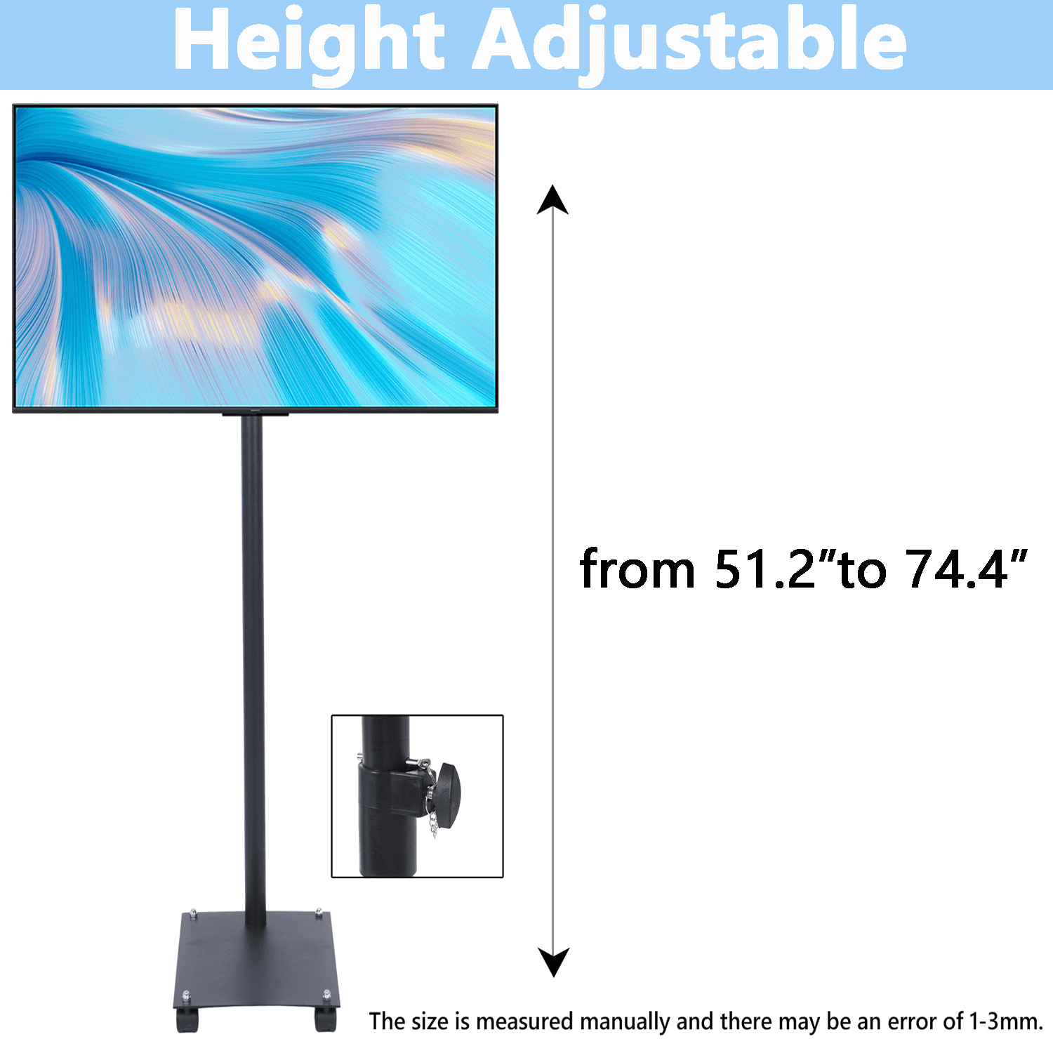 【Superior Material】 Qunbio TV stand is made of high-quality cold-rolled steel chassis, which can cover a large area and stably support the TV. There is also a safety lock and non slip foot design on the TV stand mount to ensure the safety of your TV. 【Universal Design】 Our universal TV floor stand is suitable for most 12 to 42 inch LCD LED flat panel TVs, and the VESA pattern is 3×3 inch, 4×4 inch, 7.8×4 inch or 7.8×7 8 inches. Maximum load capacity 55 pounds. 【Height Adjustment】 Our floor TV stand has 4 level of height adjustment. And the height of our stand can be adjusted between 51.2″ and 74.4″. 【Locked Wheels】 The bottom of the TV bracket is equipped with 4 locked wheels. It’s easy to move your TV everywhere you like and ensures stability when locked. 【Easy to Install】 Our tv mount is easy to install, you can install and use them within 15 minutes after referring to the instruction manual. It is widely used in meeting rooms, living rooms, bedrooms, activity rooms, etc.