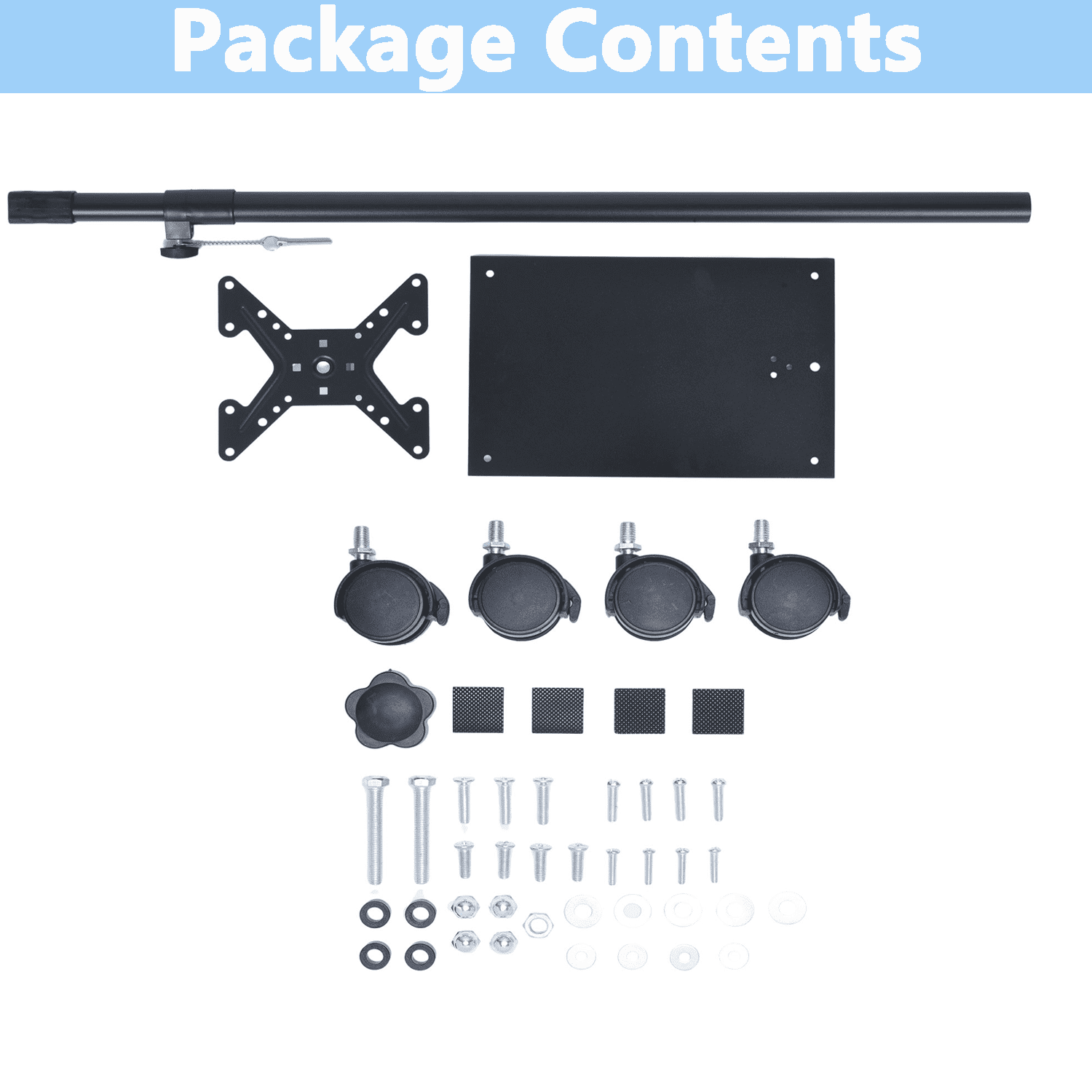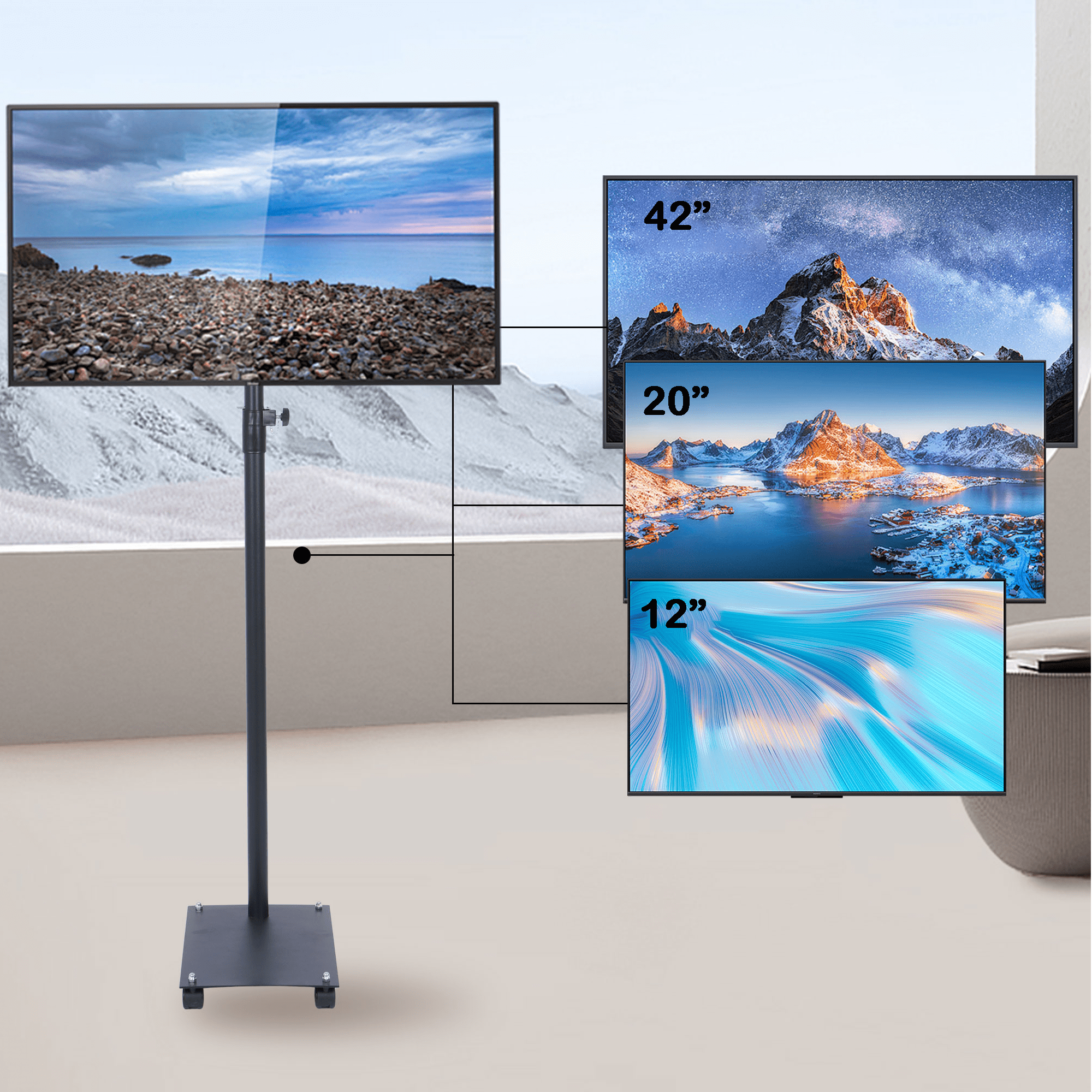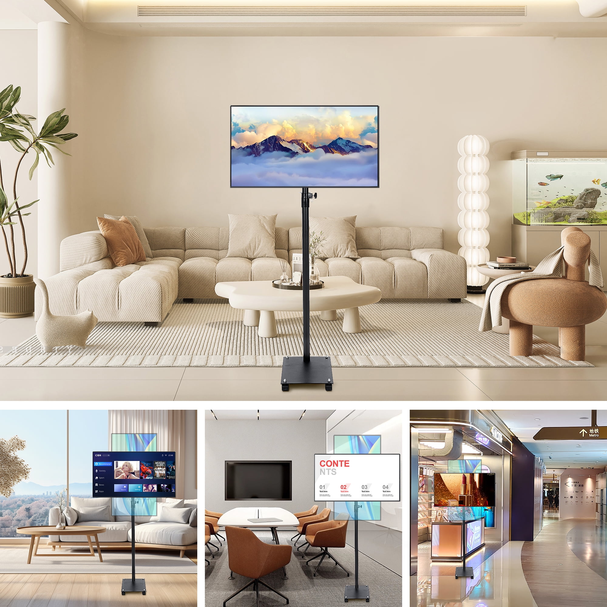 【Superior Material】 Qunbio TV stand is made of high-quality cold-rolled steel chassis, which can cover a large area and stably support the TV. There is also a safety lock and non slip foot design on the TV stand mount to ensure the safety of your TV. 【Universal Design】 Our universal TV floor stand is suitable for most 12 to 42 inch LCD LED flat panel TVs, and the VESA pattern is 3×3 inch, 4×4 inch, 7.8×4 inch or 7.8×7 8 inches. Maximum load capacity 55 pounds. 【Height Adjustment】 Our floor TV stand has 4 level of height adjustment. And the height of our stand can be adjusted between 51.2″ and 74.4″. 【Locked Wheels】 The bottom of the TV bracket is equipped with 4 locked wheels. It’s easy to move your TV everywhere you like and ensures stability when locked. 【Easy to Install】 Our tv mount is easy to install, you can install and use them within 15 minutes after referring to the instruction manual. It is widely used in meeting rooms, living rooms, bedrooms, activity rooms, etc.