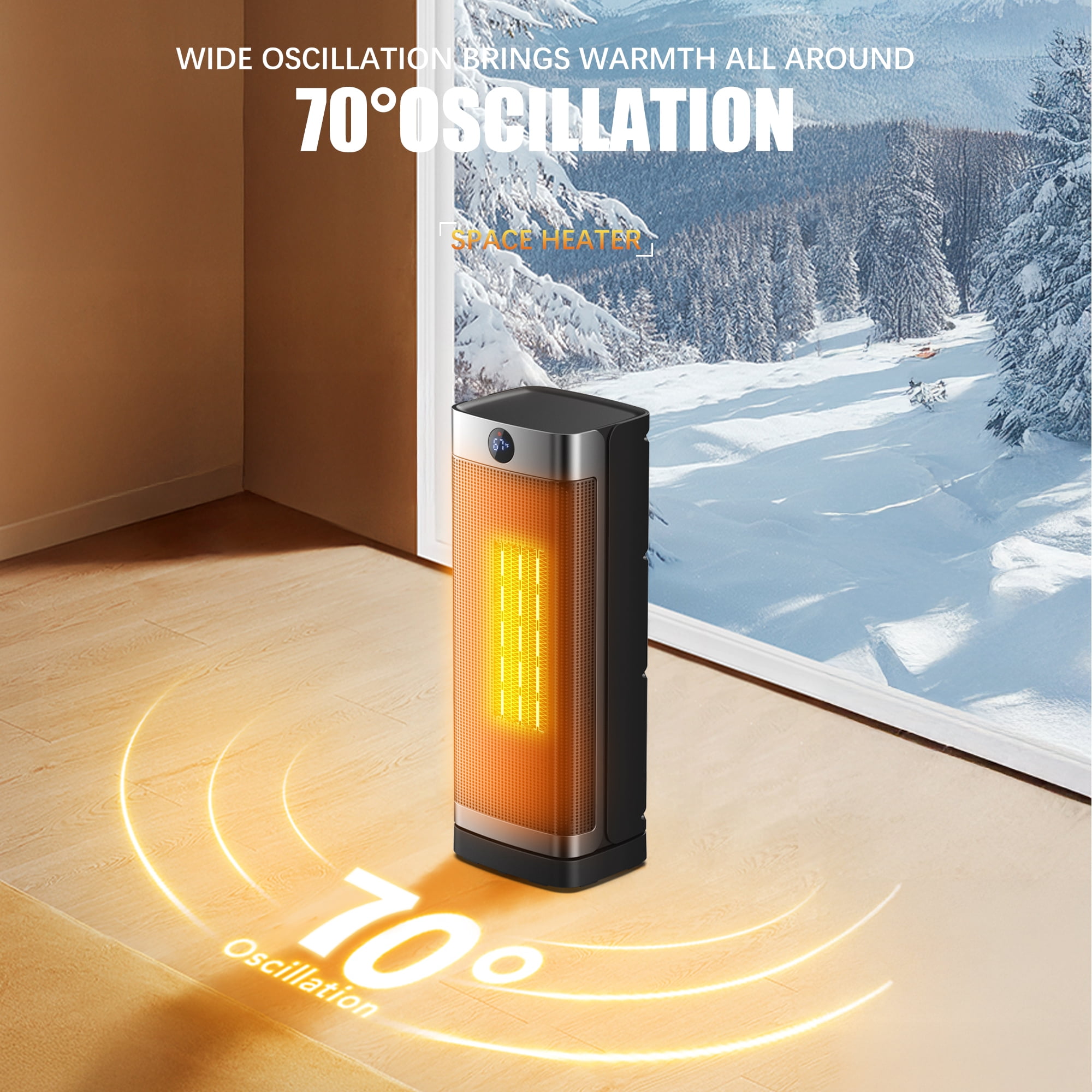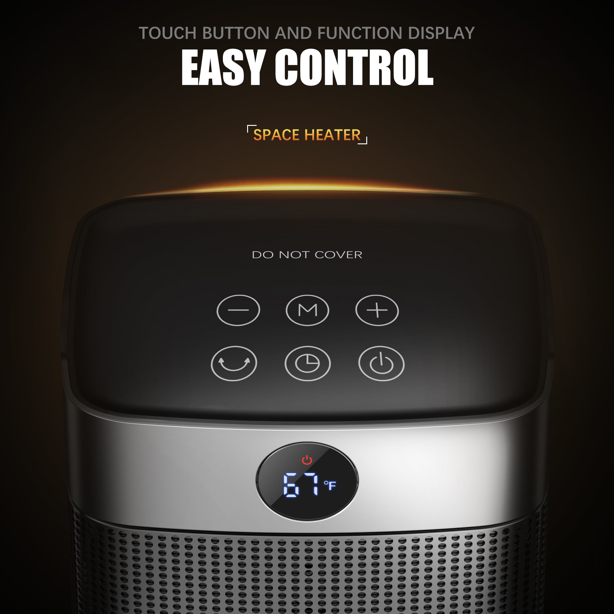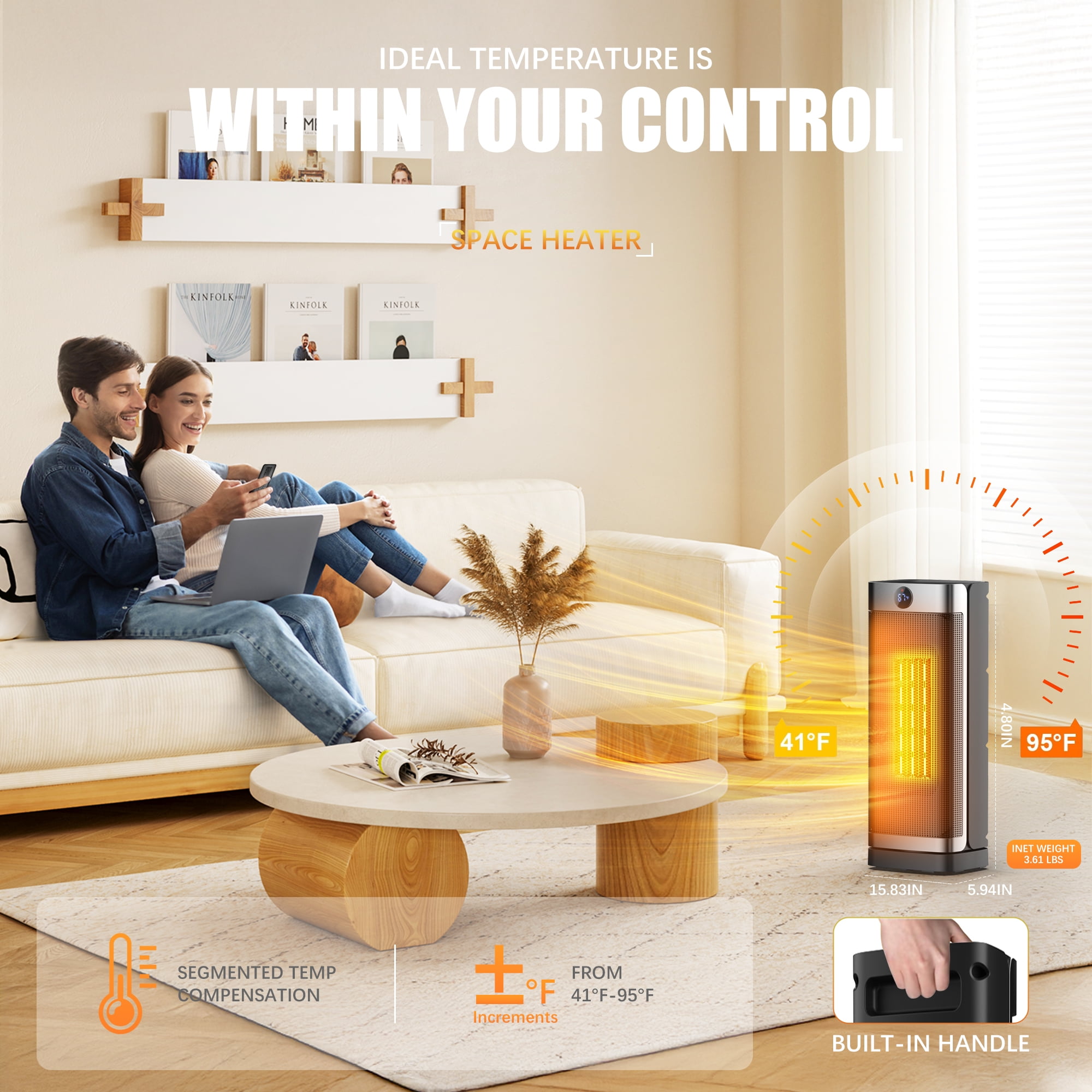 2s Fast & Powerful Warmth: The small heater with energy-efficient 1500W PTC ceramic heating technology rapidly heats a 200ft area. Equipped with 1200W or 900W low heating mode and one cool air fan to meet your various needs. Smaller than the tower heater but just as powerful. Usage Comfort: The touchscreen is placed on top of the heater for easier reach, and the remote provides full access from up to 26 feet away. The 16-inch compact design makes our space heater a real space saver that is easy to move around with its hidden handle. Cord Lenth: 6 ft / 1.8 m Multiple Safety Features: V0-rated flame-retardant materials, overheat sensor, tip-over switch, automatic shutdown after 24 hours without operation, and other built-in ETL-certified mechanisms are powerful safety features on this space heater, An additional child lock setting reduces the risk of accidents, making safer to heat and more secure to use. Experience even heat distribution: Our ceramic heater with a 60-degree oscillation function ensures warmth in every corner of your room. Set the heat flow to your preference, directing it in a specific direction or enjoying broader coverage Noiseless and Silent: Designed for a better user experience, this space heaters for indoor use operates quietly at only 34dB thanks to its silent wind wheel. Enjoy warmth without any distracting noise in your space.