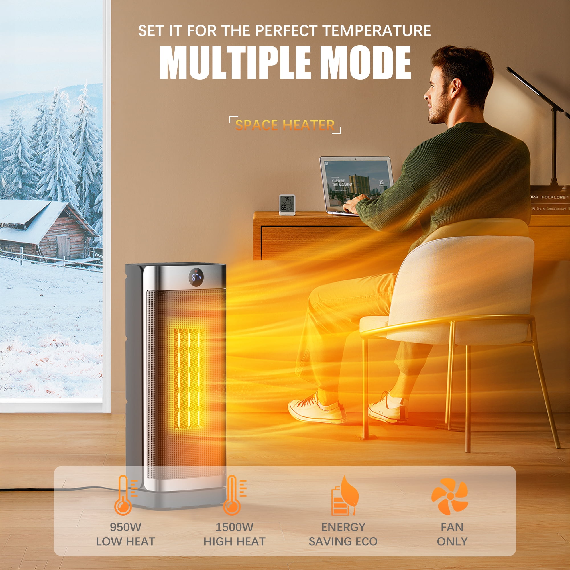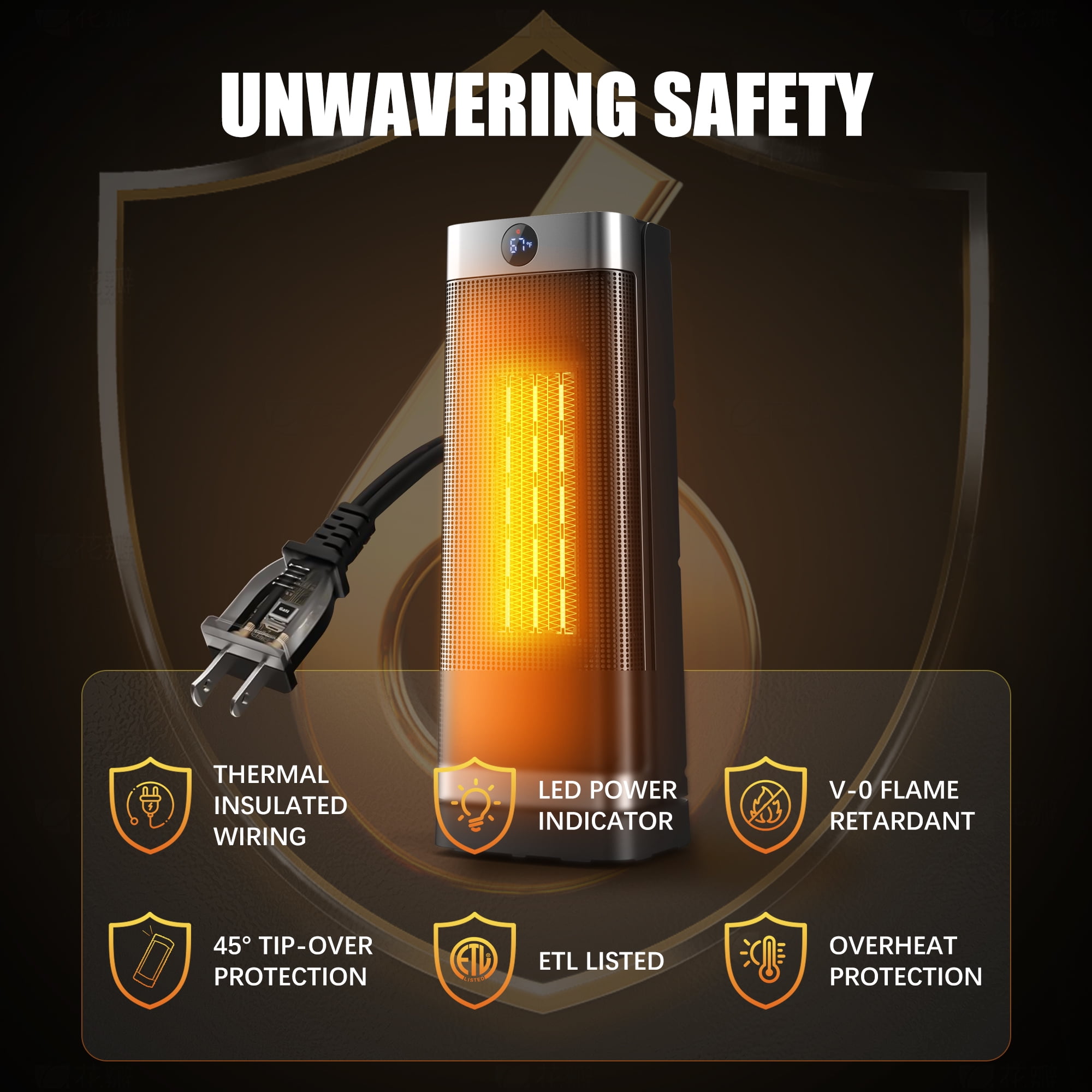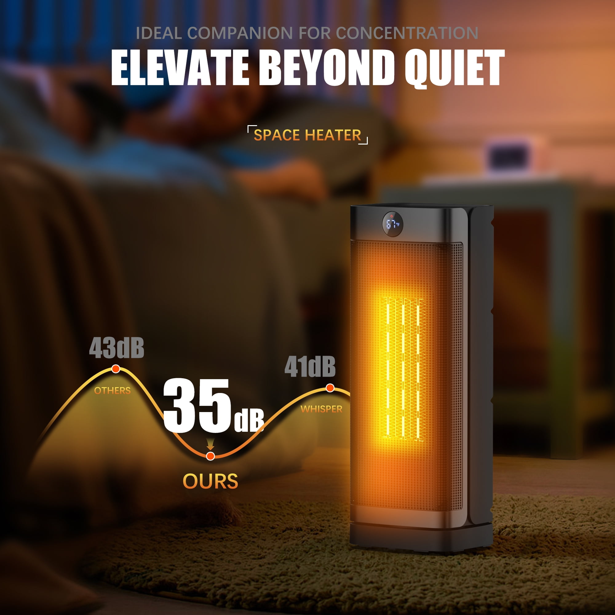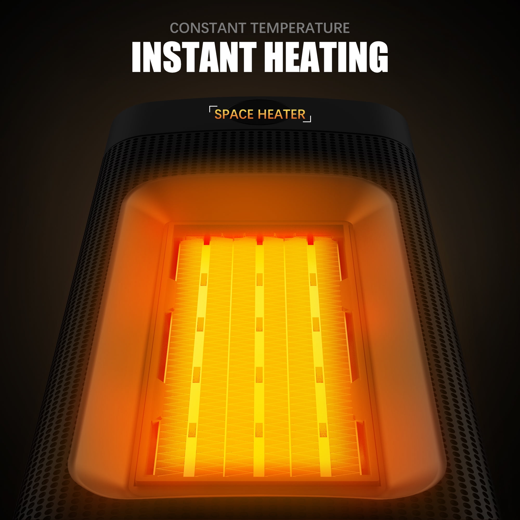 2s Fast & Powerful Warmth: The small heater with energy-efficient 1500W PTC ceramic heating technology rapidly heats a 200ft area. Equipped with 1200W or 900W low heating mode and one cool air fan to meet your various needs. Smaller than the tower heater but just as powerful. Usage Comfort: The touchscreen is placed on top of the heater for easier reach, and the remote provides full access from up to 26 feet away. The 16-inch compact design makes our space heater a real space saver that is easy to move around with its hidden handle. Cord Lenth: 6 ft / 1.8 m Multiple Safety Features: V0-rated flame-retardant materials, overheat sensor, tip-over switch, automatic shutdown after 24 hours without operation, and other built-in ETL-certified mechanisms are powerful safety features on this space heater, An additional child lock setting reduces the risk of accidents, making safer to heat and more secure to use. Experience even heat distribution: Our ceramic heater with a 60-degree oscillation function ensures warmth in every corner of your room. Set the heat flow to your preference, directing it in a specific direction or enjoying broader coverage Noiseless and Silent: Designed for a better user experience, this space heaters for indoor use operates quietly at only 34dB thanks to its silent wind wheel. Enjoy warmth without any distracting noise in your space.