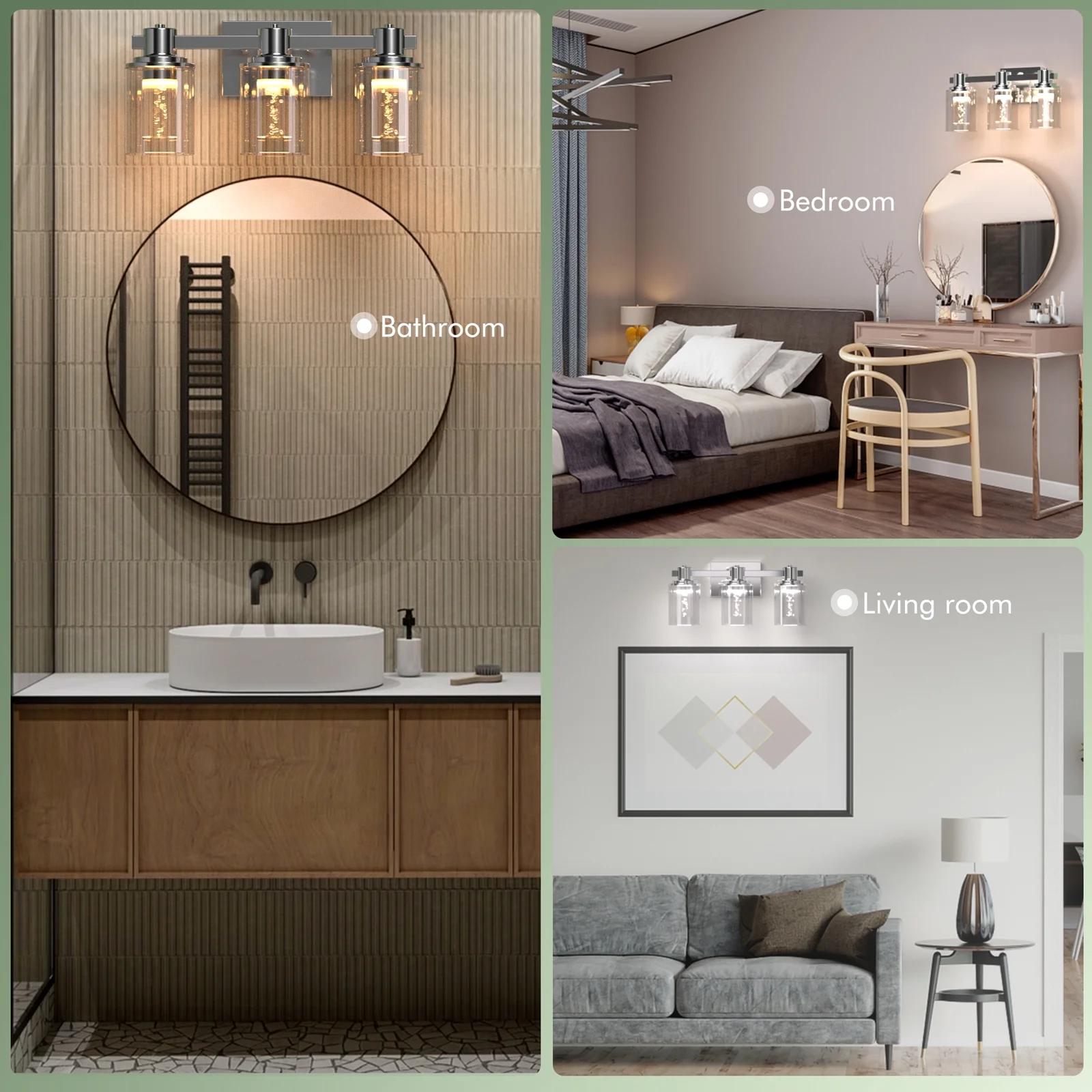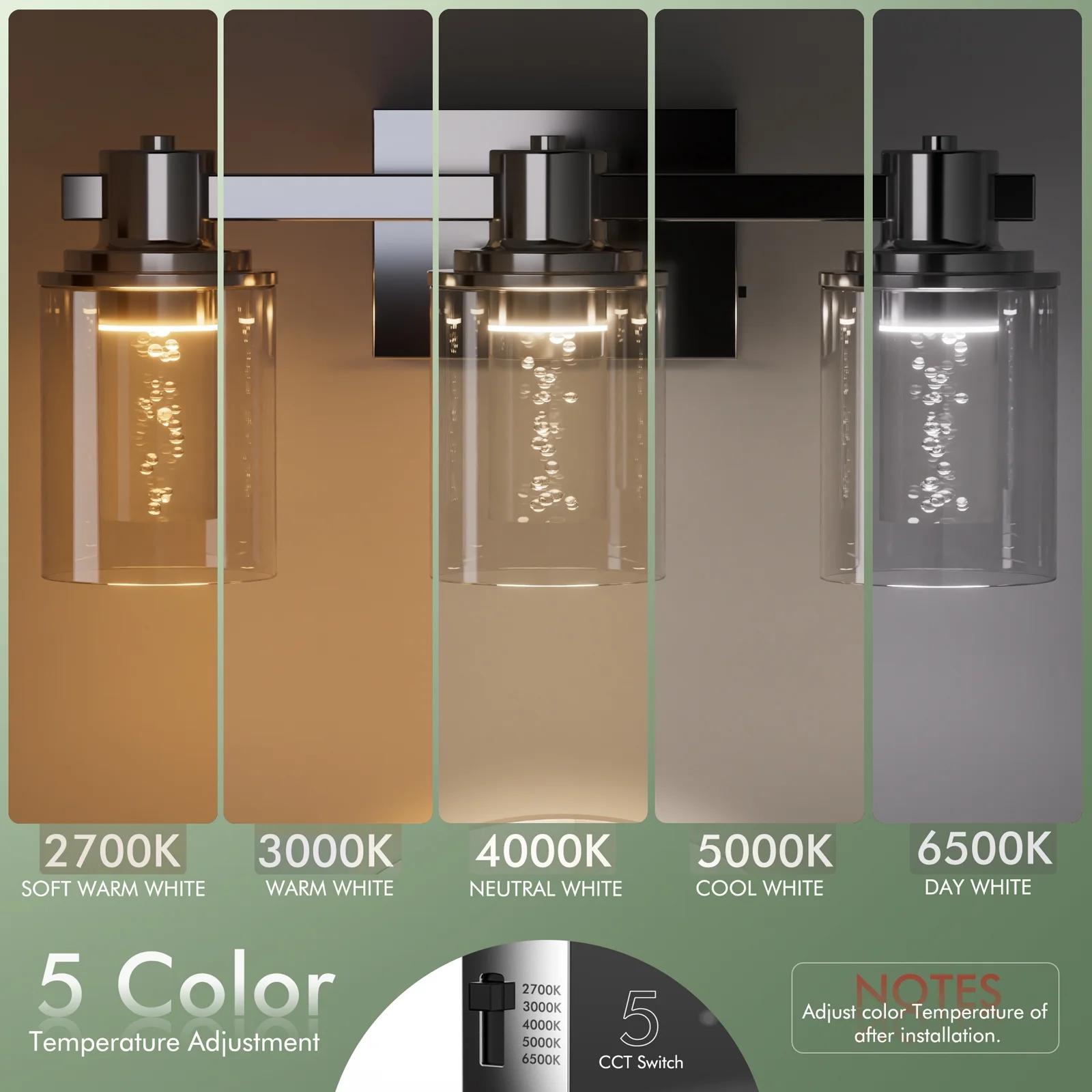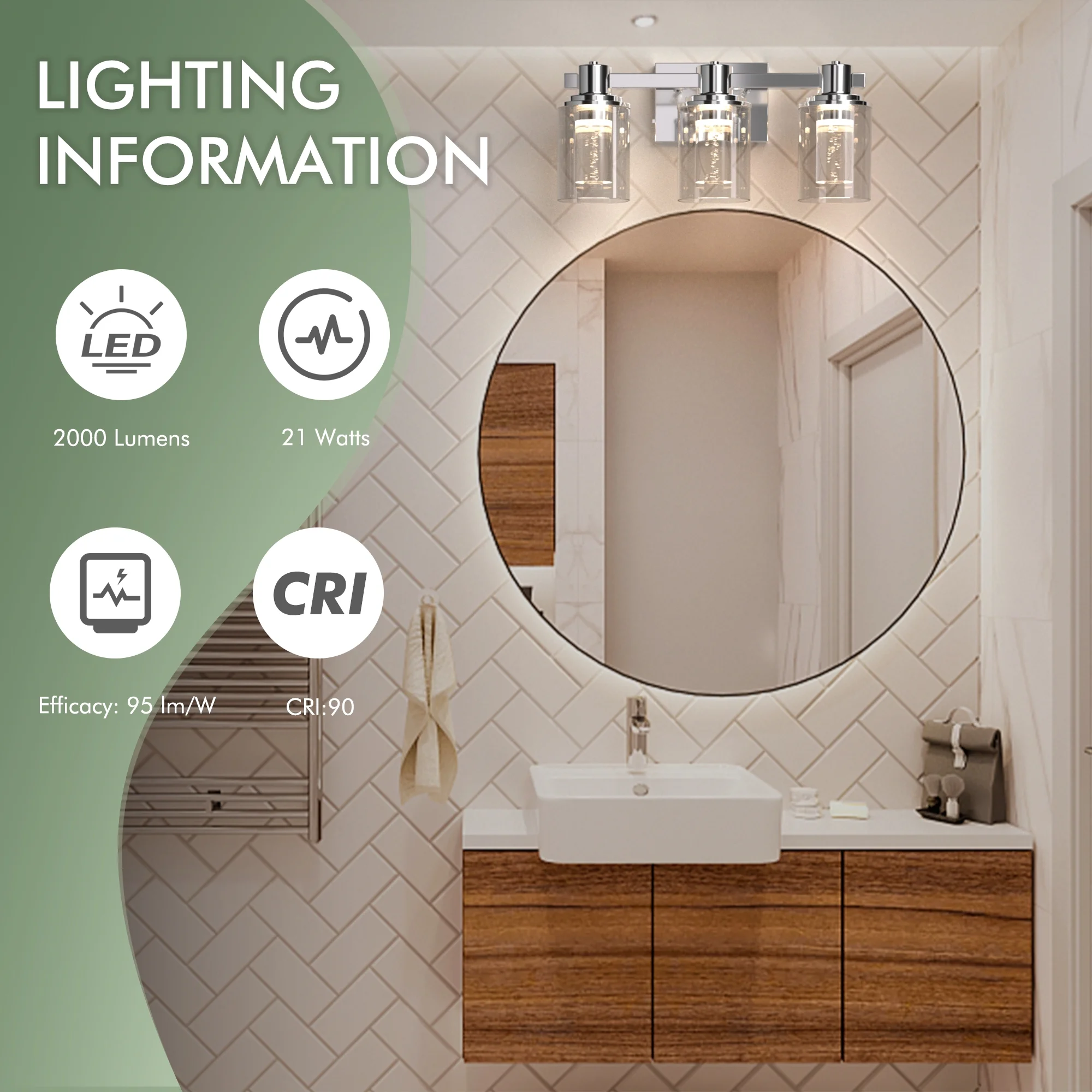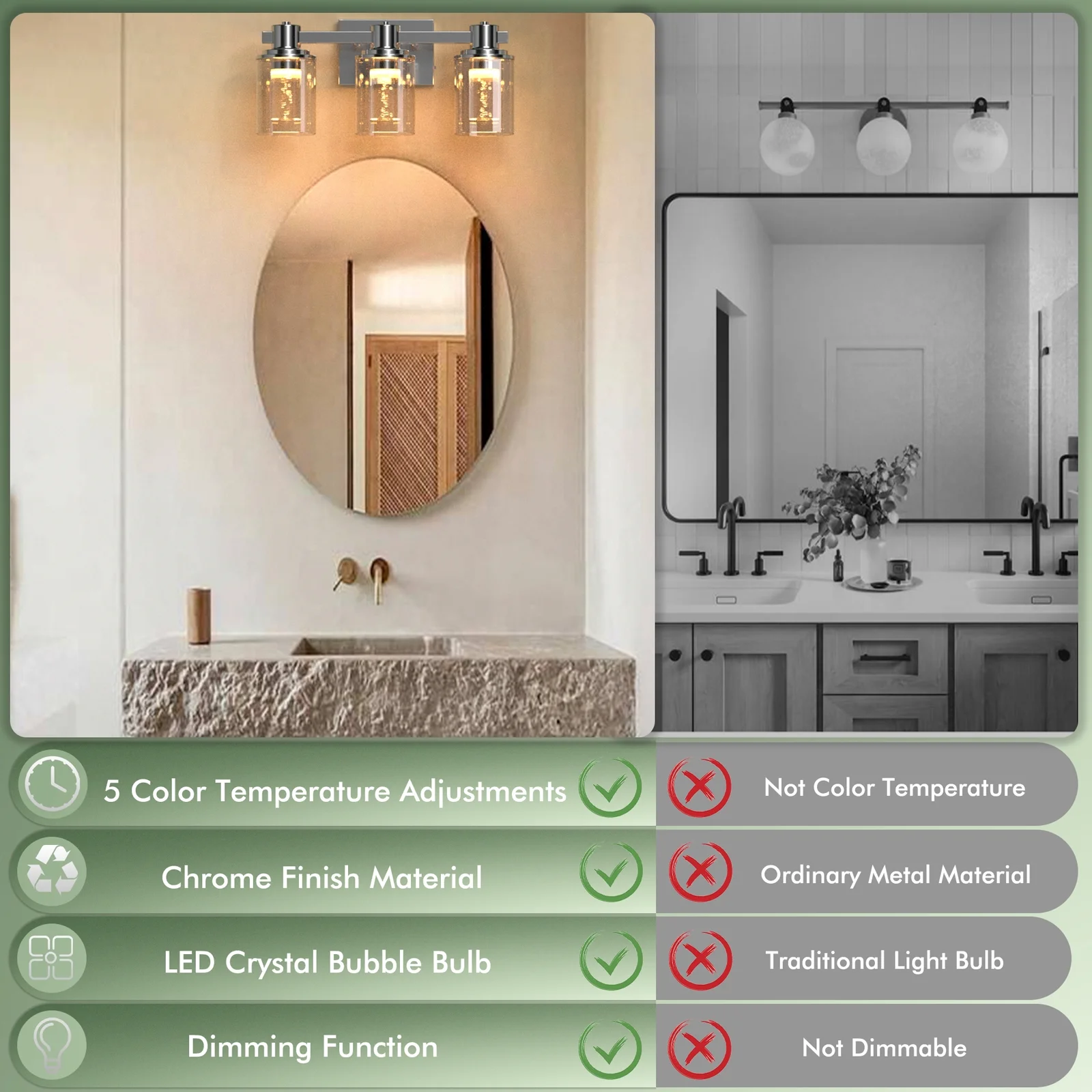 【Exquisite Design Bathroom Vanity Light】- This 3-head bathroom light Illuminate your bathroom with a touch of luxury. Our Crystal Bubbles vanity Light combines crystal glass technology with a modern chrome-plated design for a captivating and sophisticated look.perfectly diffusing the light from the LED bulbs.It creates a romantic bubble-like effect, offering a unique visual experience 【5 color temperatures options】- Choose from 5 color temperature options—soft warm white(2700K), warm white(3000K), neutral white(4000K), cool white(5000K), day white(6500K)—with the crystal bubble bathroom wall lights, meeting diverse consumer preferences for various lighting tones. This versatile selection ensures an ideal ambiance tailored to individual tastes, adding a touch of personalization to your space. 【Built to Last&Waterproof Design】- Enjoy This Modern Bathroom Lighting Fixture both style and durability. Crafted with sturdy alloy metals and thick glass, this chrome-plated beauty is not only visually stunning but also waterproof, making it perfect for any bathroom setting. 【Adjustable Brightness LED Vanity Light】- Embrace the efficiency of this 21W LED vanity light that eliminates the need for separate light bulbs, serving as an ideal, energy-conscious replacement for traditional lighting sources.Paired with a dimmer switch, the crystal bubble bathroom vanity light offers an adjustable brightness range from 10% to 100%.⚠️ Please be aware that the dimmer switch is not included and needs to be acquired separately. 【Effortless Customized Lighting Installation】- Quntis Bathroom Vanity Light allows for customized installation,Simplify your renovation process with our user-friendly installation. Whether you’re a DIY enthusiast or rely on professional assistance, our fixtures are designed for easy integration into existing setups. Clear instructions and compatibility with common wiring configurations make the installation process hassle-free, saving you time and effort.