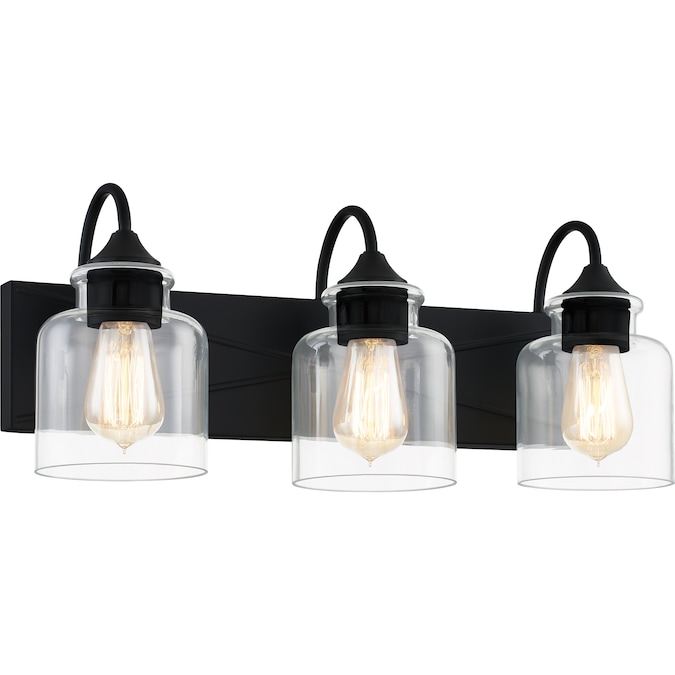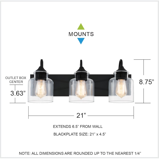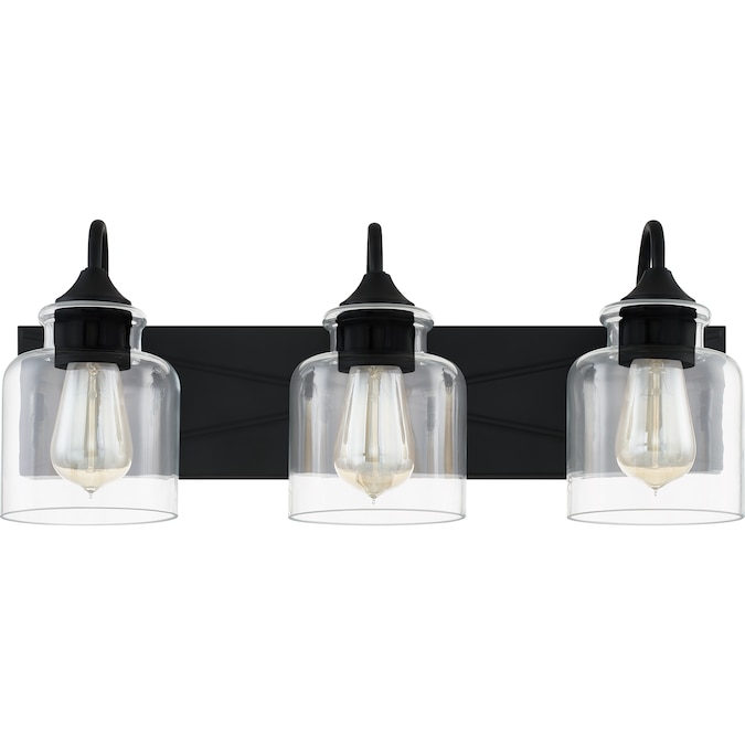 Update your bathroom with the contemporary feel of the barrow 3-light vanity fixture. The simple silhouette is finished in a classic matte black for an understated, yet refined look that can easily blend in contemporary, farmhouse, transitional or rustic styling. The clear glass shades are held in place by sturdy sloped arms that extend from the backplate and allow for a wide area of illumination. The fixture can be installed with shades facing up or down depending on the desired look.