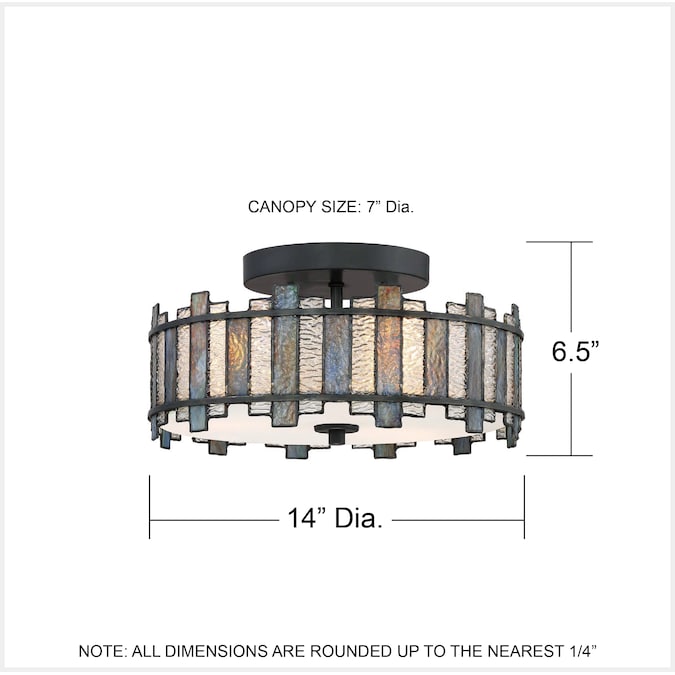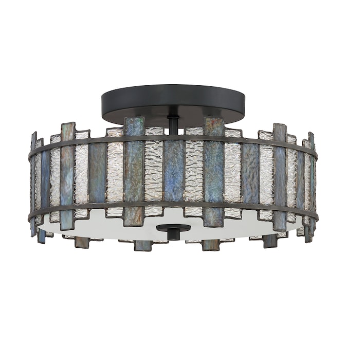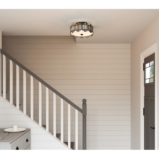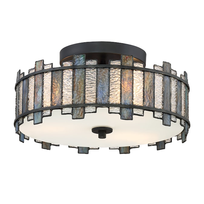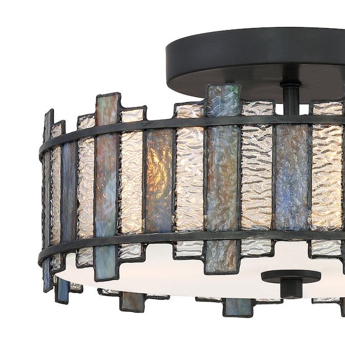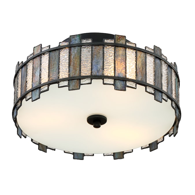 Tiffany-style encompasses a wide range of design from traditional to contemporary. The sentry flush mount is features rectangular glass in various hues banded together in a staggered pattern. The rich black finish enhances the color variations in the glass.