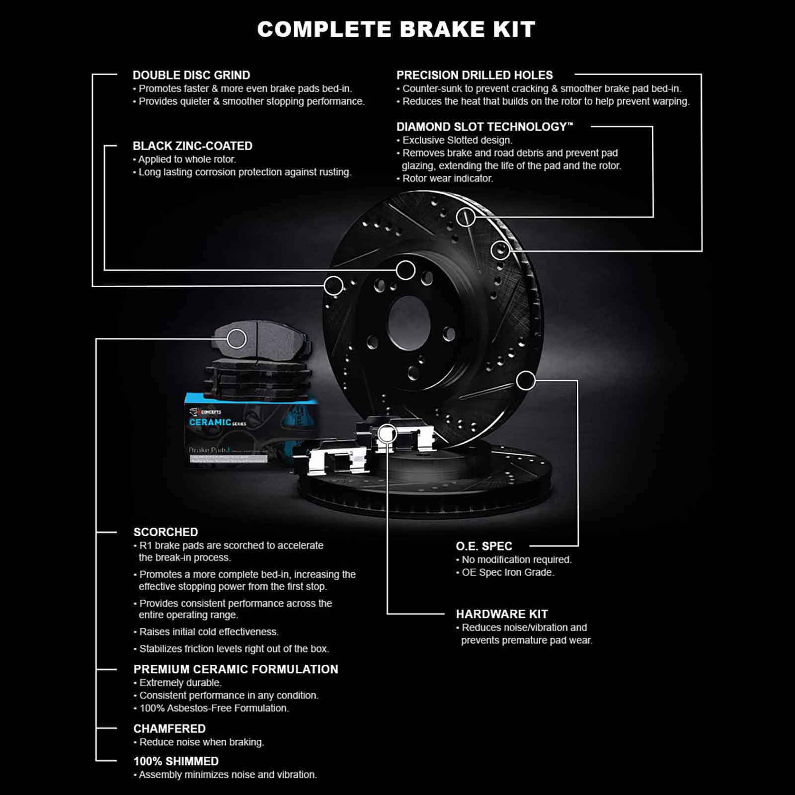 All-in-One Complete Brake Kit Replacement: R1 Concepts Carbon Series Brake Kit comes with (2) high performance brake rotors (4) performance brake pads and hardware High Performance Brake Rotors: Made of G3000 grade cast iron with zinc finish for ultimate rust protection. Built with O.E.M specifications in mind, no modification required. Ultimate Stopping Power: Precision-drilled holes and countersunk design prevents cracking and build up, enhances ventilation and dissipates heat. Designed for smoother and quieter stopping, built for longer lasting, consistent braking performance. Low Dust & Noise: Brake pads come with shims to eliminate noise. Low dust, asbestos free special Ceramic formulation provides excellent fade resistance. Top choice for front and rear brake pads replacement. Fits Select: 1998-2002 CHEVROLET CAMARO 1998-2002 PONTIAC FIREBIRD and more – add your vehicle to our fit widget to check
