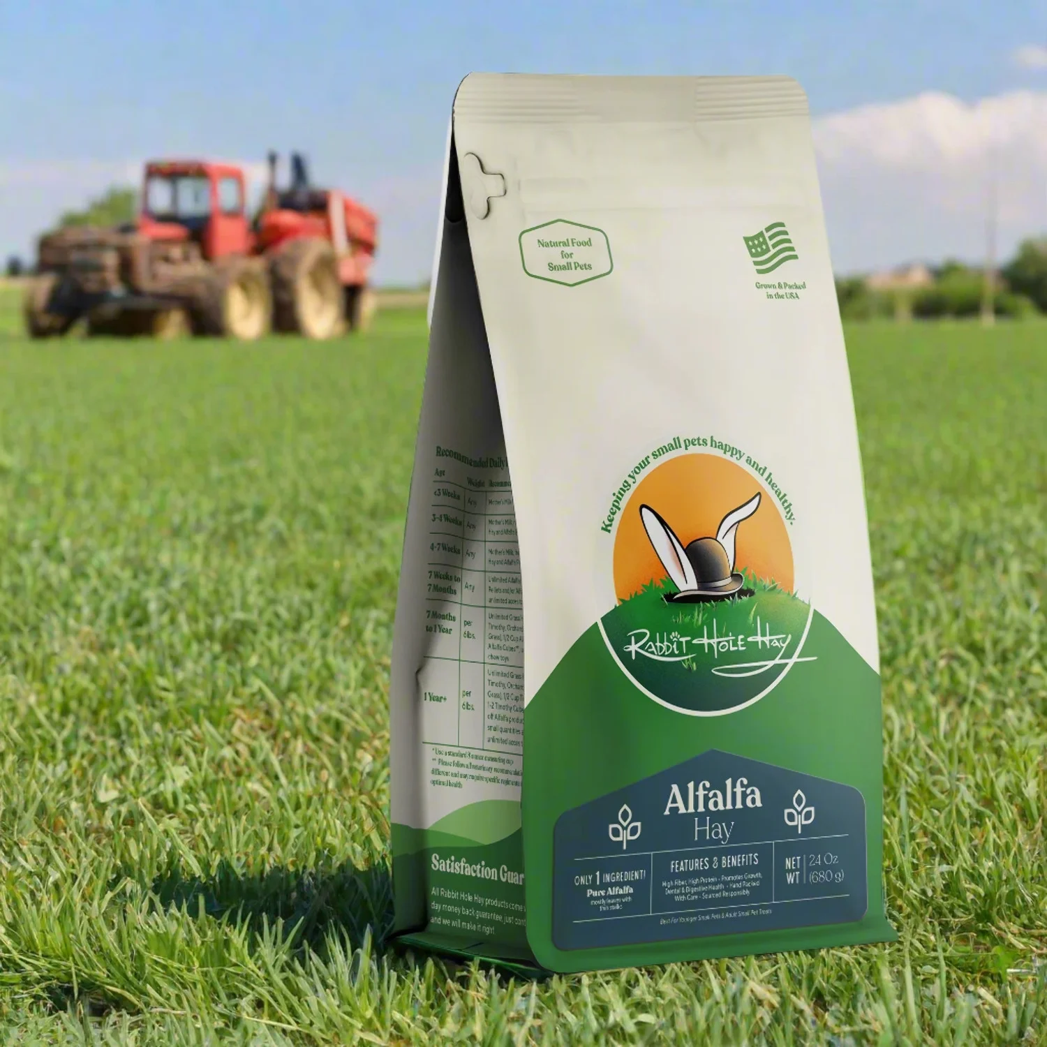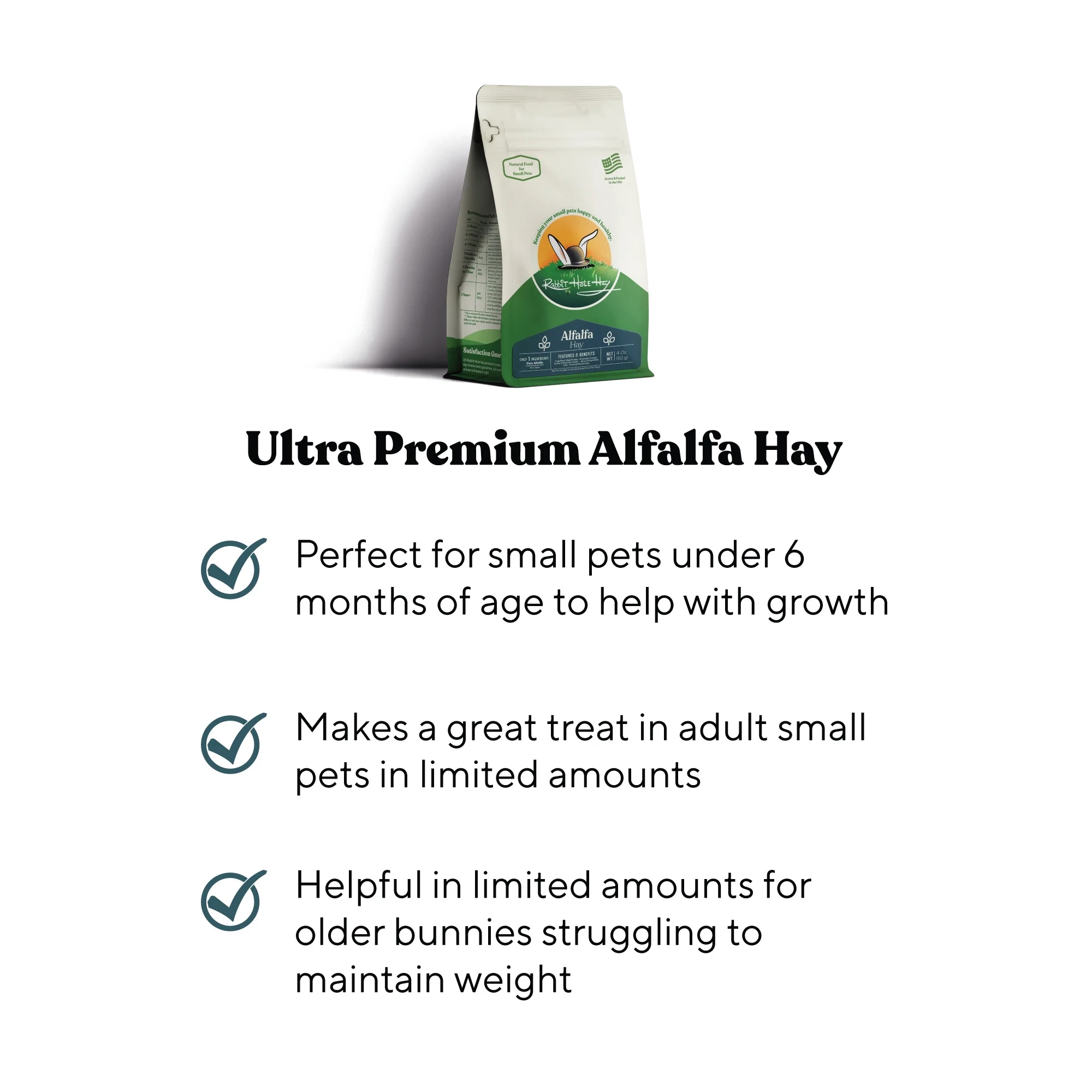 What is Ultra Premium Alfalfa Hay? Alfalfa Hay has a thicker stem and lots of elliptical leaves compared to the long thin leaves found on grass hays. The leaves run all along the thick and pliable stock. While it’s commonly referred to as Alfalfa Hay, it’s actually a legume (beanstalk). Full of protein and nutrients, it’s perfect for growing rabbits between the ages of 3 weeks and 7 months. The 2022 Ultra Premium Alfalfa Hay we have in stock is currently a 9/10. This year’s Alfalfa Hay is a near-perfect example of what Alfalfa Hay should be. example of what Alfalfa Hay should be. Click to read the full Alfalfa Hay Report. At Rabbit Hole Hay, we are monitoring the RHDV2 virus closely and at this time it has NOT affected our area of the country (Northern California). While all our hay is now from the 2021/2022 growing season from Northern California, there have been NO reported cases affecting the area of the country where we source our hay. Click here to read more about what we are doing to ensure the safety of your small pet. Mature rabbits can only eat a limited amount of Alfalfa due to the high levels of protein and calcium. Transition your 7 month old rabbit off of Alfalfa Hay and onto a grass hay (such as Timothy or Orchard). In limited amounts, Alfalfa Hay still makes a great treat for adult rabbits, guinea pigs, and chinchillas. Fresh Hay – We hand-pack every box so you get fresh, green & fragrant hay with little to no dust. Perfect For Young Pets – promotes growth in young rabbits, guinea pigs & chinchillas The Right Amount Of Fiber – Promotes digestive & dental health High Protein – Promotes the growth of young rabbits, guinea pigs, and chinchillas 100% Satisfaction Guaranteed – We provide the finest hay with industry leading customer service.Importance of Transitioning From Alfalfa Hay Alfalfa Hay is perfect for: Rabbits younger than 7 months Guinea pigs younger than 6 months Chinchillas younger than 1 year Treats for adult rabbits, guinea pigs, and chinchillas It’s crucial that you transition your small pet to a grass hay as soon as they are old enough, otherwise they’ll end up facing major health issues such as obesity, digestion and urinary tract issues, along with an increase risk of bladder stones. Veterinarians recommend that in order to keep a healthy diet, adult rabbits and guinea pigs should have a diet consisting of 80% grass hay and adult chinchillas should have a diet consisting of 75% grass hay. Feeding Your Rabbit Based on Their Age From birth until adulthood, it’s crucial that you feed your rabbit specific hays and other foods based on how old they are. Use the feeding timeline below to help guide you! Birth – 3 weeks: Mother’s Milk 3 – 4 weeks: Mother’s Milk, nibbles of Alfalfa Hay and Pellets 4 – 7 weeks: Mother’s Milk, access to Alfalfa Hay and Pellets 7 weeks – 7 months: Unlimited Pellets and Alfalfa Hay (plus see 12 weeks below) 12 weeks: Introduce vegetables (one at a time, quantities under ½ oz.) Once your rabbit is older than 6 months, start to transition them to a grass hay (such as Timothy or Orchard) and decrease pellets to ½ cup for every 6 pounds of body weight. You can also begin to slowly increase their green vegetables and give treats in moderation. The transitions will help keep your rabbit’s GI tract healthy and avoid obesity. Stop Wasting Time & Money on Bad Hay Tired of wasting ti