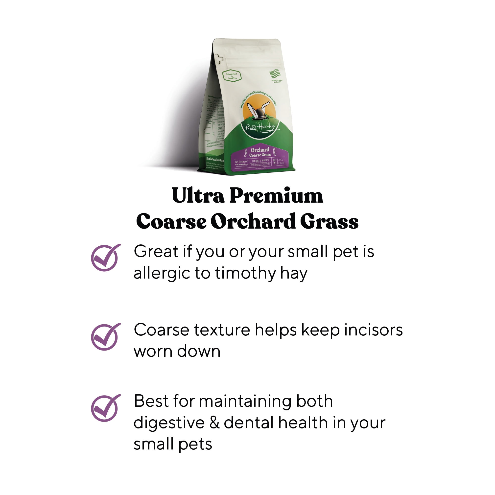 What is Ultra Premium Course Orchard Grass? Coarse Orchard Grass is high in fiber and low in both protein and calcium making it a great choice for dental and digestive health. Coarse Orchard is very similar to Coarse Timothy in texture, making it perfect for those with allergies to Timothy Hay. The 2022 Ultra Premium Coarse Orchard Grass we have in stock is currently a 8/10. This year’s Coarse Orchard Grass is an okay example of what Coarse Orchard Grass should be. The only reason it doesn’t receive a 10/10 is because, like last year, it’s on the softer side. Click here to read the full Coarse Orchard Grass Report. At Rabbit Hole Hay, we are monitoring the RHDV2 virus closely and at this time it has NOT affected our area of the country (Northern California). While all our hay is now from the 2022 growing season from Northern California, there have been NO reported cases affecting the area of the country where we source our hay. Click here to read more about what we are doing to ensure the safety of your small pet. Coarse Orchard Grass provides a strong balance of roughage and nutrition for rabbits, guinea pigs, and chinchillas. Its larger seed heads, leaves, and stems make it coarser providing long strands that promote natural chewing behavior. It’s an important staple of your rabbit’s diet because it helps wear down their teeth. The long strand fibers also helps to keep your rabbit’s digestion regular and functioning properly. Fresh Hay – We hand-pack every box so you get fresh, green & fragrant hay with little to no dust. Allergy Friendly – Coarse Orchard is a good substitute to Timothy Hay as it still holds all the key nutrients along with having the coarse texture needed to promote dental health. High Fiber & Low Protein- Promotes digestive health Perfect For Small Pets – Keep your rabbits, guinea pigs, and chinchillas happy & healthy. 100% Satisfaction Guaranteed – We provide the finest hay with industry leading customer service.Allergic to Timothy Hay? Allergies, especially to Timothy Hay are common (you aren’t alone!). Coarse Orchard Grass can be a wonderful alternative for you and your small pet while still giving them all the important nutrients they need. In our experience, people who are allergic to Timothy Hay are less allergic to our Coarse Orchard Grass. While many veterinarians recommend Timothy Hay as the best type of hay, Orchard Grass is a good substitute if you or your small pet have issues with Timothy Hay. We are dedicated to making sure your pets are happy, healthy, and well fed even when allergies are an issue.Why Hay is Essential to Their Diet Grass hay is an important staple in the diet of rabbits, guinea pigs and chinchillas. For rabbits 7 months and older and guinea pigs 6 months and older, grass hay should make up 80% of their diet. For chinchillas older than a year, grass hay should make up 75% of their diet. The constant foraging and grazing encouraged by hay helps to keep them physically active and mentally stimulated. It also helps to wear down their teeth while the long strand fiber helps to keep their digestion regular and functioning properly.Stop Wasting Time & Money on Bad Hay Tired of wasting time picking through bad hay just to find the bits your rabbit, guinea pig, or chinchilla will actually eat? We visually inspect and hand-pack every package of hay to ensure that you get fresh, green, fragrant hay of the highest quality. Your hay is always hand-processed, never machine-cut, creating nice long strands and less small pieces. You’ll n