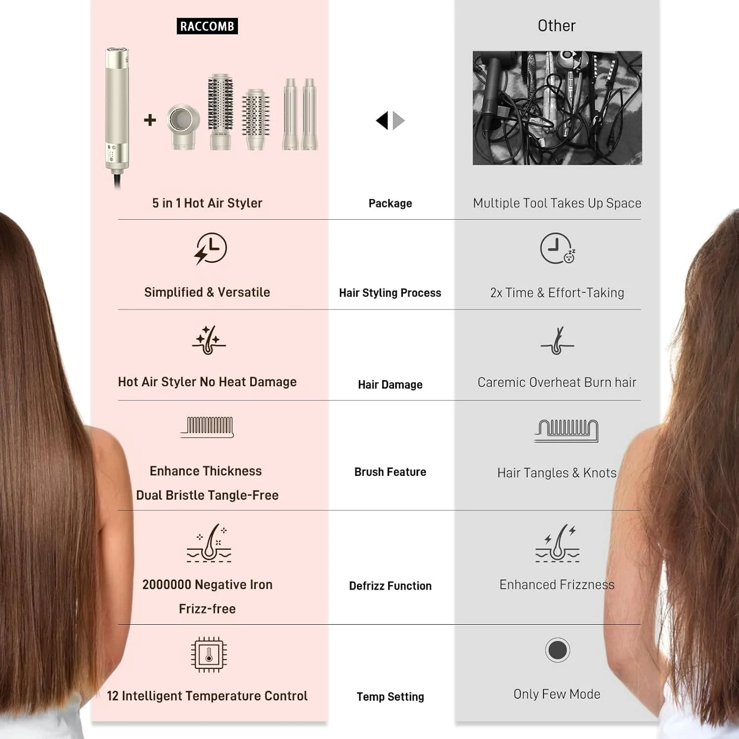 RACCOMB 5-in-1 Hot Air Styler, Hair Dryer & Styler with Negative Ion Technology, Frizz-Free Hair Styler Tool for Curling, Volumizing, Smoothing, No Heat Damage
