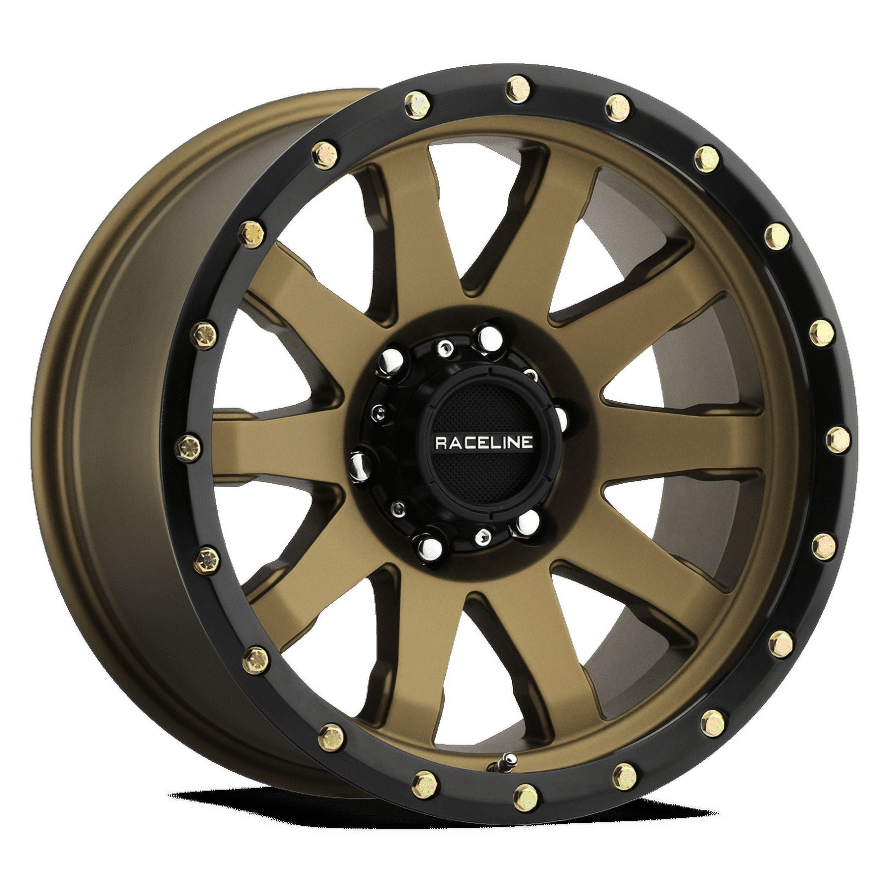 Raceline 934BZ-CLUTCH 17″ Cast Aluminum Wheel, CLUTCH BRONZE 17X9 8X165.1 -12mm Aggressive concave 10 spoke design Simulated beadlock lip with stainless steel bolts Bolt on cap with contrasting embossed Raceline logo (5/6 lug applications have covered cap while 8 lug are exposed)