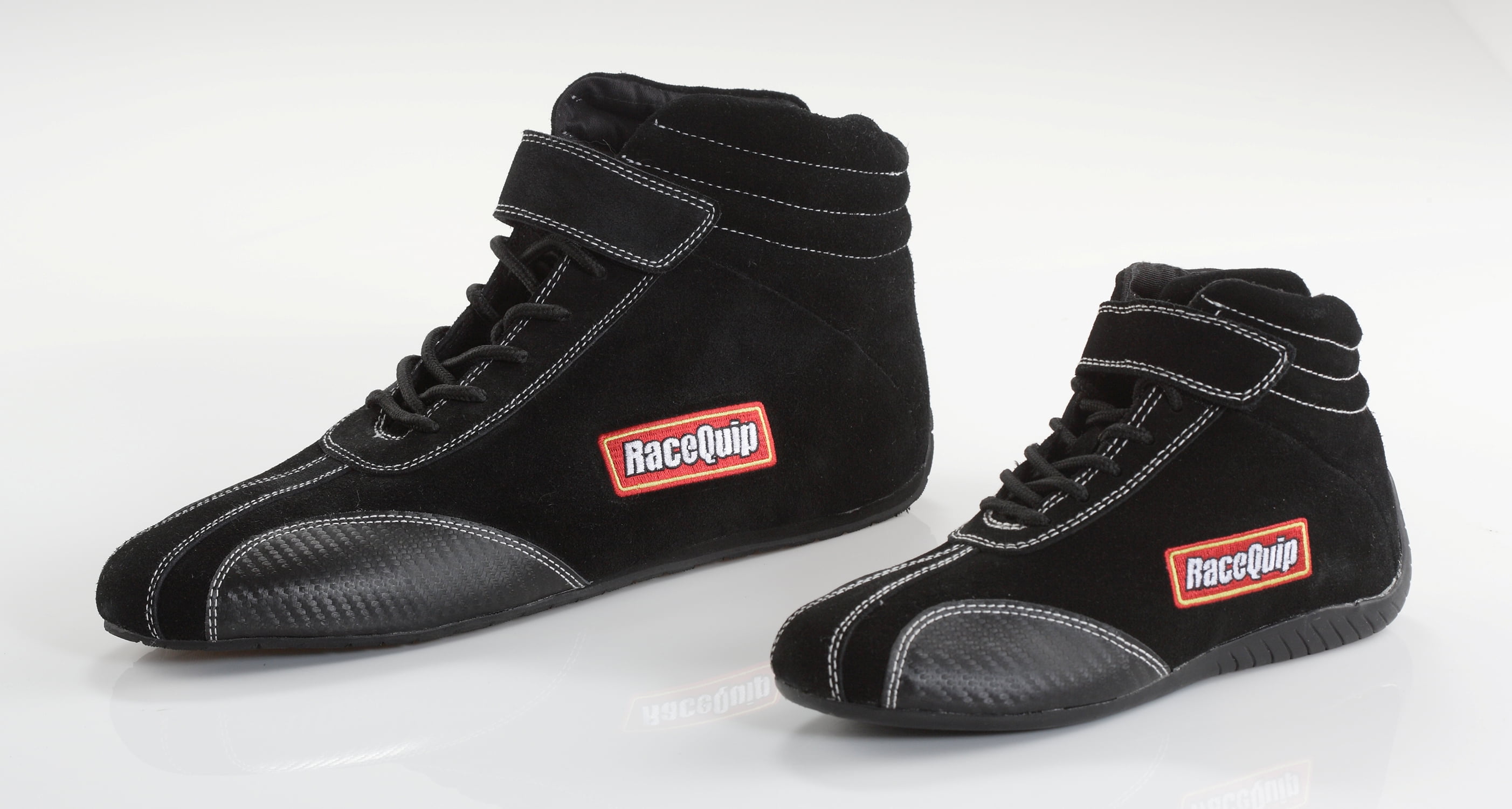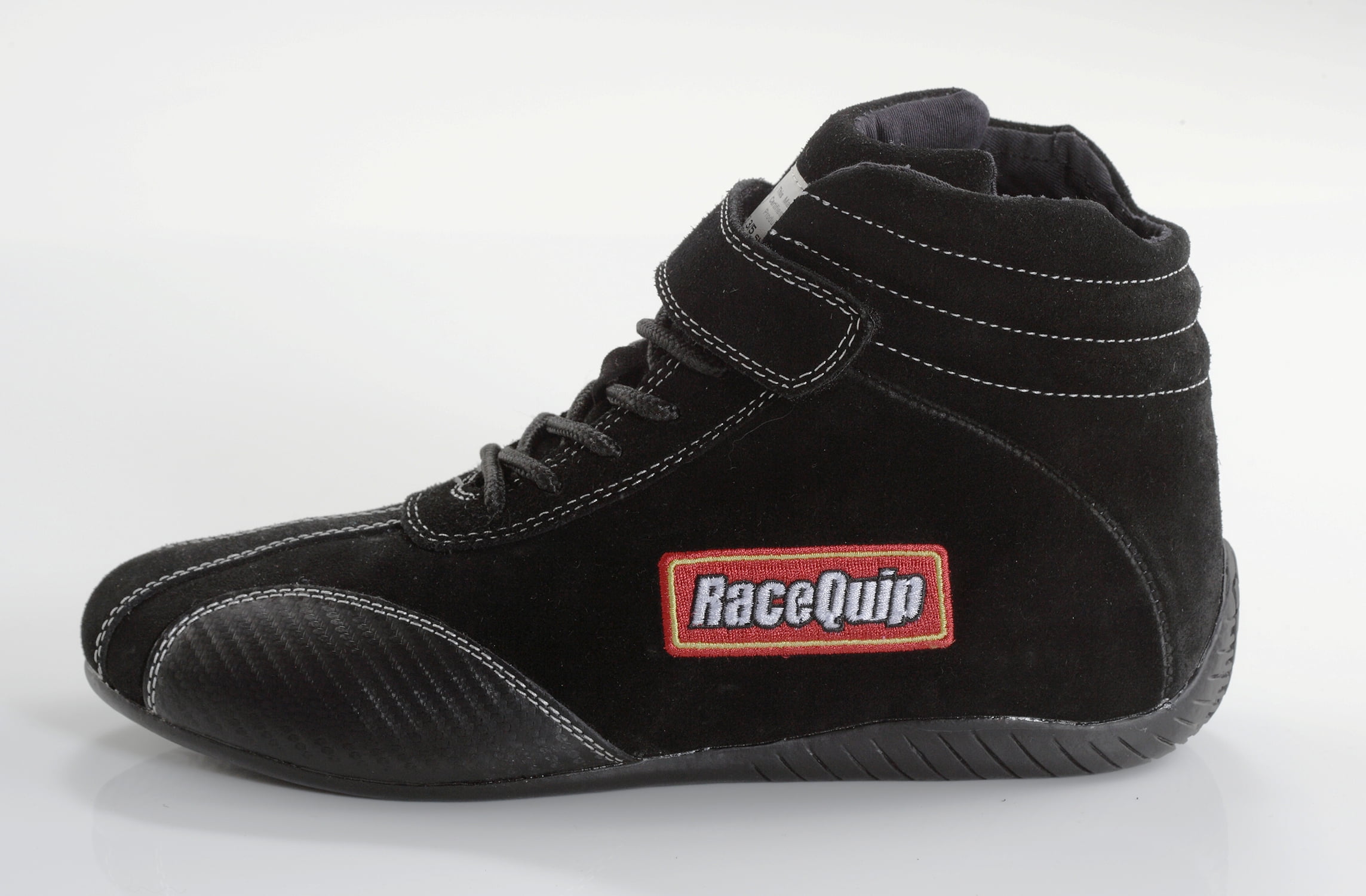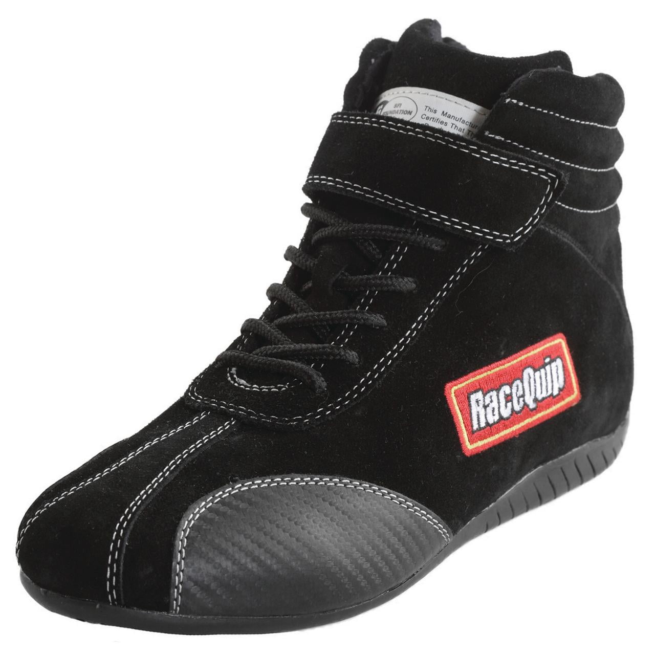 Mid-Top Style. Suede Outer – Fire Retardant Cotton Inner; The RaceQuip® Euro Ankletop racing shoe has all the features you’d expect to find in a shoe costing much more. This new lightweight flexible design incorporates durable construction features like a reinforced lace area and double-stitched seams. The high traction molded rubber sole rolls up the back of the shoe to provide extra support for your heel while driving. We’ve added Carbon-L wear pads on both sides of the toe for added protection and durability in the high heat/high wear areas. These shoes feature a soft suede leather outer layer that uses contrasting stitching and European styling to give the shoe a unique look. The liner is constructed of flame retardant Pyrovatex® and has additional padding at the ankles plus built-in arch supports. The design also utilizes our unique Achilles flex opening in the back to allow easy foot extension. The RaceQuip® Euro shoe weighs in about 30% less than a standard racing shoe. The design of this shoe perfectly blends light weight, durability, comfort and pedal feel. Meets or exceeds SFI 3.3/5 rating.;