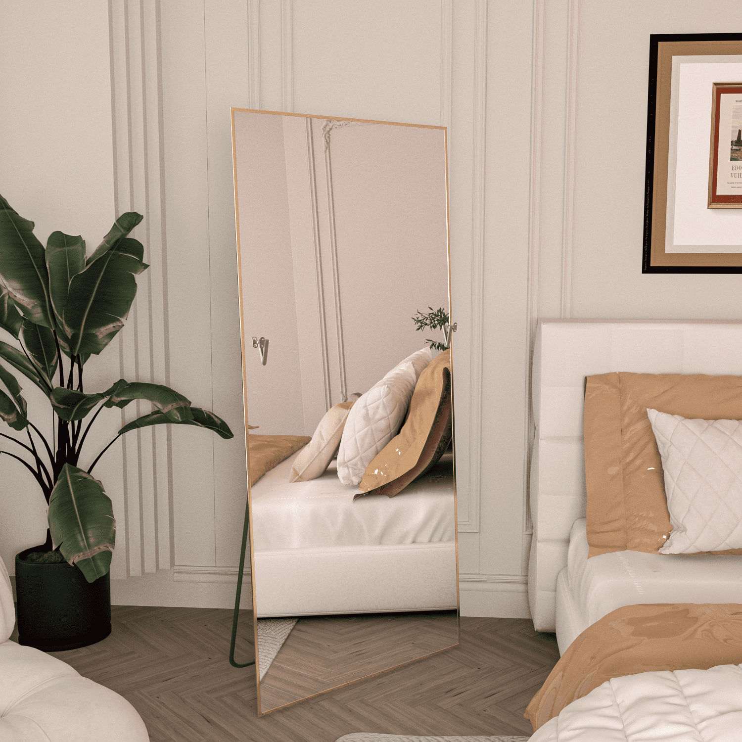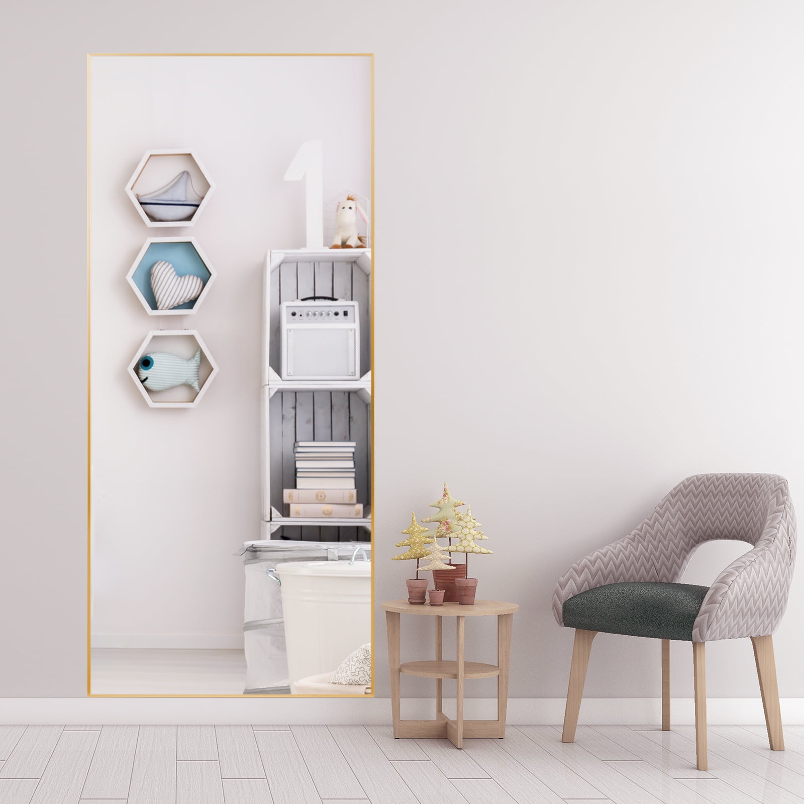 RACHMADES 64’’ x 21’’ Gold Modern Full Length Floor Mirror 64″ x 21″ large full-size length mirror allows you to see your entire body Features an aluminum alloy frame with explosion-proof film, providing a unique and upscale look that enhances your room’s aesthetic Made with scatter-proof and shatter-proof glass for added safety; fragments remain contained if broken Can be leaned against a wall or stand freely; perfect for various occasions such as Thanksgiving, Mother’s Day, and housewarming Each mirror undergoes strict quality inspection to ensure safe delivery; contact us for any damage upon receipt