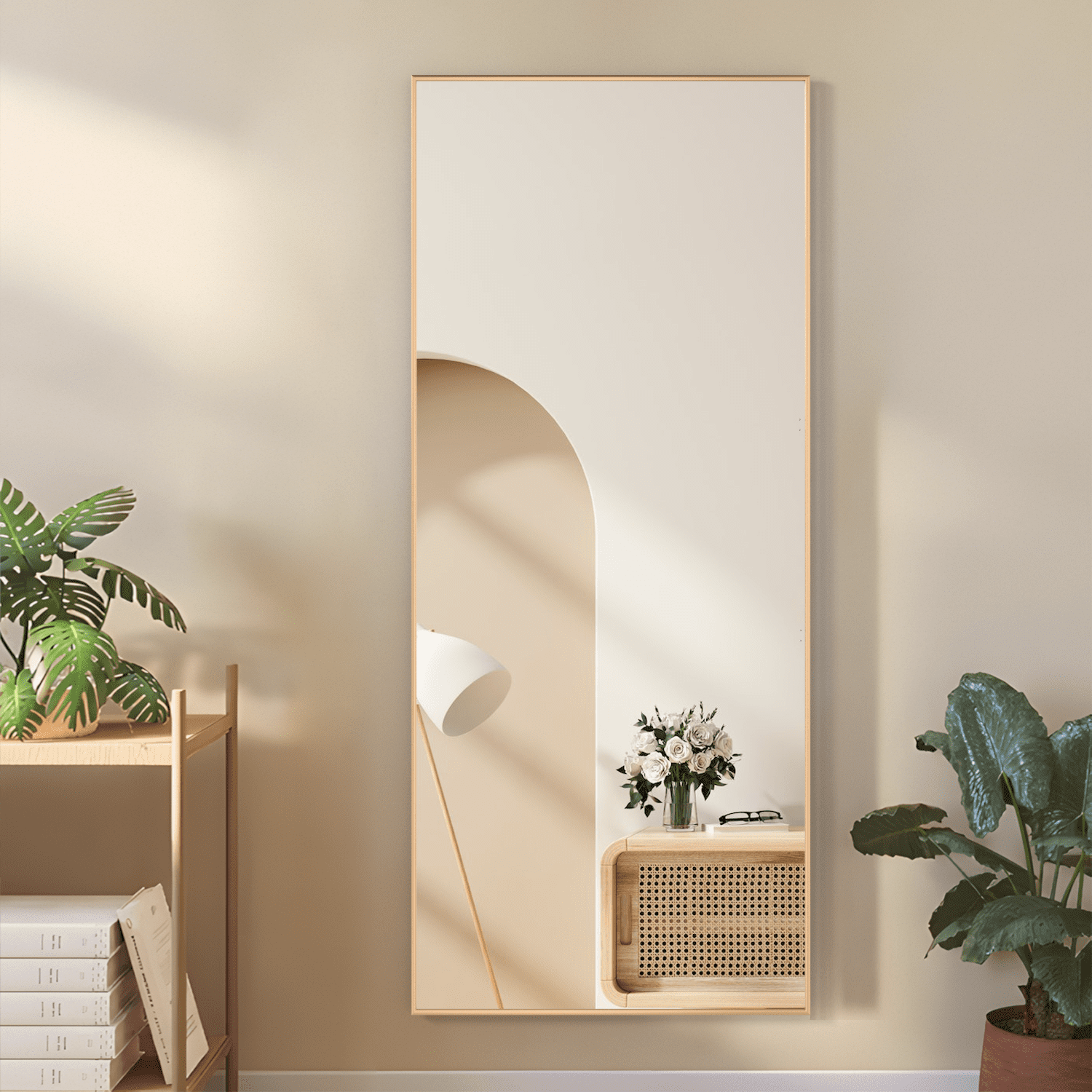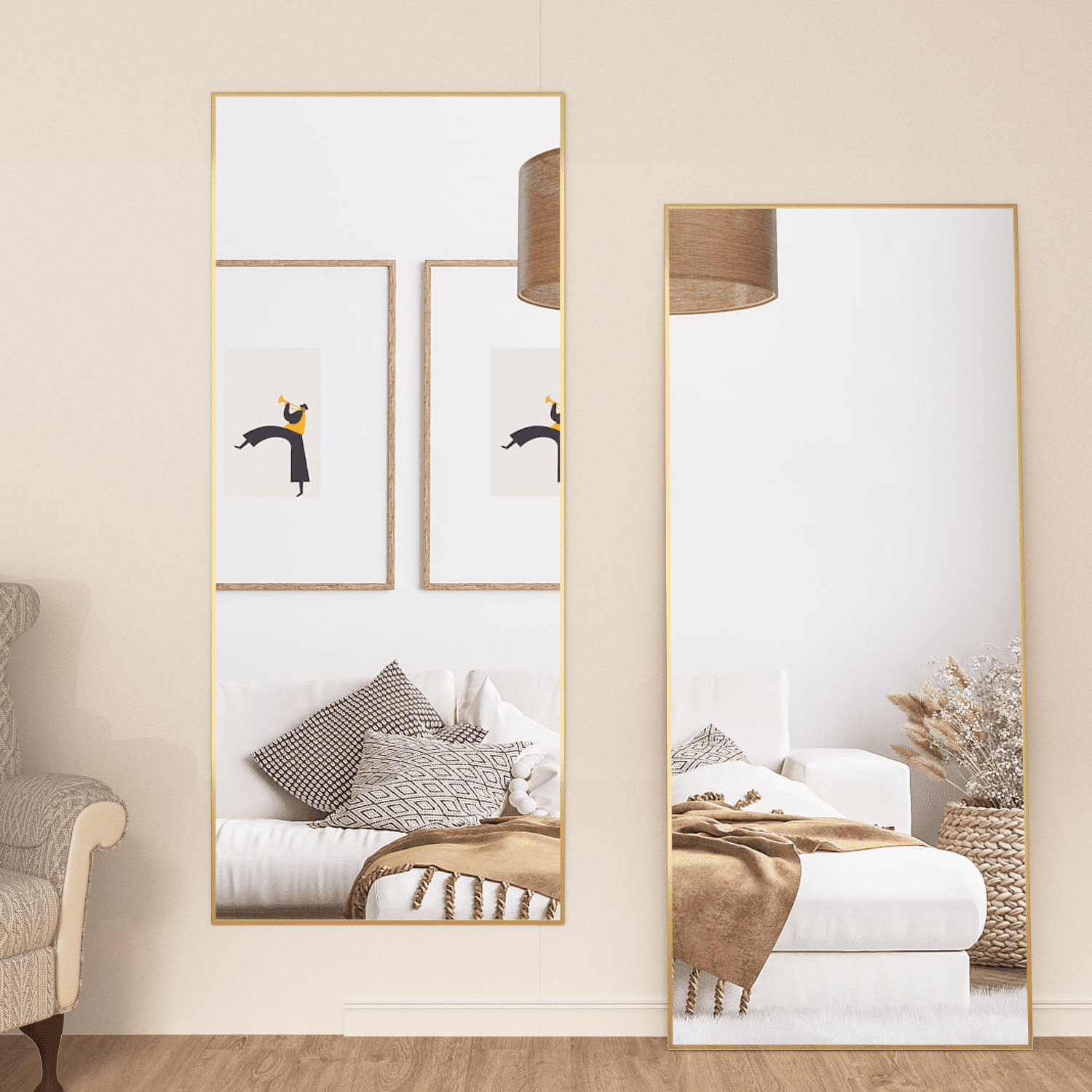 Gold Aluminum Alloy Framed Rectangle Floor Mirror This full body mirror is suitable for everyone you care about. A best gift idea for your mom, wife, partner, daughter and friend. Pacakage including a full body mirror, Mirror installation parts and instructions The 65″x24″ full length mirror can freestanding anywhere, leaning against the wall and wall-mounted, its high definition mirror surface can reflect distinct, lifelike and real image, there is no distortion. High Craftsmanship — Modern floor mirrors are made of high-quality materials, fashionable and advanced, sturdy and durable. Large wall mounted long mirrors with two installation methods add artistic and modern style to the home Shatterproof Glass — Safety explosion-proof glass. Wave mirrors are the perfect complement to bedrooms, hair salons, clothing stores, fitting rooms, cloakrooms, living rooms, and entrances High-definition Imaging — HD silver mirror glass allowing for a clear reflection without any distortion. Ultra-high texture, restore 1:1 real image, no chromatic aberration, no distortion, no deformation Color difference under different lighting conditions Widely used in Cloakroom mirrors, bedroom independent mirrors, living room standing mirrors, restaurant wall mounted mirrors, cloakroom floor mounted mirrors, home gym wide body mirrors, entrance full height mirrors, floor mounted mirrors, etc Full-length mirrors are perfect for birthday gifts, Christmas gifts, or other holiday gifts!
