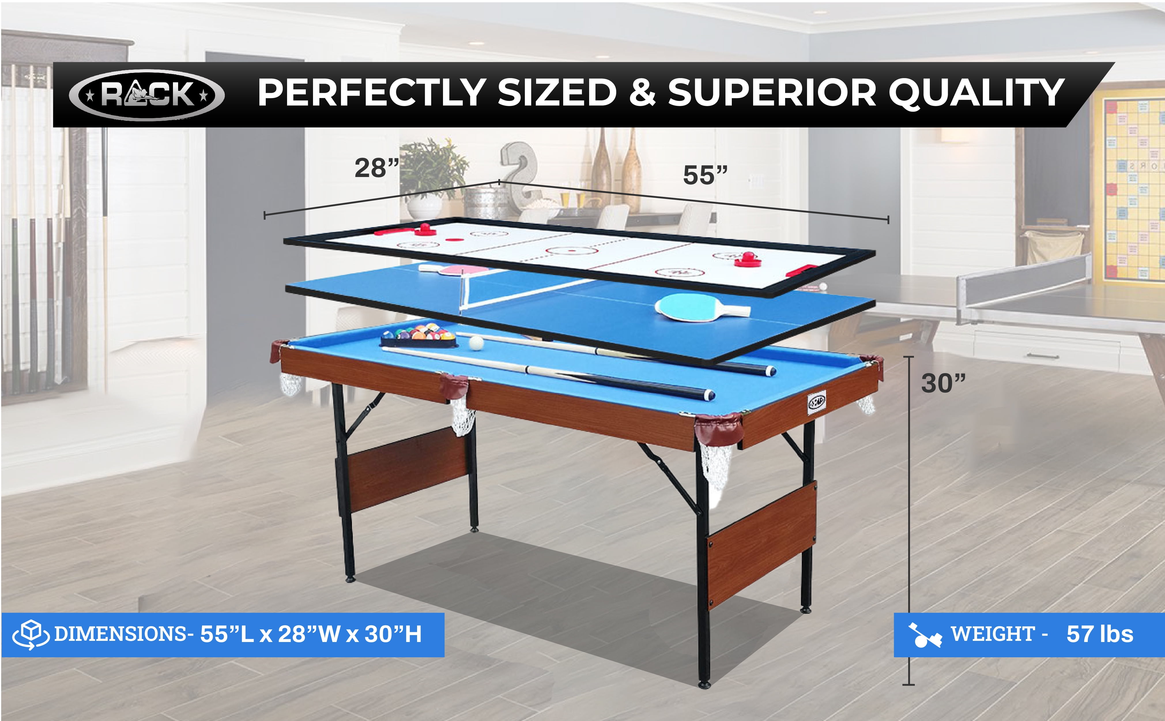 Table Dimensions: 55″ L X 28″ W X 30″ H Table Weight: 57 lbs. 1/2″ MDF Bed with Blue Regulation Grade Velvet Felt Cotton Net Ball Pockets 1″ Leg Levelers to ensure flat surface. Includes 2x 48″ Billiard Cues Includes a set of Billiard Balls (16x 1.5″ resin billiard balls) Includes 2x Pool Cue Chalk, Authentic Triangle Rack and Premium Brush 2-Upgraded Table Tennis Rackets/Paddles with 3 Balls, Net & Post 2-Strikers and Puck Color: Blue High Quality indoor Multi Game Table in the RACK Collection