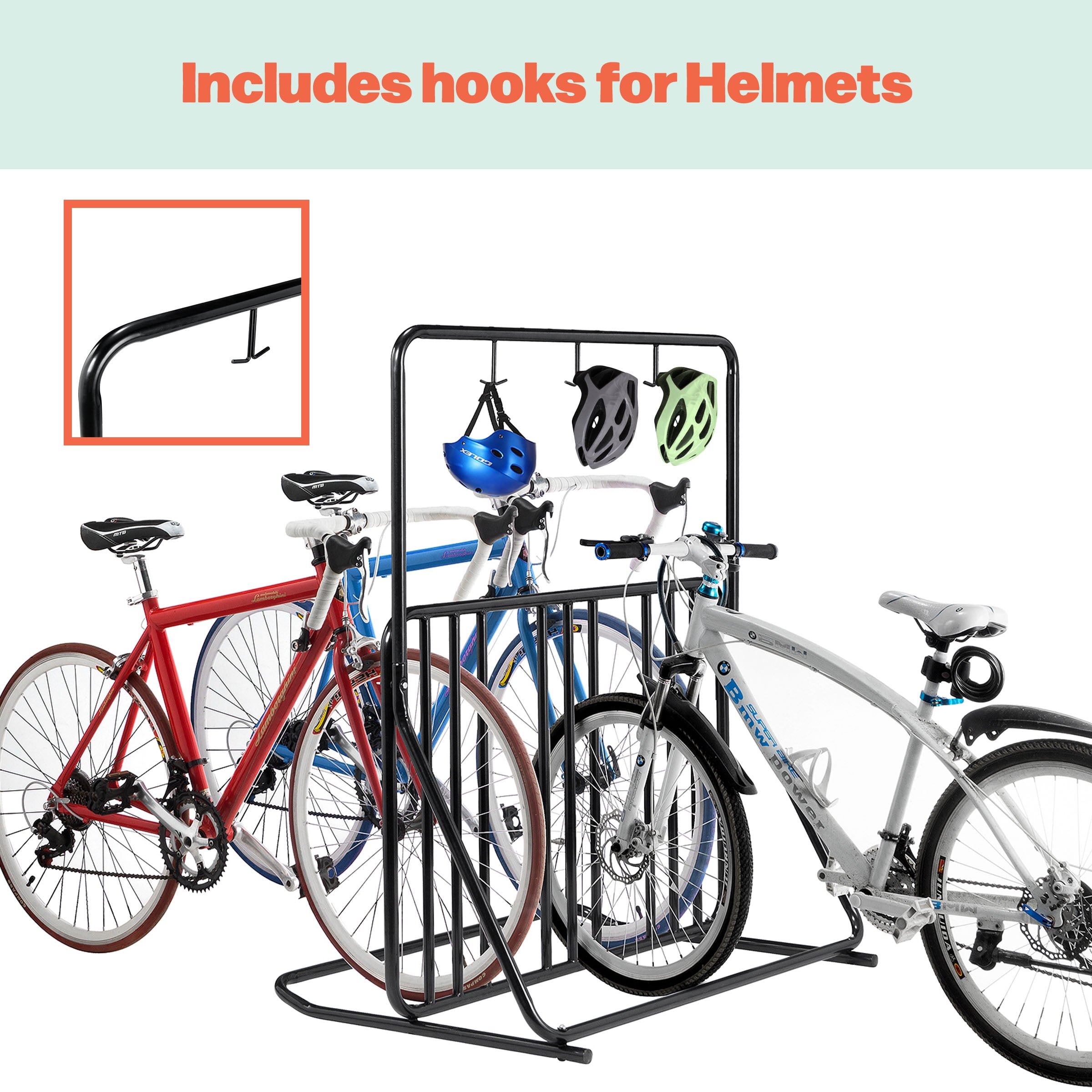 VERTICAL BIKE RACK – Park any mountain, BMX, road, kids’, or beach cruiser bicycle on this 6-place bike storage rack and hang safety helmets from its conveniently placed hooks. FREESTANDING – Simply drive your front tire into the wheel holder of the freestanding bike stand for a sturdy hold and upright parking. 2-SIDED BIKE RACK – The dual-sided bicycle rack offers flexibility in parking for a variety of bike sizes and styles placed next to or opposite each other. DURABLE AND STABLE – Made of durable tubular steel with a black powder-coated finish, this bike storage rack can hold up against outdoor elements and support heavy bicycles. MATERIALS – Powder-Coated Tubular Alloy Steel. DIMENSIONS – (L) 30″ x (W) 25″ x (H) 30″. COLOR – Black.