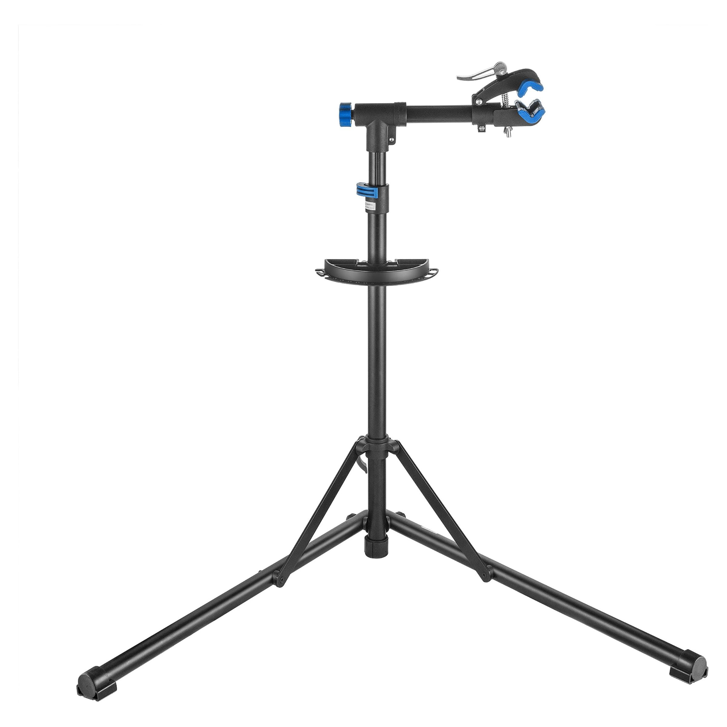 BIKE STAND – Mount your cycle for repairs or maintenance with this adjustable floor bike rack. The specially designed clamps are engineered to hold the frame securely without damaging its finish, and a handy tray keeps tools right where you need them. HEAVY-DUTY – This durable bike floor stand has a maximum capacity of 65lbs/30kg, and the clamps fit standard tube frames from 1-inch to 1.5-inch in diameter. The height is adjustable from 36 to 60-inches-tall. 360-DEGREE ROTATION – This adjustable stand features clamps that are designed to rotate 360-degrees on two axes to position your bicycle exactly where you need it, then simply lock it in place with the twist of a knob. SECURE MOUNTING – The adjustable handlebar rod stabilizes the front wheel for easier repairs, and the feet of this bike repair stand are pre-drilled to give you the option of installing your rack to the floor or a work bench for even more stability. PRODUCT DETAILS – Materials: Steel. Dimensions: (L) 39″ x (W) 26.5″ x (H) 36″ – 60″. Legs fold for easy storage. Includes hex key. Color: Black.