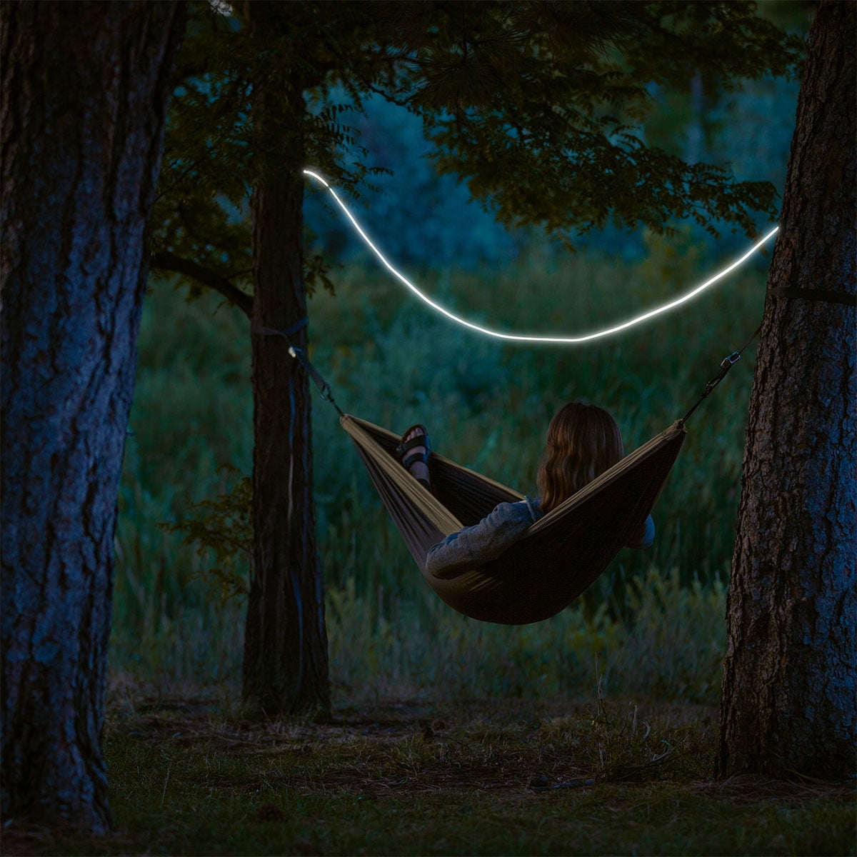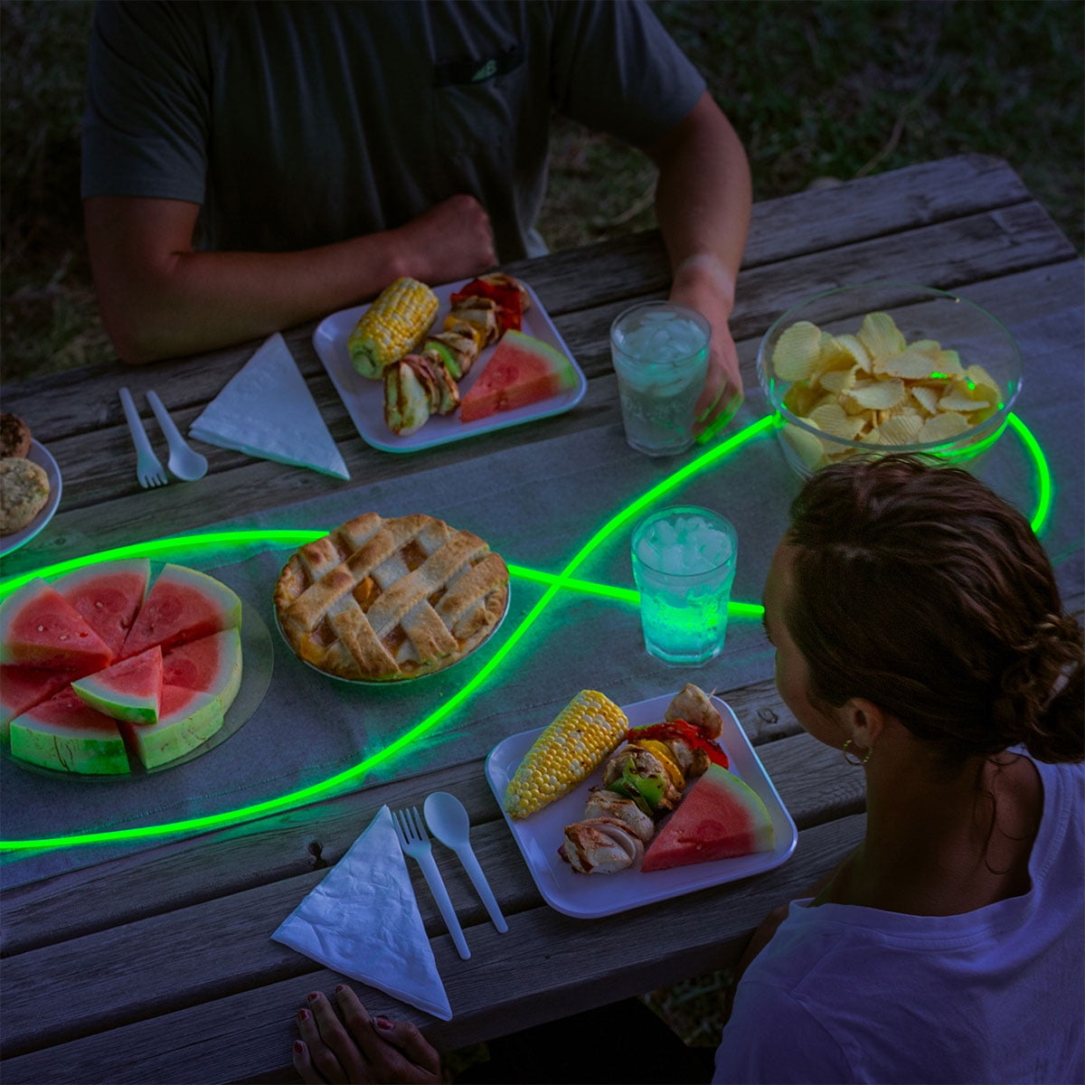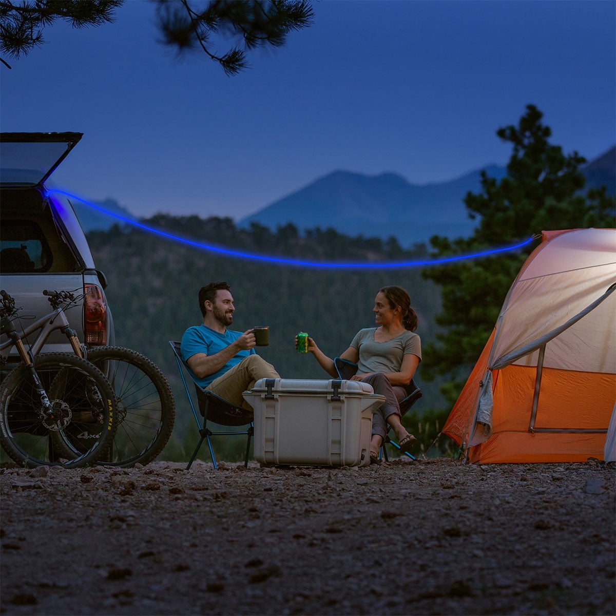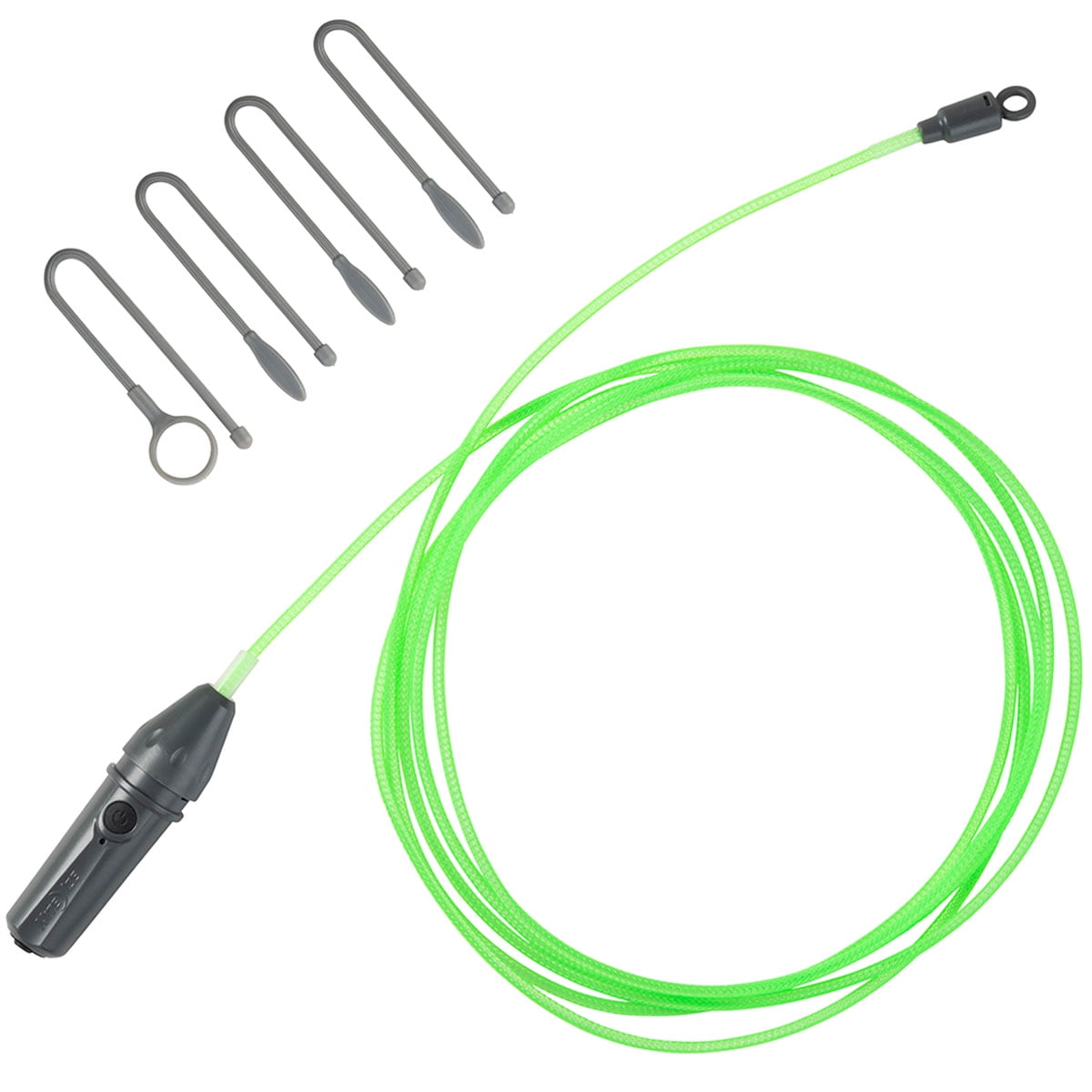 Integrated LED + fiber optic technology provides full-length illumination Includes 4 attached Gear Ties for hanging + securing Powered via built-in rechargeable battery, USB AC or DC power source, or USB battery bank Stays illuminated while charging 10 feet long (3 meters) Flexible design easily forms around corners, bike bars + beyond Water-resistant for indoor + outdoor use