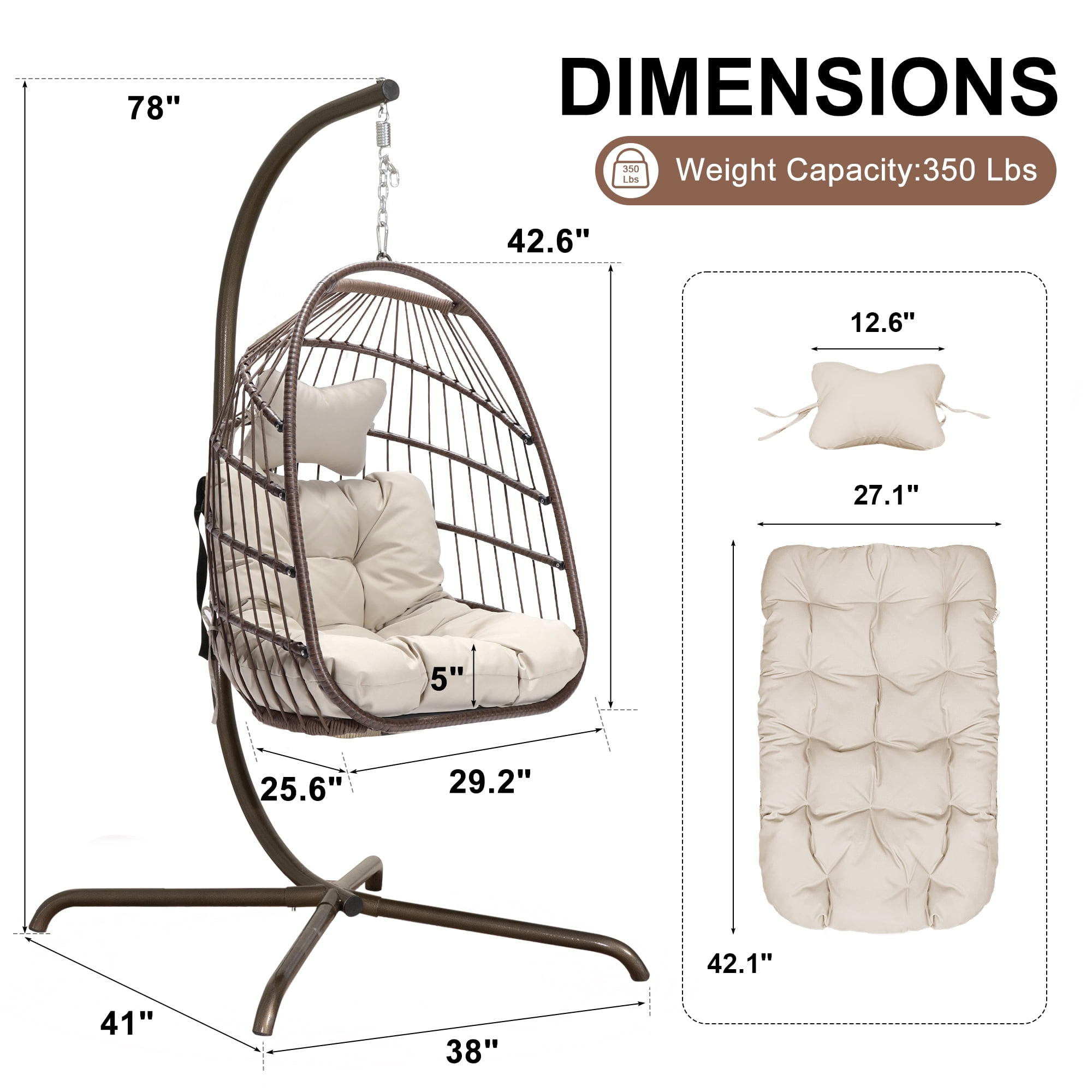 Wicker Egg Chair with Stand – Made from weather-resistant rattan with a powder-coated steel frame for long-lasting outdoor durability. Cushioned Comfort – Features a thick seat cushion and plush headrest for cozy, ergonomic relaxation. Outdoor and Indoor Use – Perfect for bedroom, patio, balcony, porch, sunroom, or garden decor. High Weight Capacity – Supports up to 350 lbs with sturdy frame, nylon rope support, and safety strap. Swinging Egg Chair Design – Gently sways for ultimate comfort and calming motion. Easy Assembly – Includes all tools and parts; foldable basket design makes setup simple and quick. Modern Boho Style – Aesthetic egg shell shape and neutral tones complement all indoor and outdoor styles. Low-Maintenance Materials – Quick-dry polyester cushions resist fading and are easy to clean. Portable and Foldable – Freestanding design is easy to move, fold, and store. All Accessories Included – Comes with rattan basket, cushions, headrest, frame, hardware, and user manual. Overall Hammock Size: W 41″ x D 38″ x H 78″ Thickness of seat and pillow: 5″ Overall Product Weight: 47.74 lb Product Type: Hanging Swing Chair With Stand Frame Material: Steel The material outside the basket: Rattan Woven Metal Frame Color: Black Frame Brown Rattan Basket Cushion And pillow Colour: Beige Weight Capacity: 350 lb Suitable for Location Indoor / Outdoor Use Level of Assembly: Partial Assembly Needed Adult Assembly Required: Yes Suggested of People: 1 Additional Tools Required: Need to install, all tools included 1 x Hammock Chair(With 1 Headrest Pillow, 1 Seat Cushion) 1 x Stand 1 x Accessories Bag 1 x Manual Durable & Weather-Resistant Construction The RADIATA hanging egg chair features a sturdy polyethylene rattan seat and powder-coated iron frame for long-lasting outdoor and indoor use. The back is supported with durable nylon rope for added strength and flexibility. Comfortable Cushions & Headrest Includes a thick all-in-one seat cushion and a soft head pillow made from high-quality polyester filled with cotton. Designed for optimal comfort, with tie-downs to keep cushions securely in place. Easy to clean and quick-dry in the sun. Portable & Easy to Assemble The foldable chair and detachable stand design make it easy to move or store. Comes with all necessary tools and accessories—basket, cushions, headrest, safety strap, and stand—all packed in one box for quick and hassle-free setup. Stylish Indoor & Outdoor Use Perfect for both indoor and outdoor settings—use it in your patio, backyard, garden, balcony, bedroom, sunroom, or porch. This egg swing chair adds a cozy and modern boho touch to any space. Heavy Duty with High Weight Capacity With overall dimensions of 41”x38”x78” and a seat size of 29.2″x25.6″x42.5″, this chair is built to support up to 350 lbs. The coated steel frame and weather-resistant wicker ensure durability, while the safety strap offers added peace of mind.