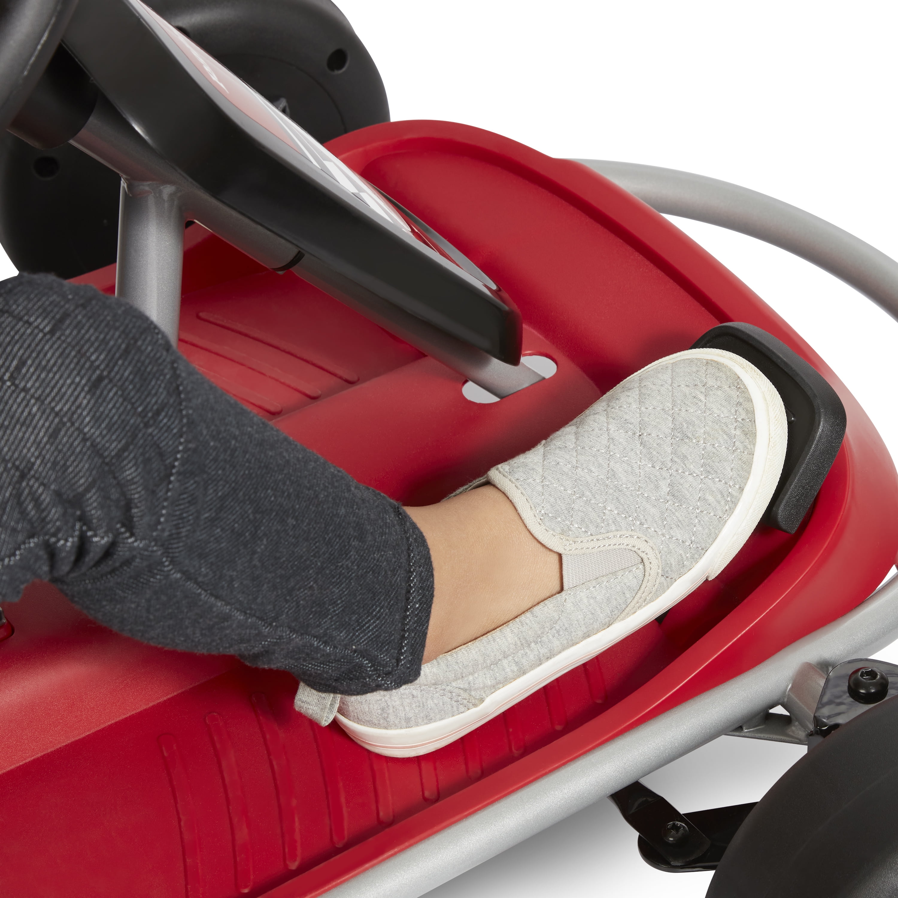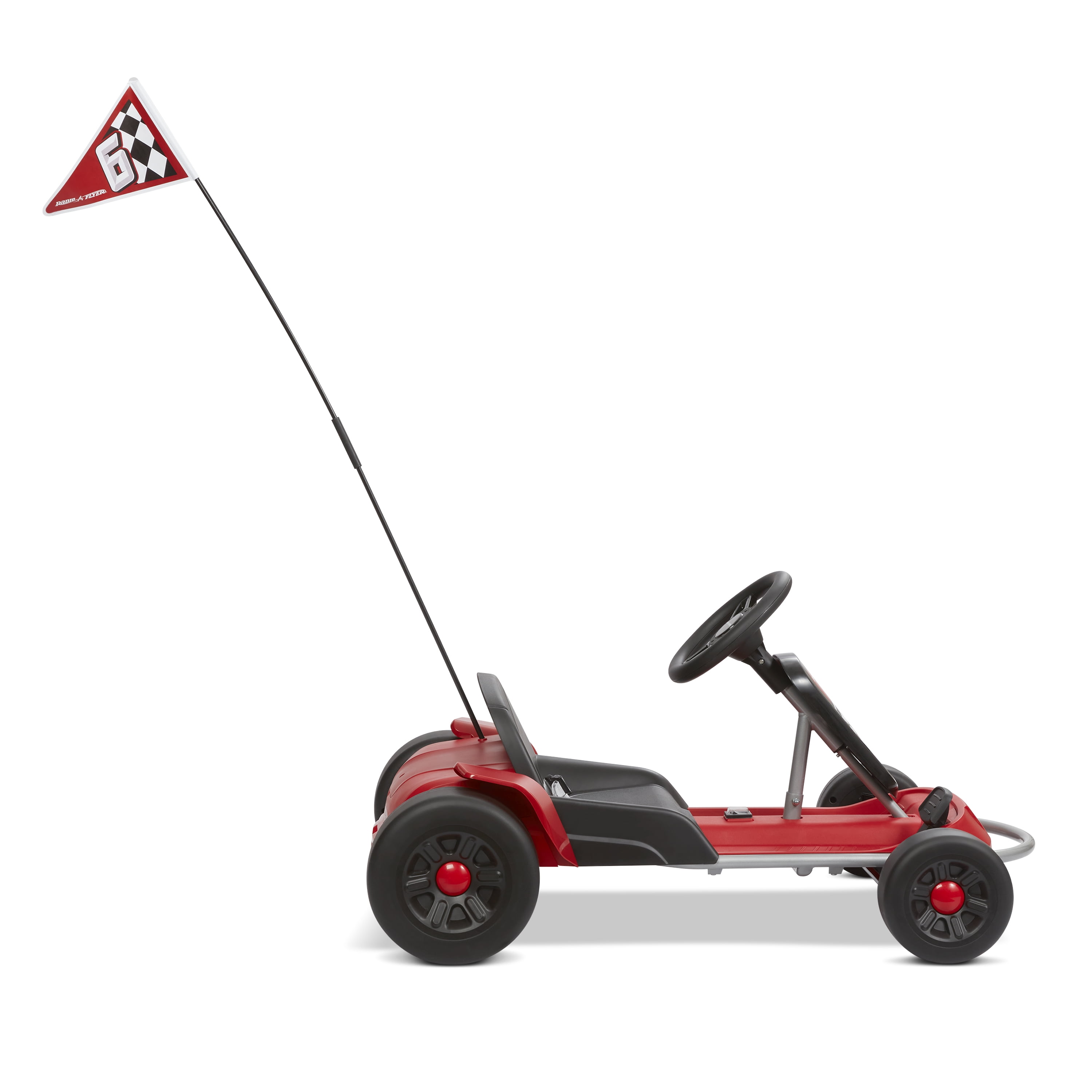 Two forward-driving speed settings: 2.5 and 5 MPH. Single speed reverse Seat belt for added safety High-visibility racing flag to keep your child visible while riding EZ charging port with debris cover Sturdy steel frame 12 V unisex go-kart for all kids to enjoy! For ages 3 – 7 years old Maximum weight capacity 69 lbs. If you have any questions regarding your product please contact Radio Flyer Customer Service at 1 (800) 621-7613 or email us at [email protected].