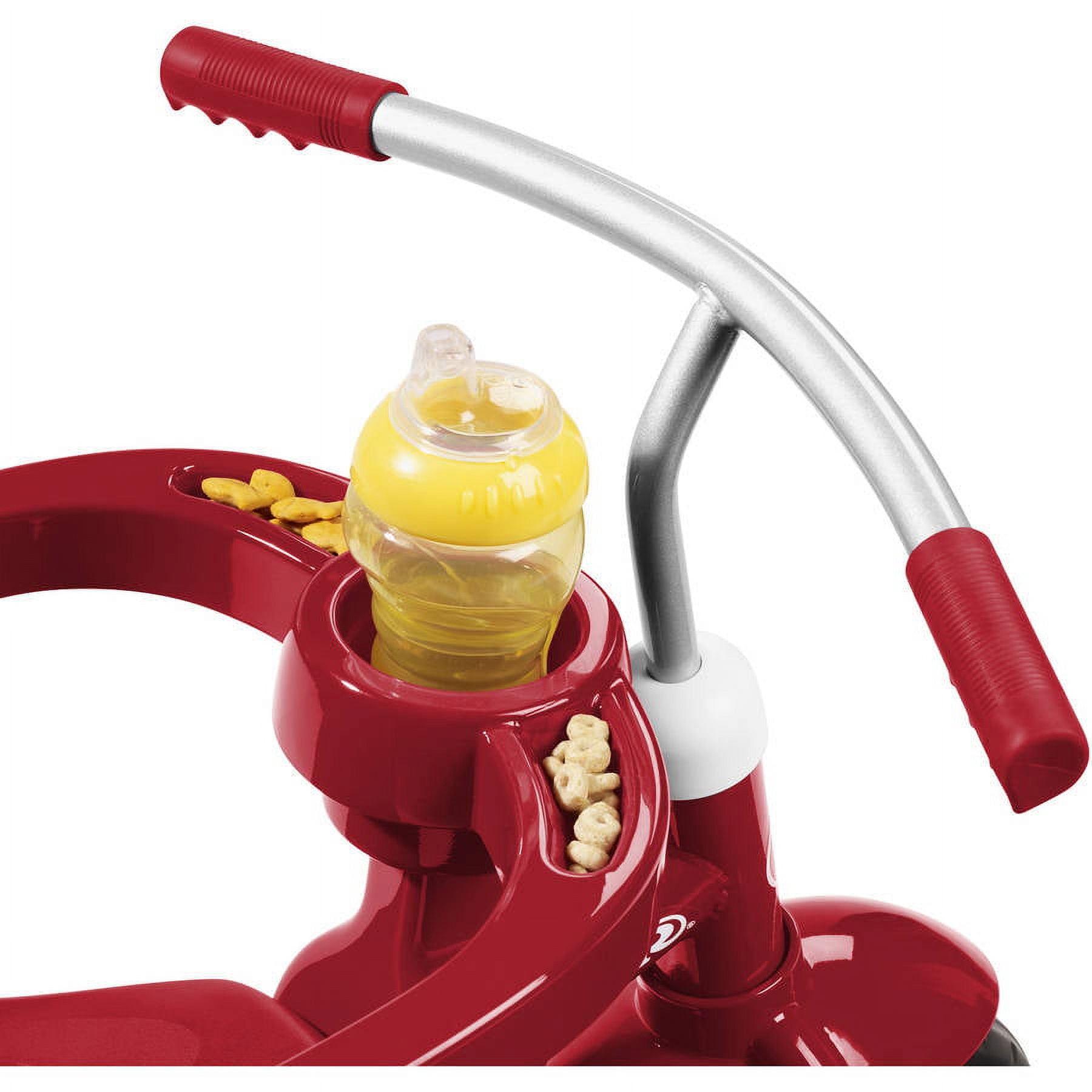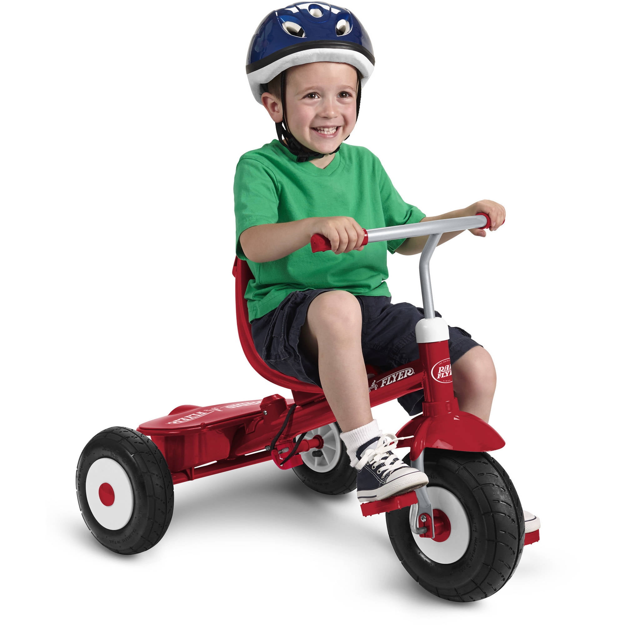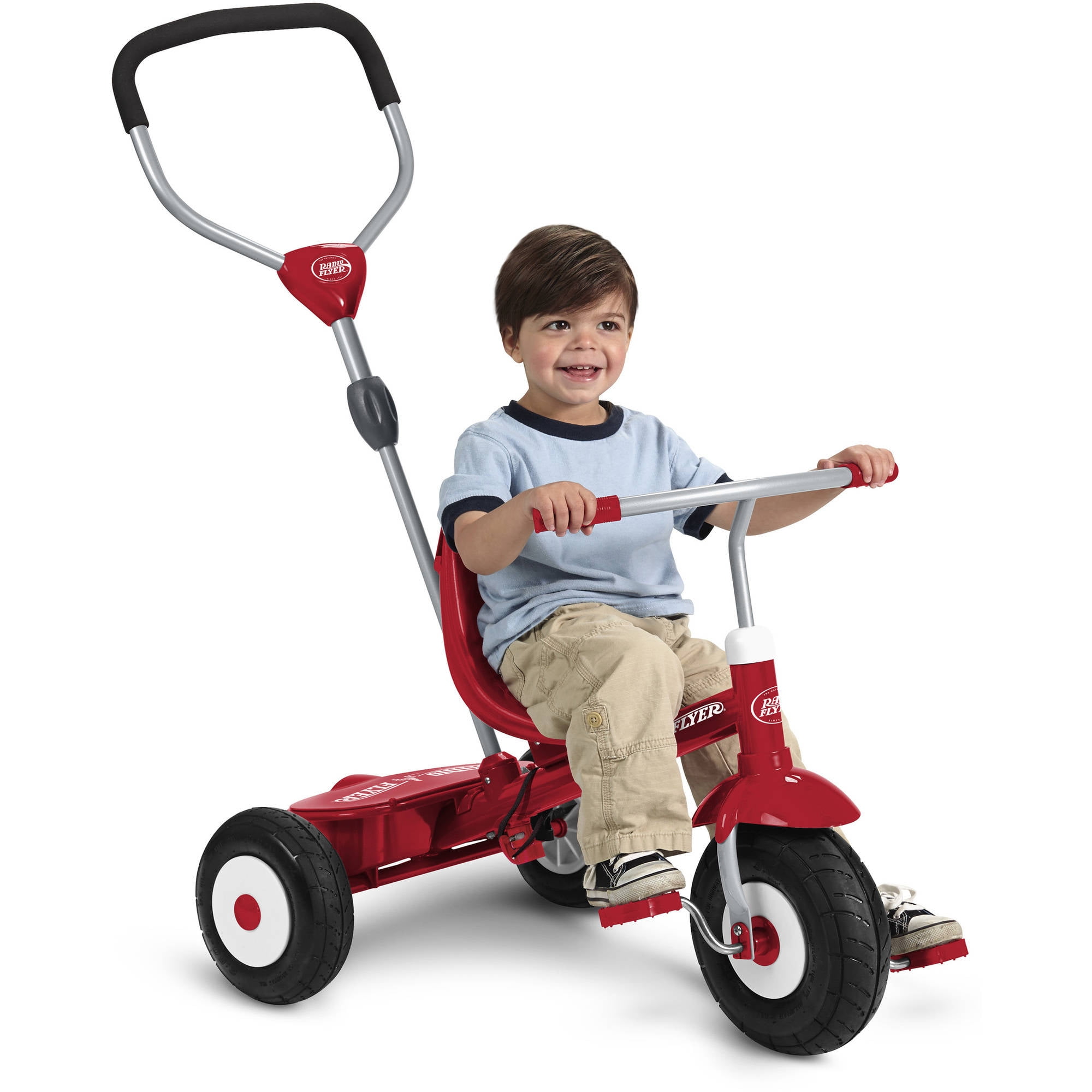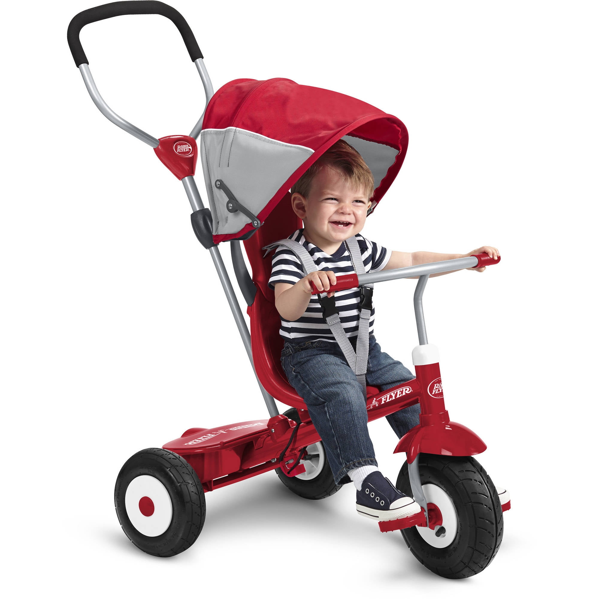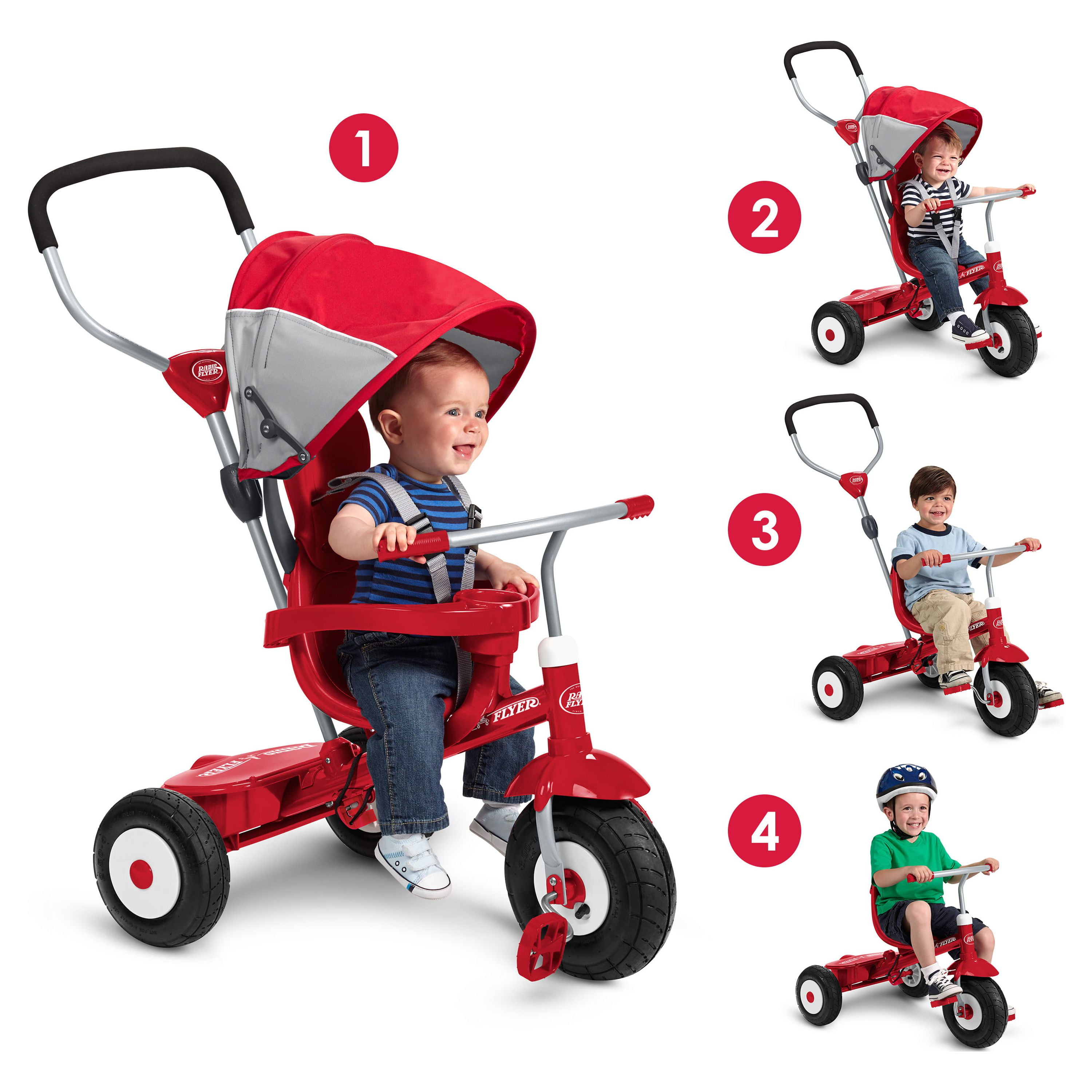 Key Features: Rugged air tires Grows with your child. 4 ways to ride: infant trike, push trike, learn-to-ride trike and classic tricycle Secure 3-point harness and high back seat Removable safety tray with cup holder Adjustable seat grows with your child Adjustable parent push handle Removable canopy for UV protection Covered storage bin for added fun Weight capacity: 49 pounds Age: 9 months to 5 years Dimensions (L x W x H): 30.71 x 21.65 x 41.34 inches Assembly Details: Adult Assembly Required, Tools Not Provided If you have any questions regarding your product, please contact Radio Flyer Customer Service at 1 (800) 621-7613 or email us at [email protected]