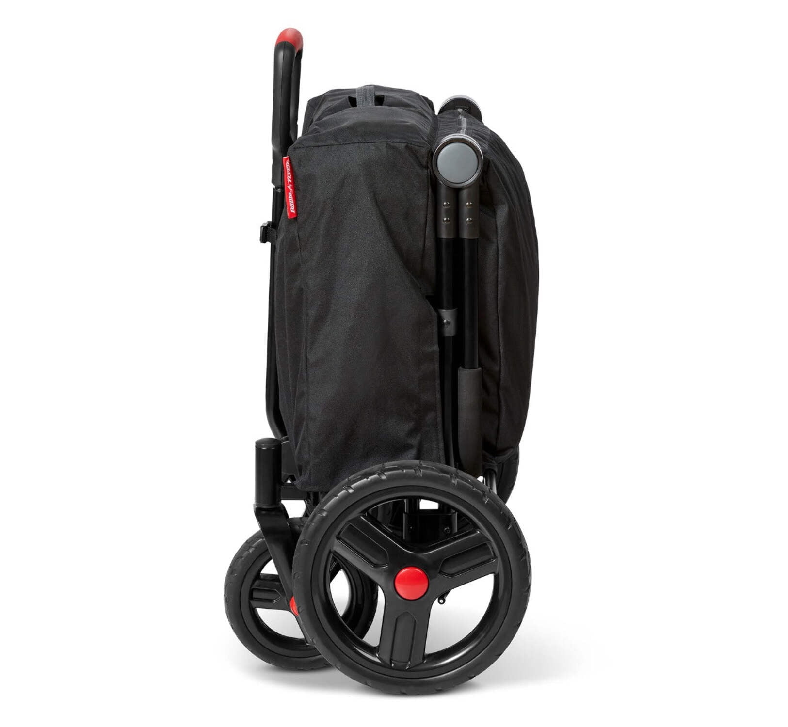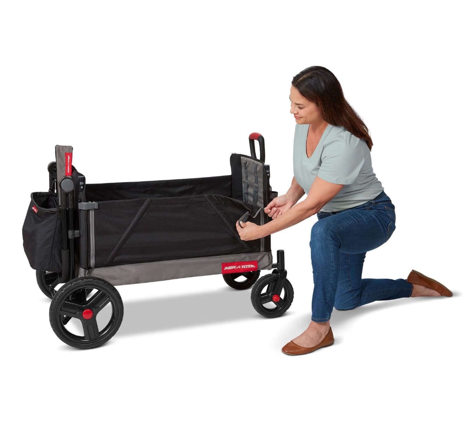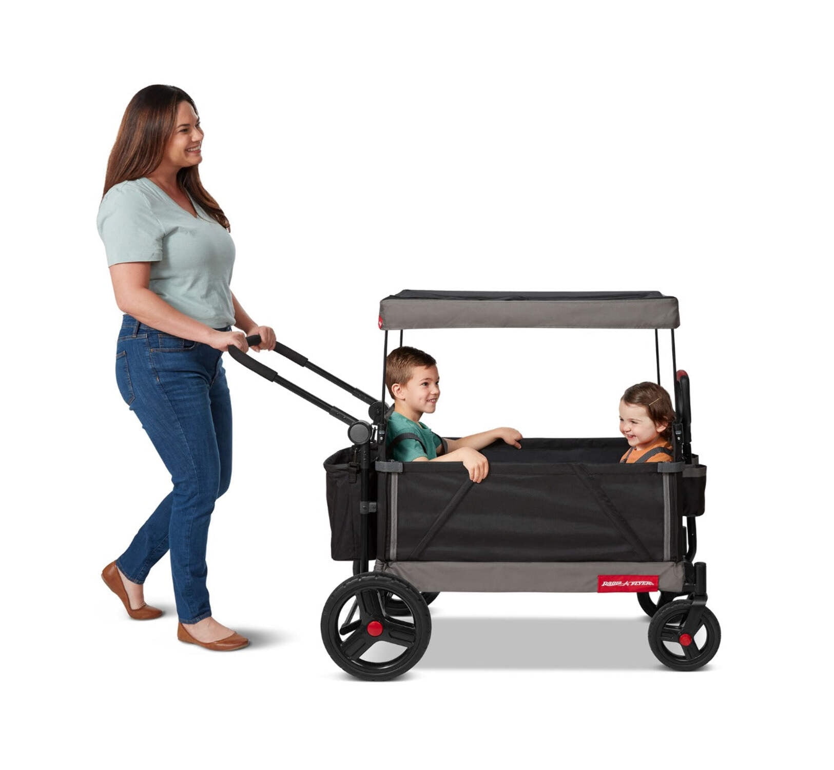 Wagon stroller offers durable rubber wheels with bearings for a smooth ride to keep kids comfortable on the trail, beach, or wherever life takes you Separate handles in front and back are easily adjustable and collapsible, allowing you to push like a stroller or pull like a wagon depending on the moment’s needs Simple folding design and travel case allows this wagon to be easily stored and accessed for impromptu family journeys or adventures Everyone in the family will enjoy the stroller’s cupholders, interior mesh pockets, and enough space for up to 2 kids plus a wide selection of toys or snacks Keep your young riders safe with a rear foot brake, 5-point safety harness, and Ultra-Violet protective canopy with peek-a-boo mesh to keep an eye on your little one Wagon converts to bench mode for a comfortable place for your little ones to sit and relax once you reach your destination Removable rear storage bag attaches to the unit when not being used for packing it away for easy compact storage Suitable for ages 1 year and up and accommodates up to 120 pounds for on-the-go versatility Height including seat: 17 inches Material: Fabric Color: Black Dimensions (L x W x H): 47.24 x 41.34 x 24.41 inches Weight: 36.71 pounds Radio Flyer stroller wagon with push and pull handle