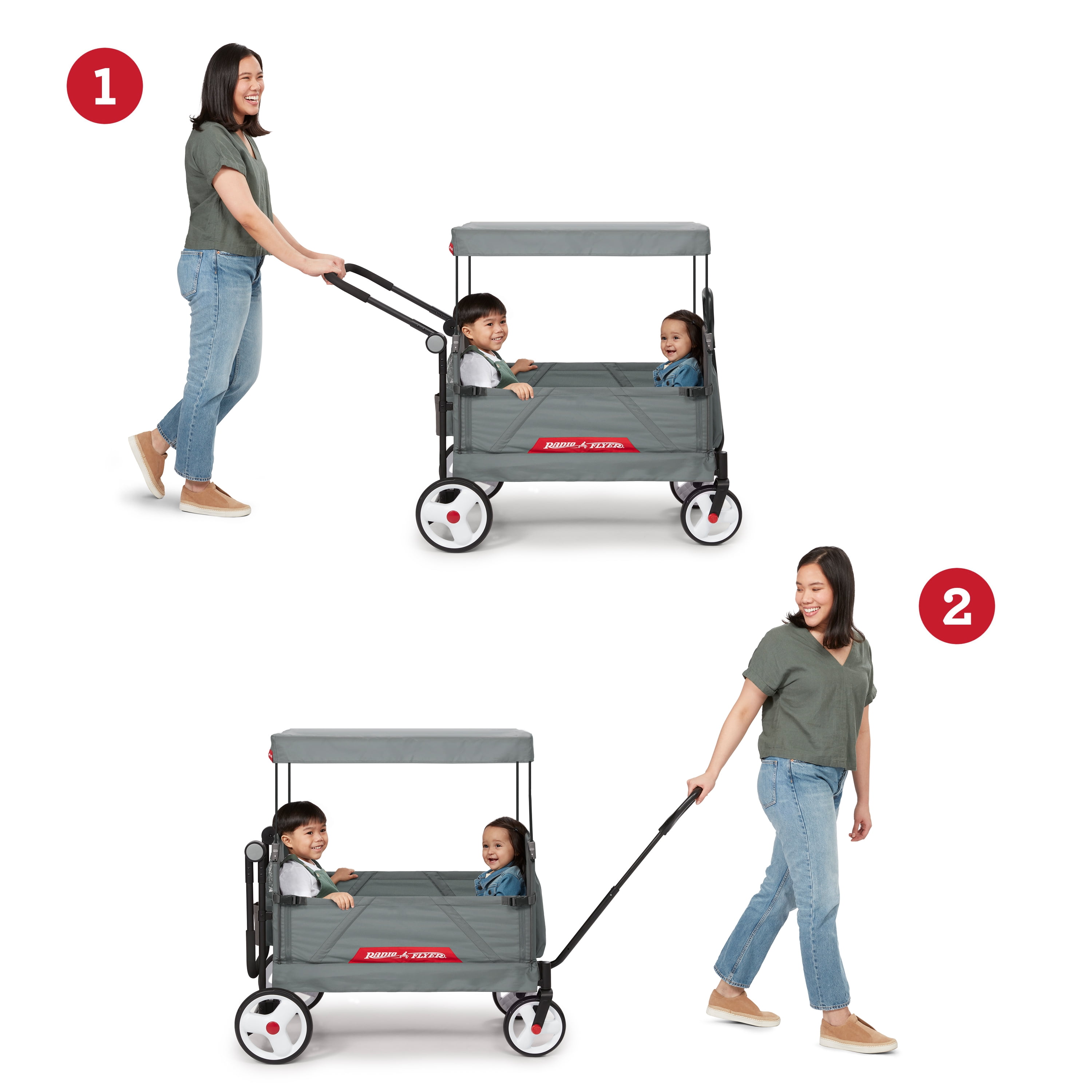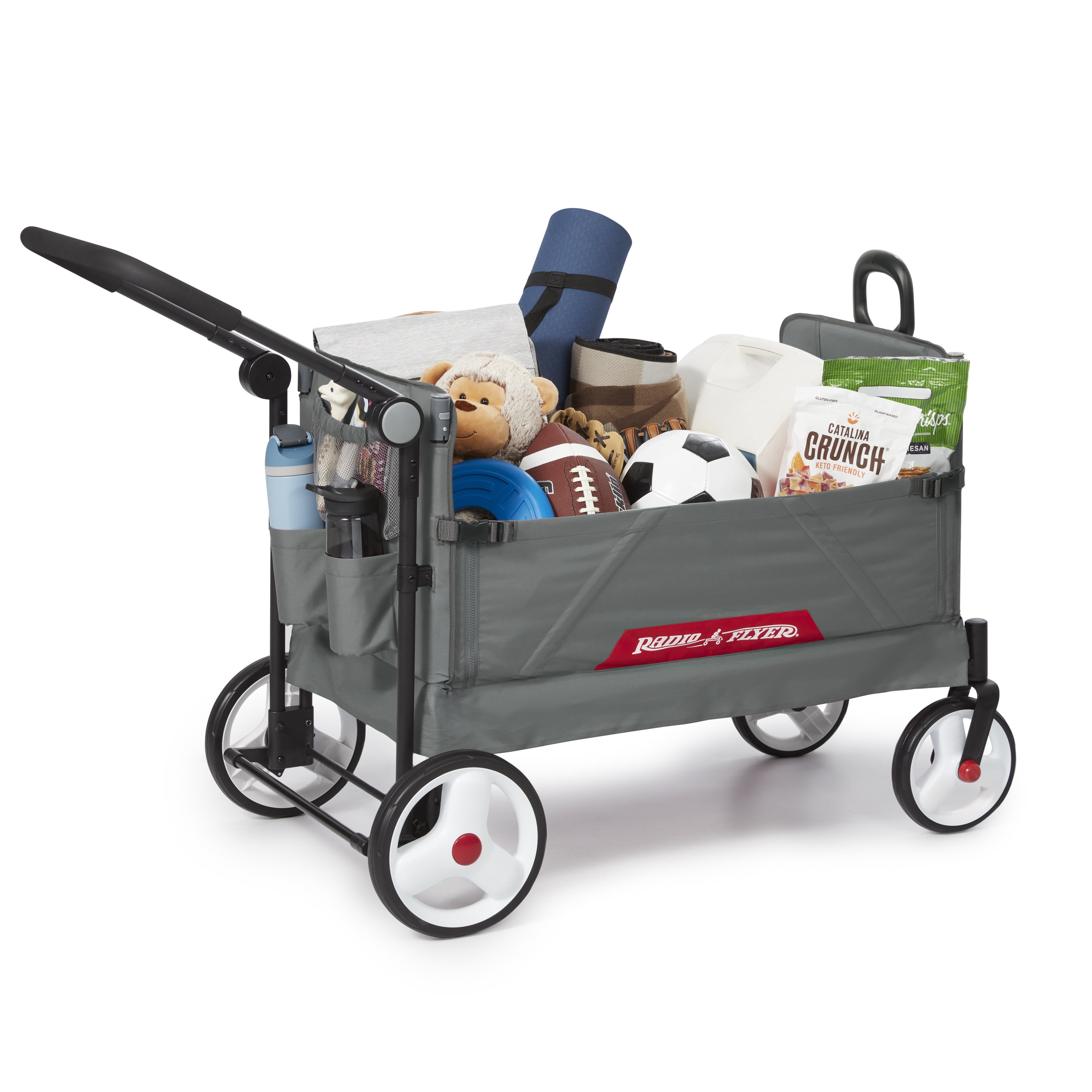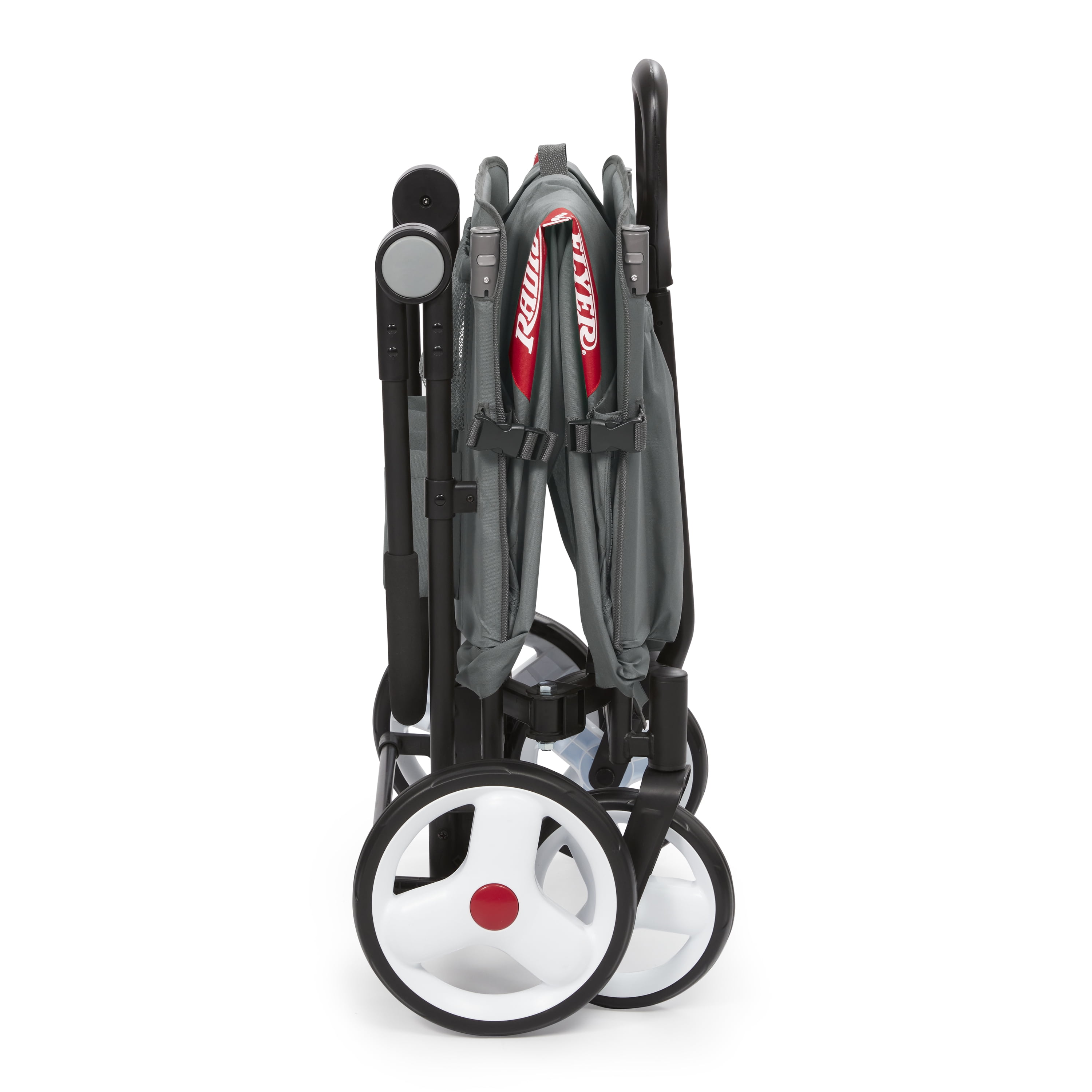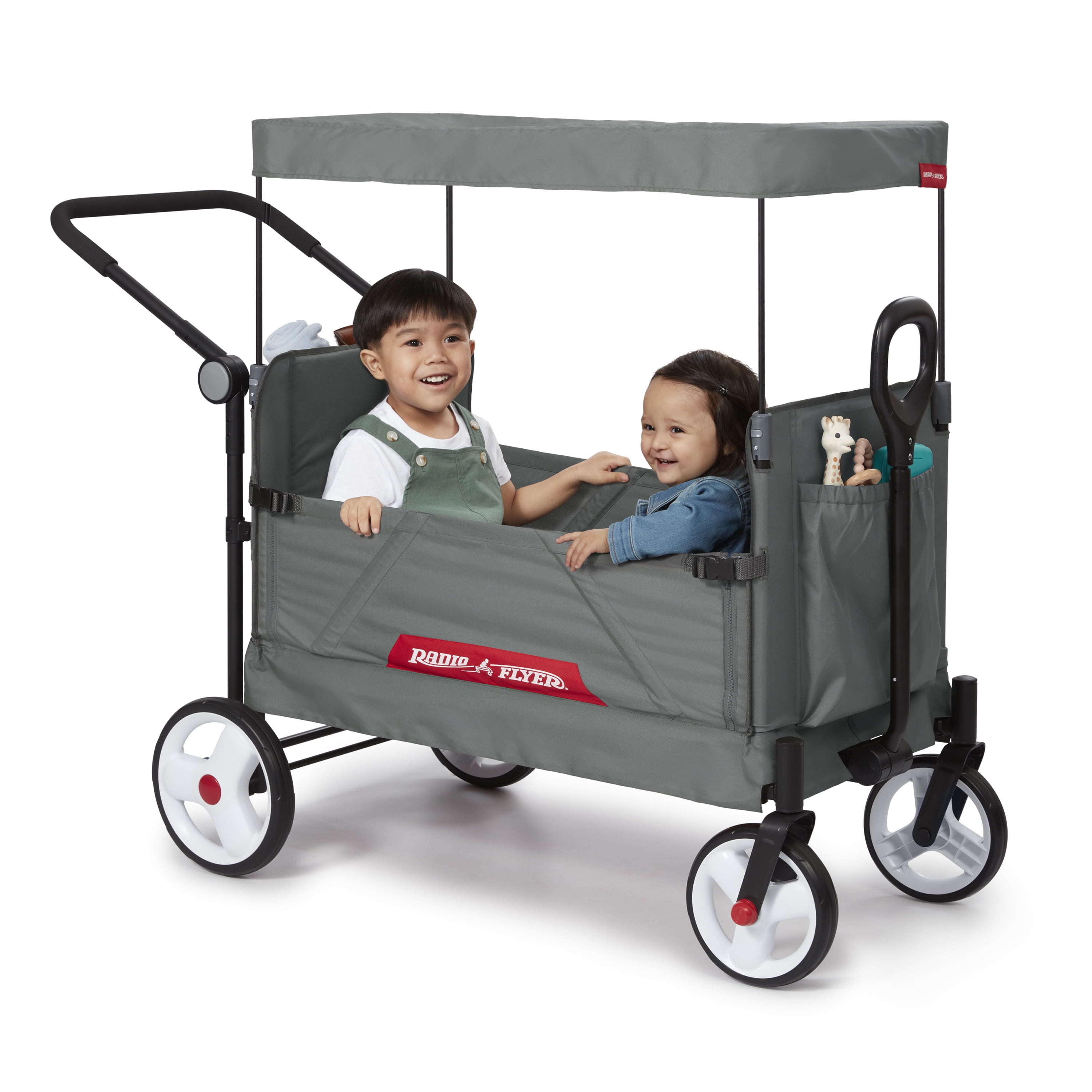 Brand: Radio Flyer Convenient push or pull steering for versatile mobility Height adjustable push handle and Never Fall™ pull handle for optimal control One hand fold mechanism for easy storage and transport Safety features include 3-point harnesses and rear brake for child security UV protection canopy rolls up for convenient storage when not in use Front caster wheels and large 12” rear wheels for smooth and nimble steering Ideal for kids aged 1 year and up, making it perfect for families Assembled gray wagon dimensions: 41.75″ Length x 25.25″ Width x 41″ Height Maximum weight capacity of 120 lbs. enabling robust use