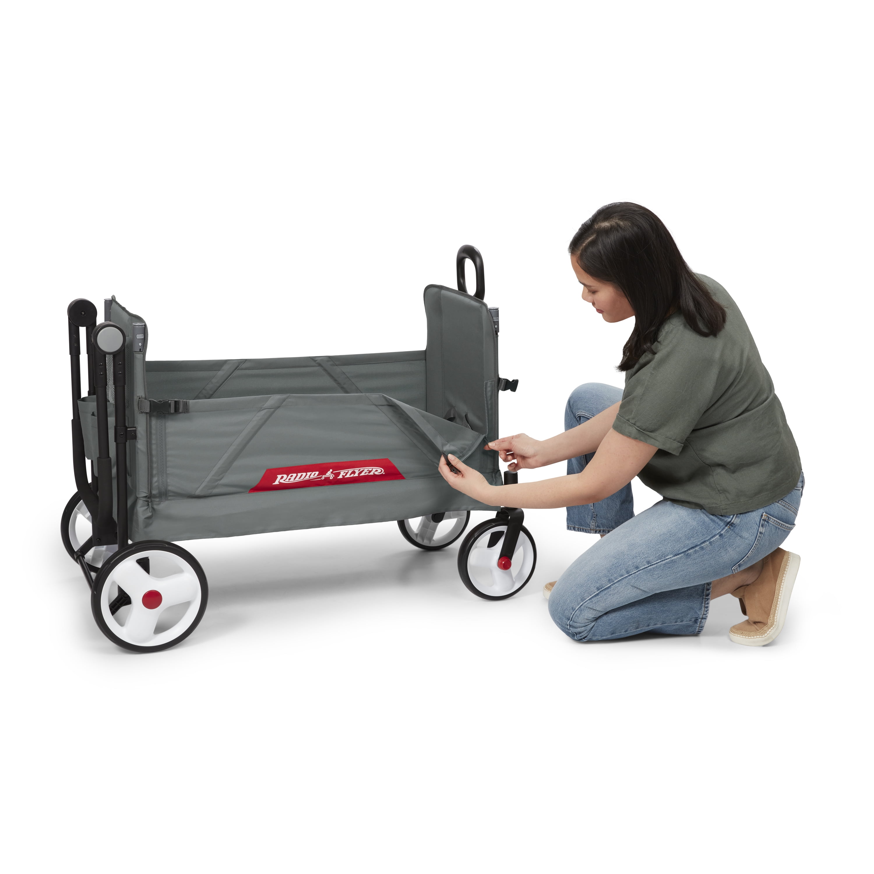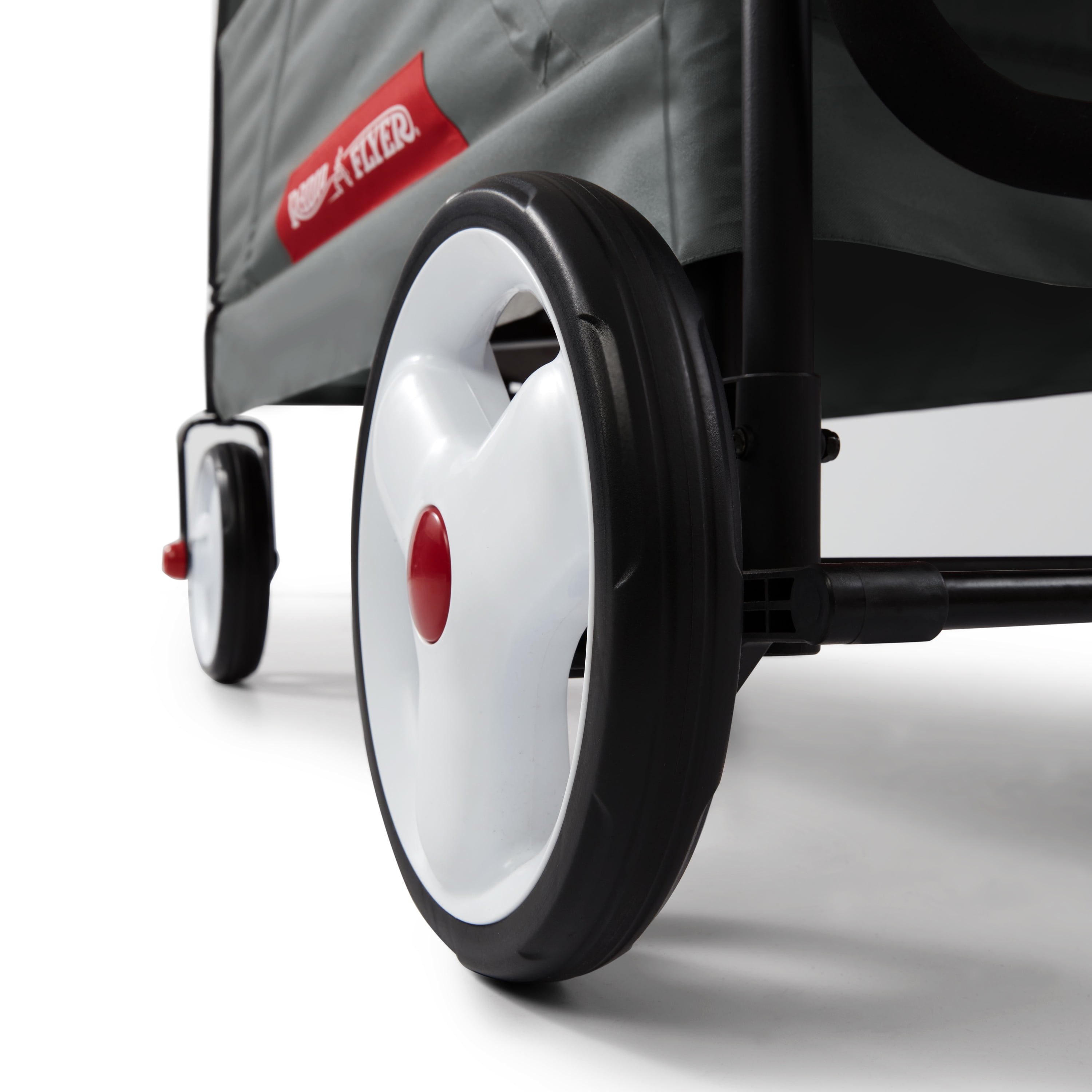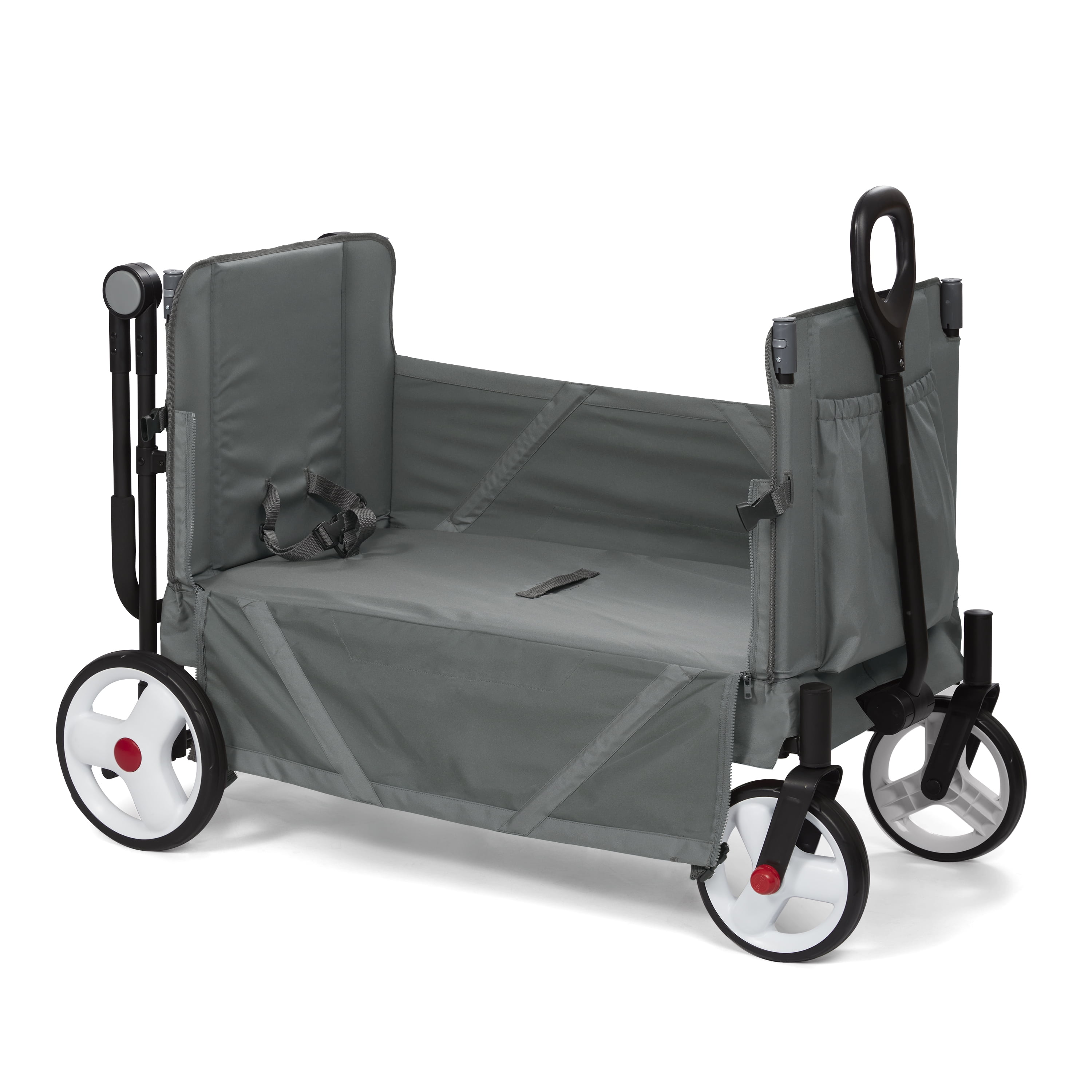 Brand: Radio Flyer Convenient push or pull steering for versatile mobility Height adjustable push handle and Never Fall™ pull handle for optimal control One hand fold mechanism for easy storage and transport Safety features include 3-point harnesses and rear brake for child security UV protection canopy rolls up for convenient storage when not in use Front caster wheels and large 12” rear wheels for smooth and nimble steering Ideal for kids aged 1 year and up, making it perfect for families Assembled gray wagon dimensions: 41.75″ Length x 25.25″ Width x 41″ Height Maximum weight capacity of 120 lbs. enabling robust use