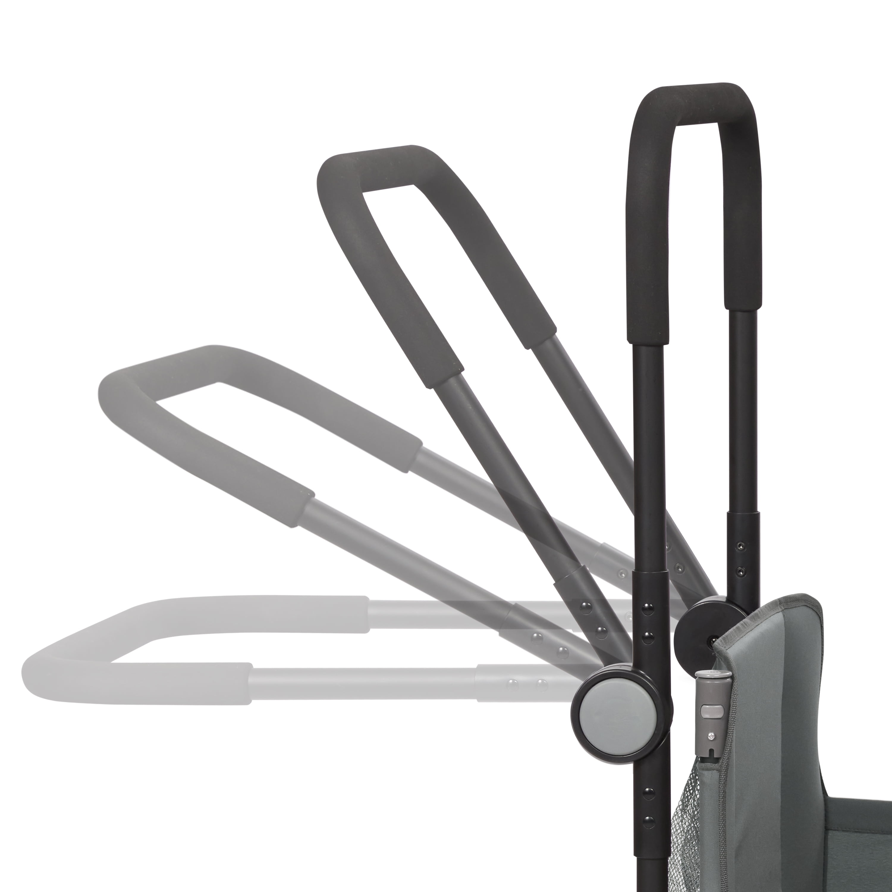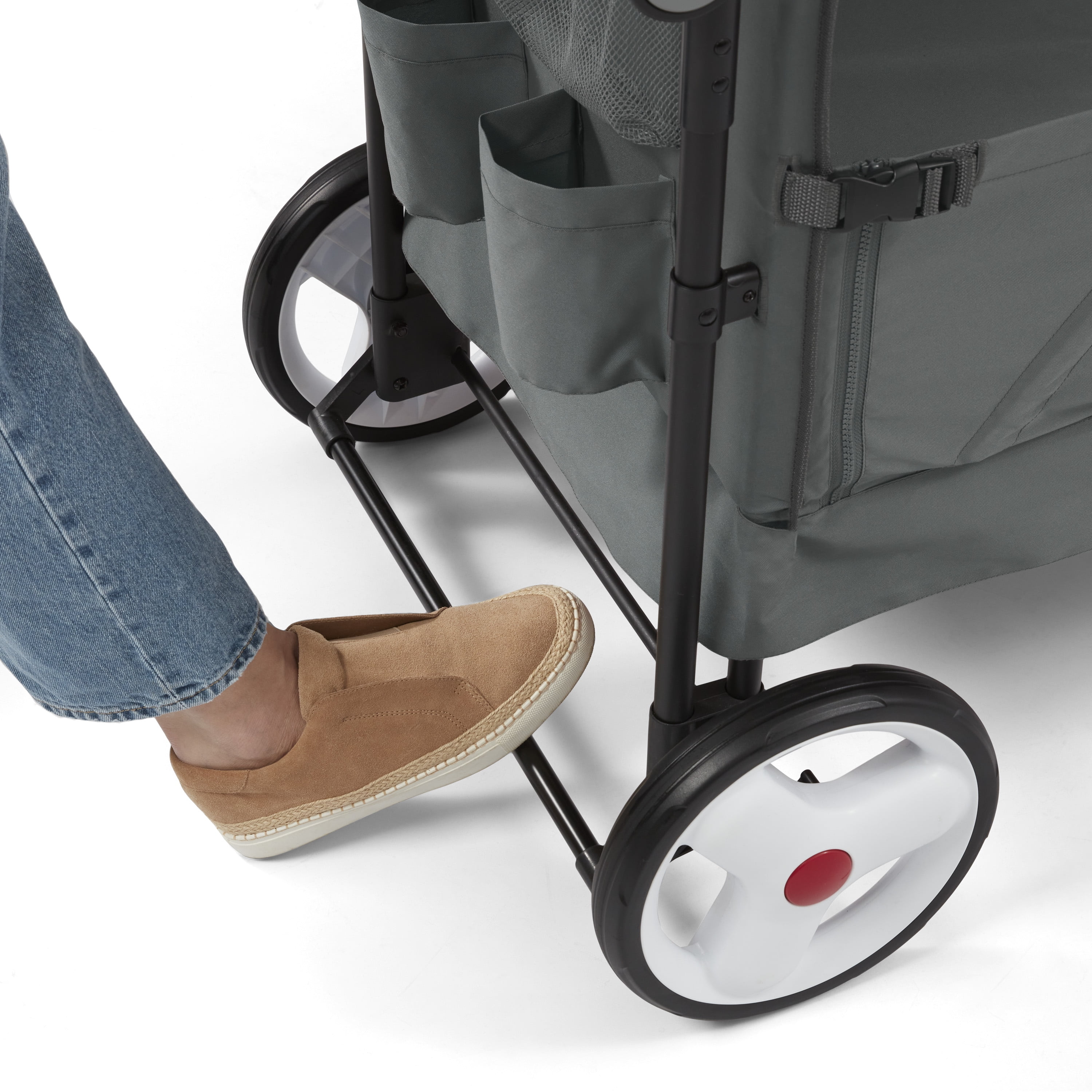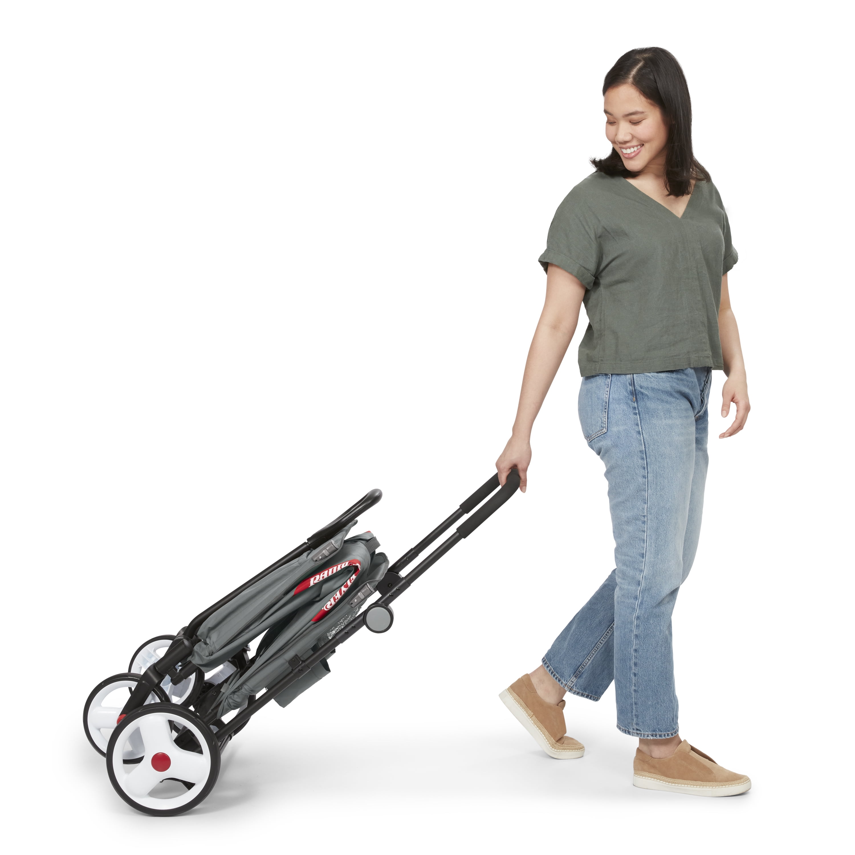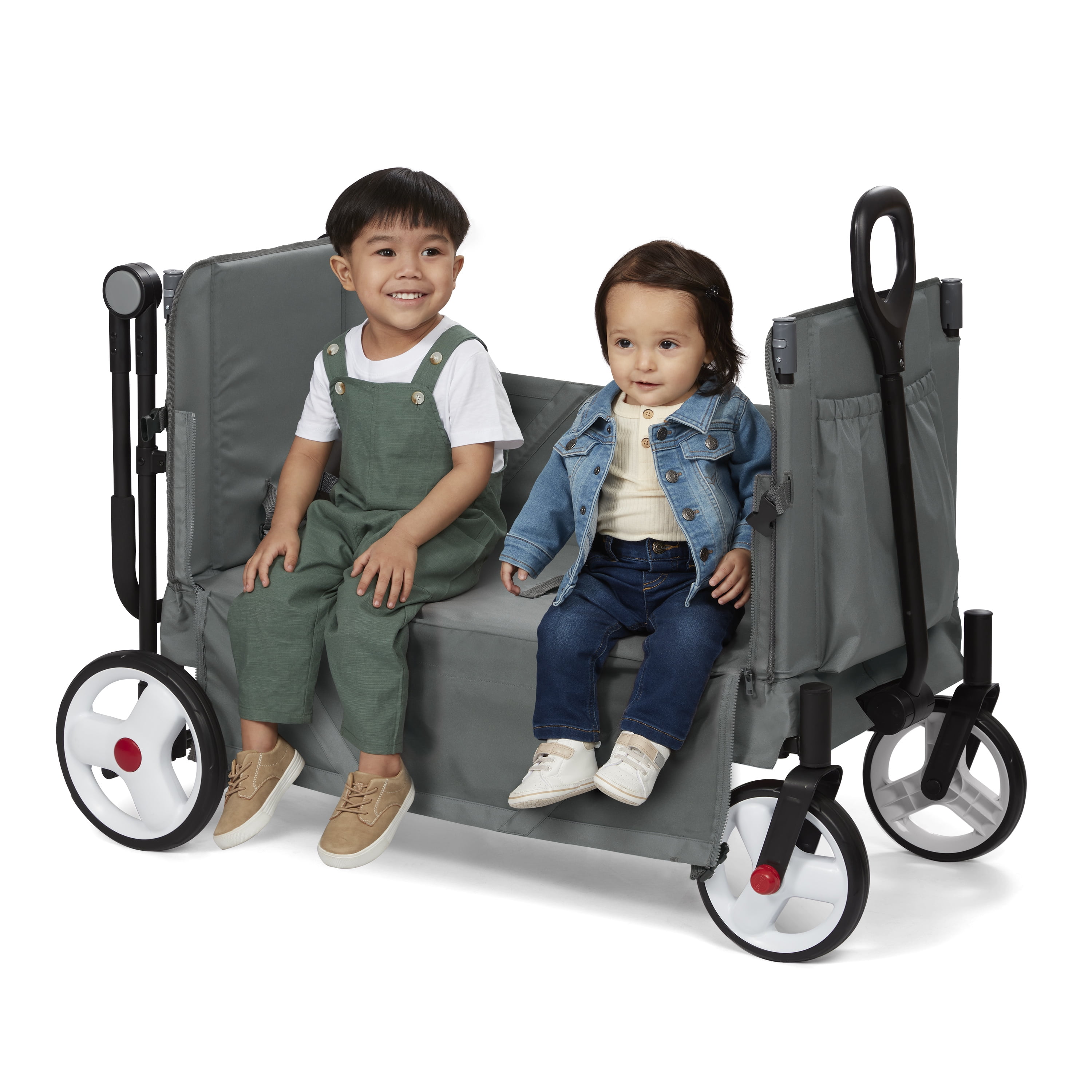 Brand: Radio Flyer Convenient push or pull steering for versatile mobility Height adjustable push handle and Never Fall™ pull handle for optimal control One hand fold mechanism for easy storage and transport Safety features include 3-point harnesses and rear brake for child security UV protection canopy rolls up for convenient storage when not in use Front caster wheels and large 12” rear wheels for smooth and nimble steering Ideal for kids aged 1 year and up, making it perfect for families Assembled gray wagon dimensions: 41.75″ Length x 25.25″ Width x 41″ Height Maximum weight capacity of 120 lbs. enabling robust use