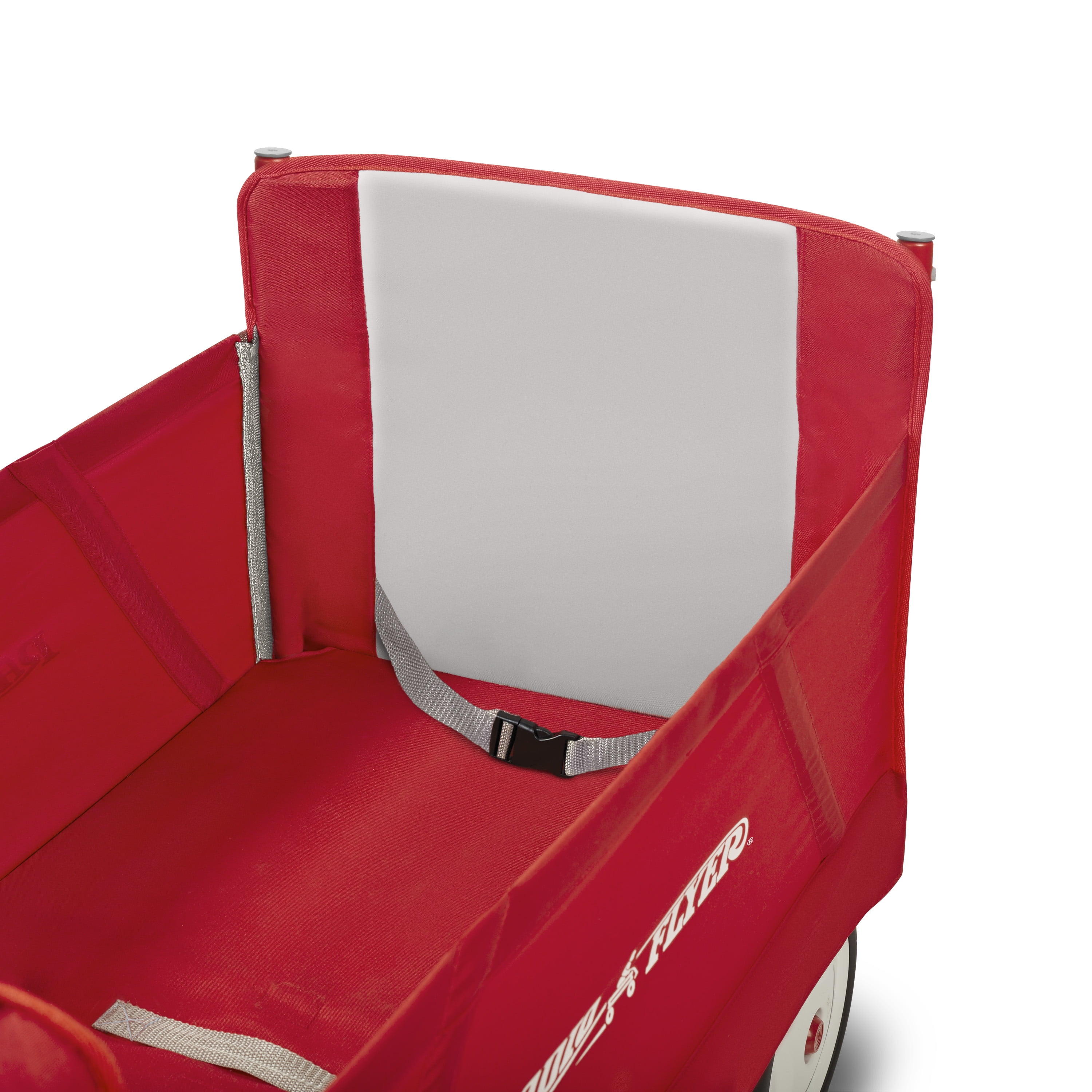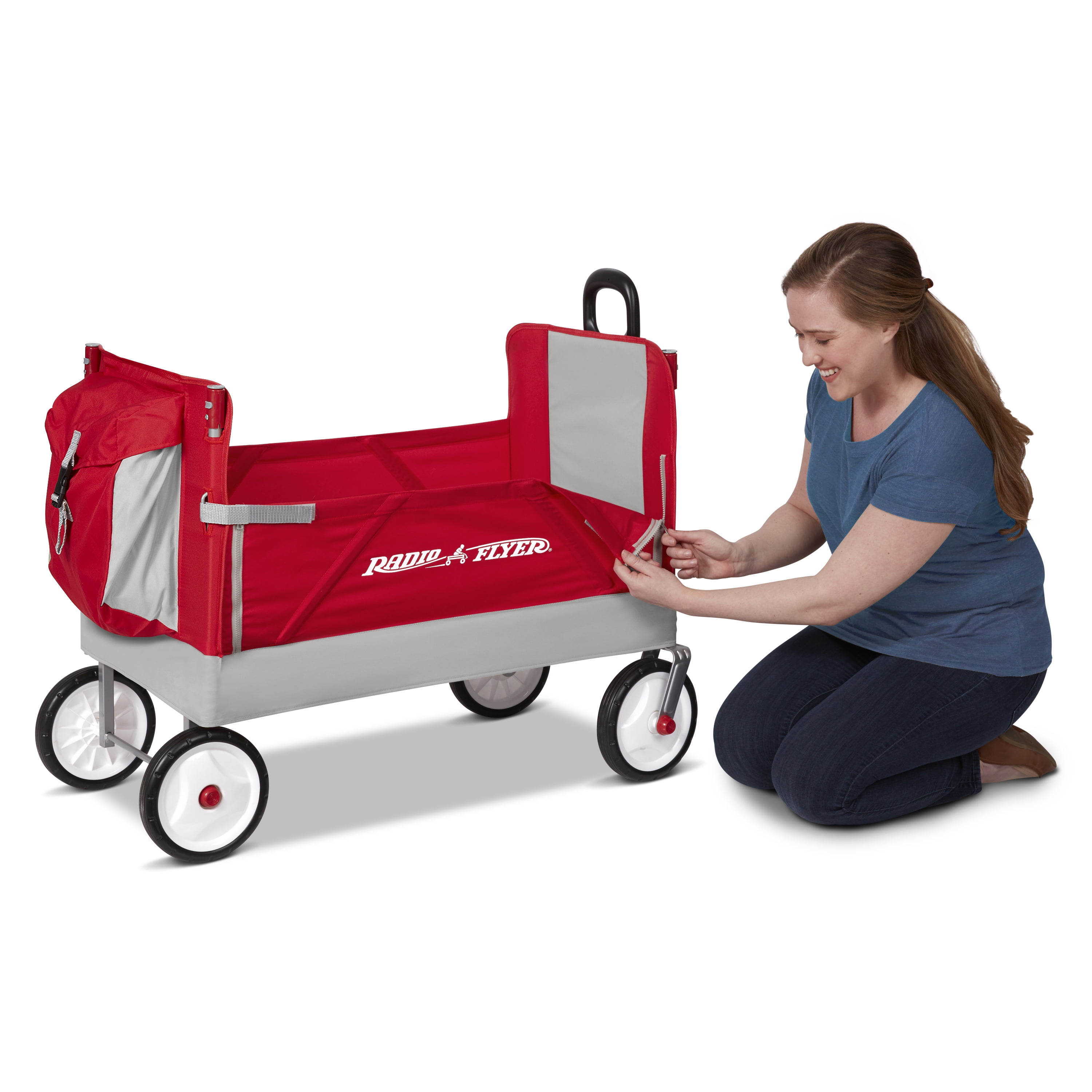 3 wagons in 1 – two rider seating, hauling, & bench seating Easy one hand flat fold, folds flat for easy storage Removable UV protection canopy stores on wagon when not in use Never Fall™ pull handle stays upright when not in use Rear storage bag hauls cargo and canopy Two front cupholders Seatbelts for added safety for your child Recommended for kids 1.5 years and up Maximum weight capacity 150 lbs. Assembled dimensions: 42.5″ L x 21.2″ W x 40.75″ H Assembled weight: 21.38 lbs. If you have any questions regarding your product, please contact Radio Flyer Customer Service at 1 (800) 621-7613 or email us at [email protected]