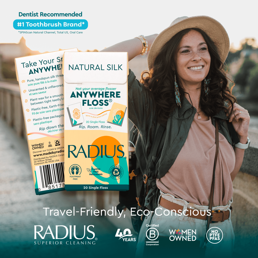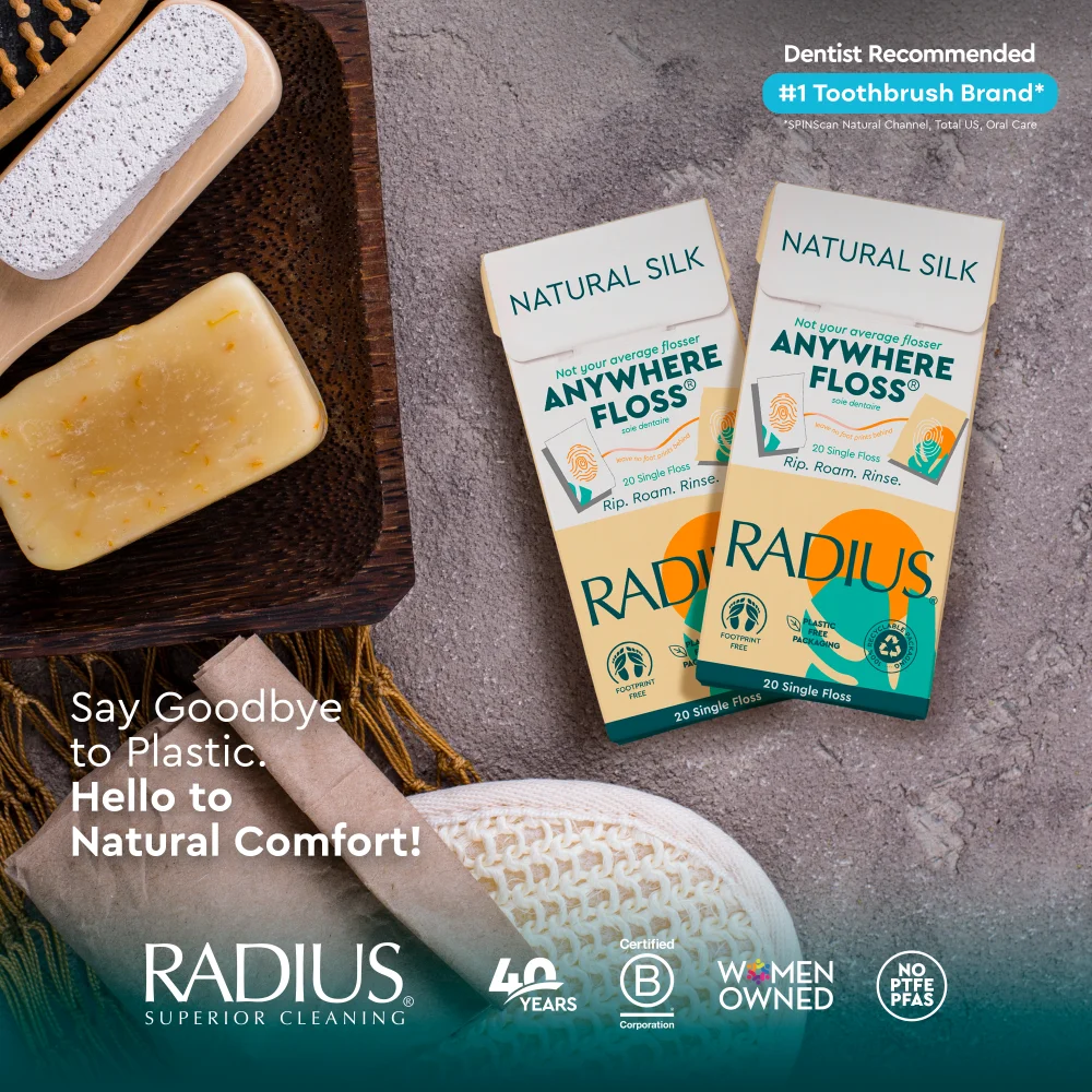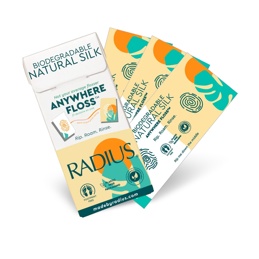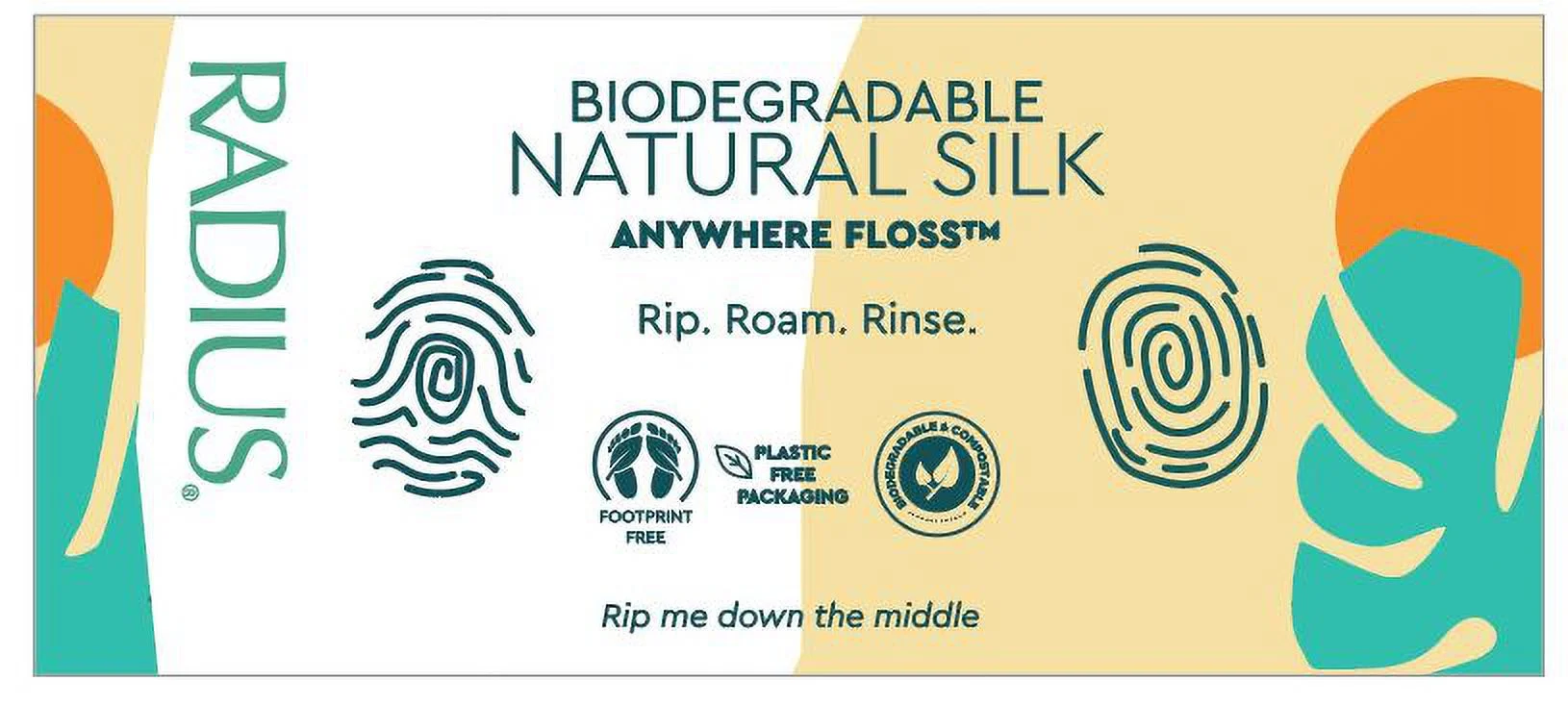 NOT YOUR AVERAGE FLOSSER: Anywhere Floss has biodegradable, plastic-free packaging! Rip the paper flosser down the middle, roam, and rinse. Soft and smooth, the natural silk thread is spun in plant-based carnauba wax and coconut oil ensure a smooth glide between teeth for total tooth and gum protection. BIODEGRADABLE: Both silk floss and packaging are biodegradable for guilt free on the go disposal. Special silk thread floss offers silken finish for all types of teeth. NO NASTY INGREDIENTS: You won’t find PFAs, glutens, preservatives, artificial sweeteners, GMOs, unnatural coloring, phthalates, parabens or any other harmful additives in our floss Ever. FLOSS WITH A CAUSE: Our pure silk thread is spun on small machines at the CORSEDA Co-op in Colombia, which supports more than 80 families. CONTENTS: Each retail pack has 20 individual, single-use paper flossers with 18 inches of pure silk thread; Available in two versions: Vegan Peppermint or Biodegradable Unscented Silk RADIUS manufactures all it’s products in-house on its own machines in Eastern Pennsylvania!