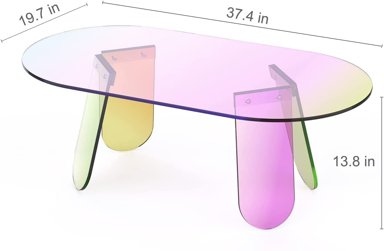 Material: Acrylic Color: Iridescent Overall Dimensions: 37.00 x 20.00 x 13.00 Inches Assembly required: Yes Care & Clean: Wipe clean with a damp cloth, and wipe dry with a clean cloth Note: Our coffee table has a protective film on the desktop when it leaves the factory, please tear it off before using it, it will be more beautiful