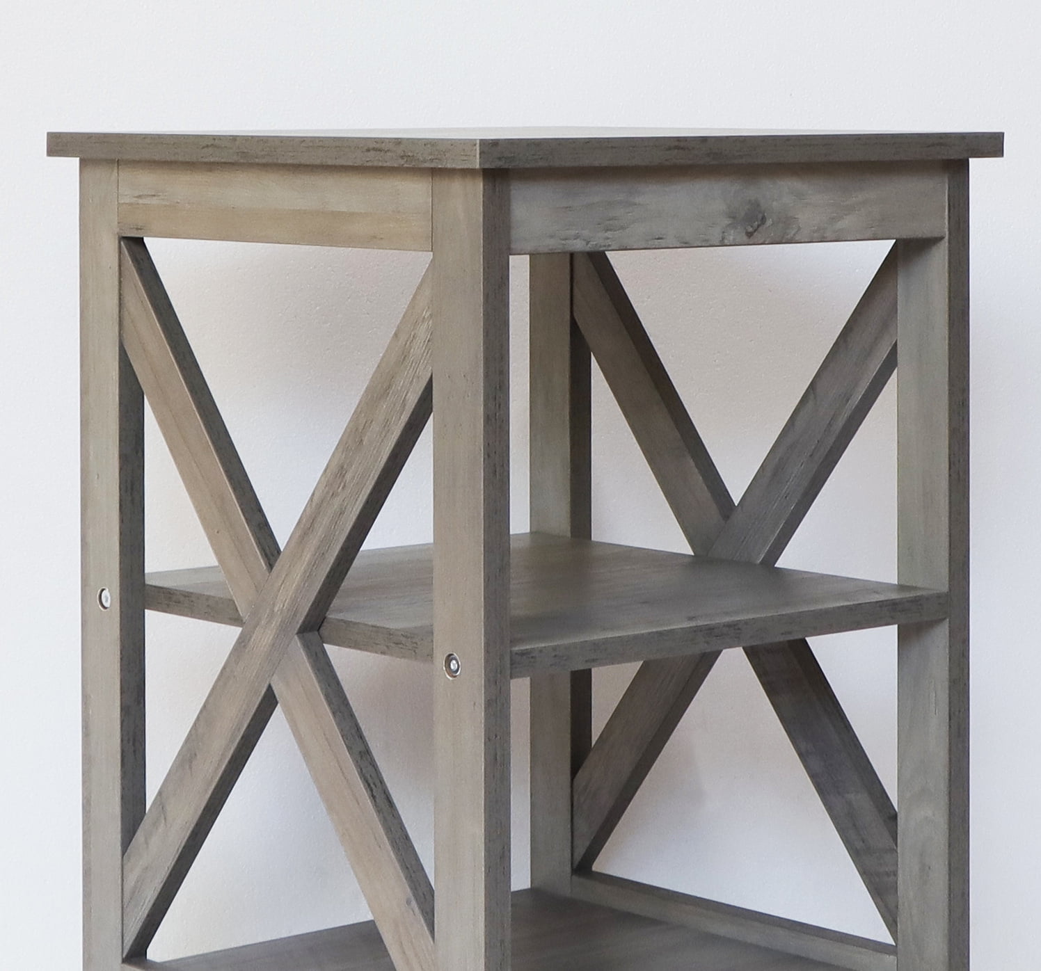 Modern Farmhouse Wood End Table is crafted of premium manufactured wood with high-grade veneer finish, featuring open X-frame sides with farmhouse accent. Open lined shelves are perfect for stacking and displaying décor items.