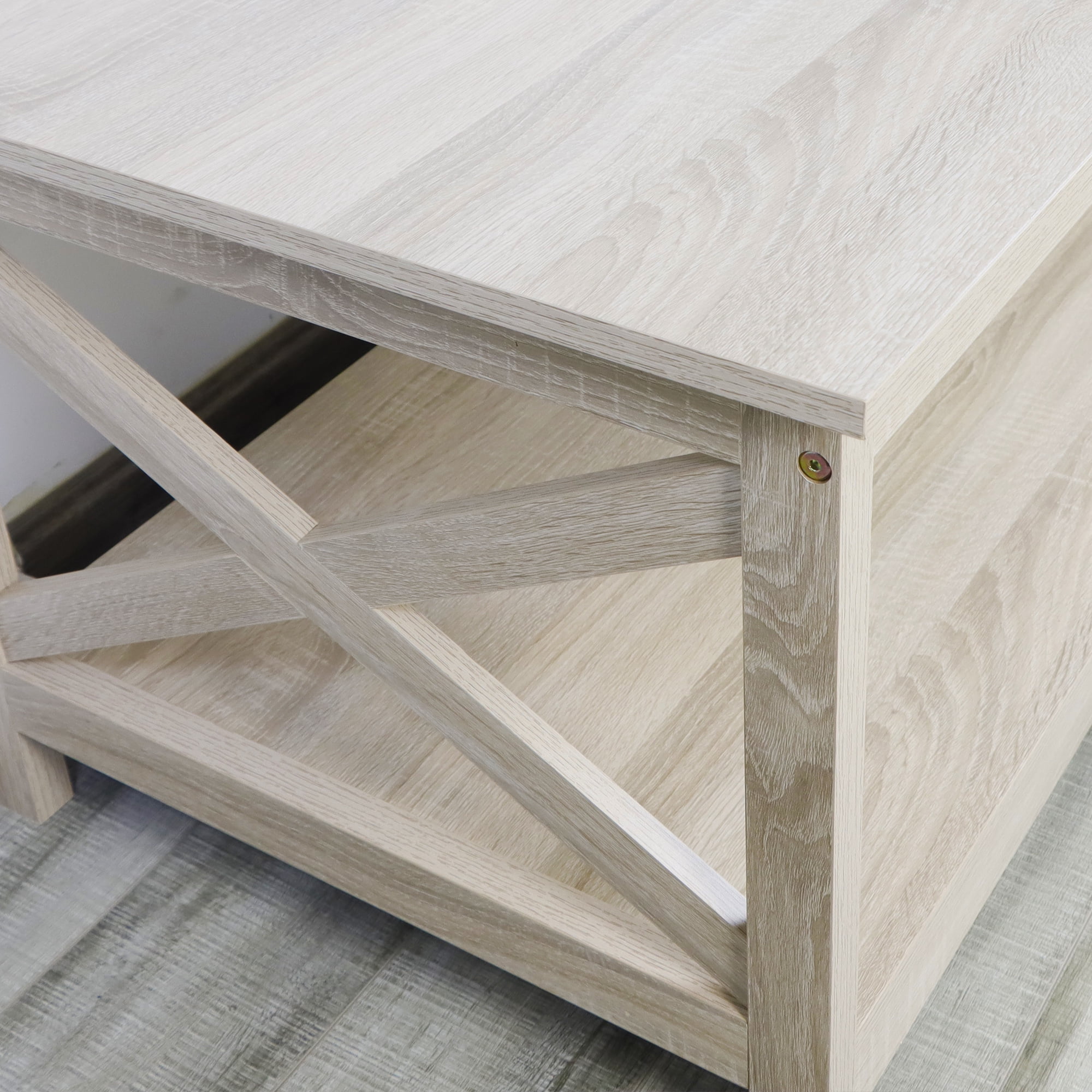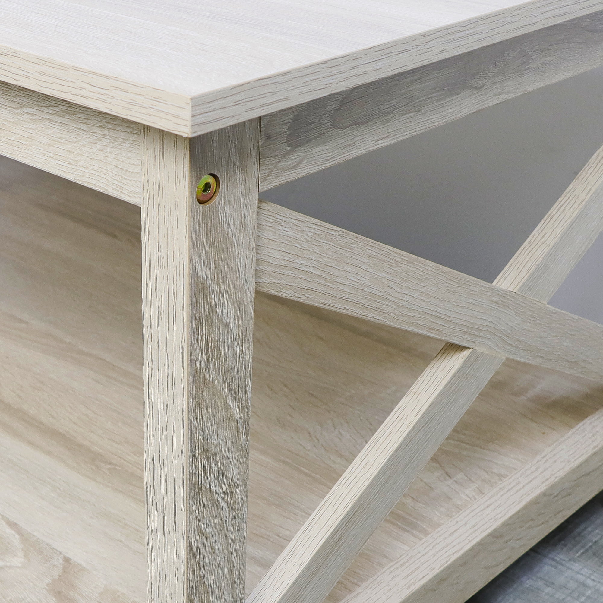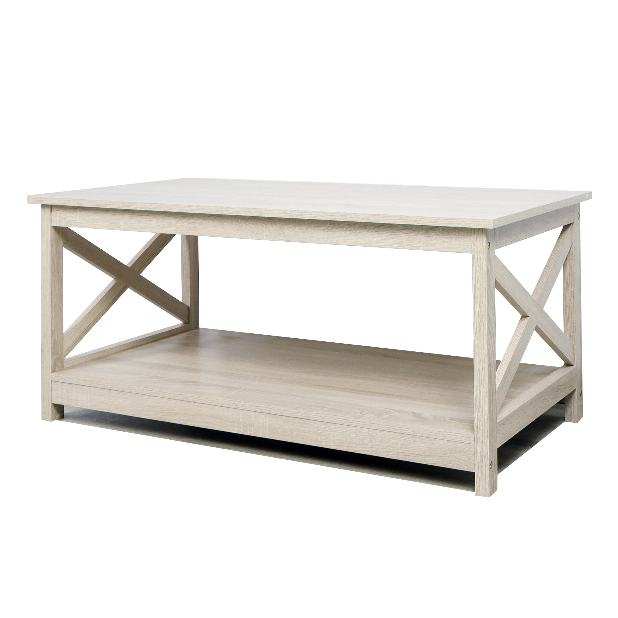 Rainbow Sophia Furniture Modern Storage Manufactured Wood Veneer Coffee Table, White Oak Features a classical design with open X-frame sides and charming farmhouse accents Open shelves offer ample storage and display space for decorative items Crafted from premium manufactured wood enhanced by a high-grade veneer finish for durability Dimensions 40 width 22 depth and 18 height ideal for various spaces Combines elegance and functionality making it a perfect addition to any home