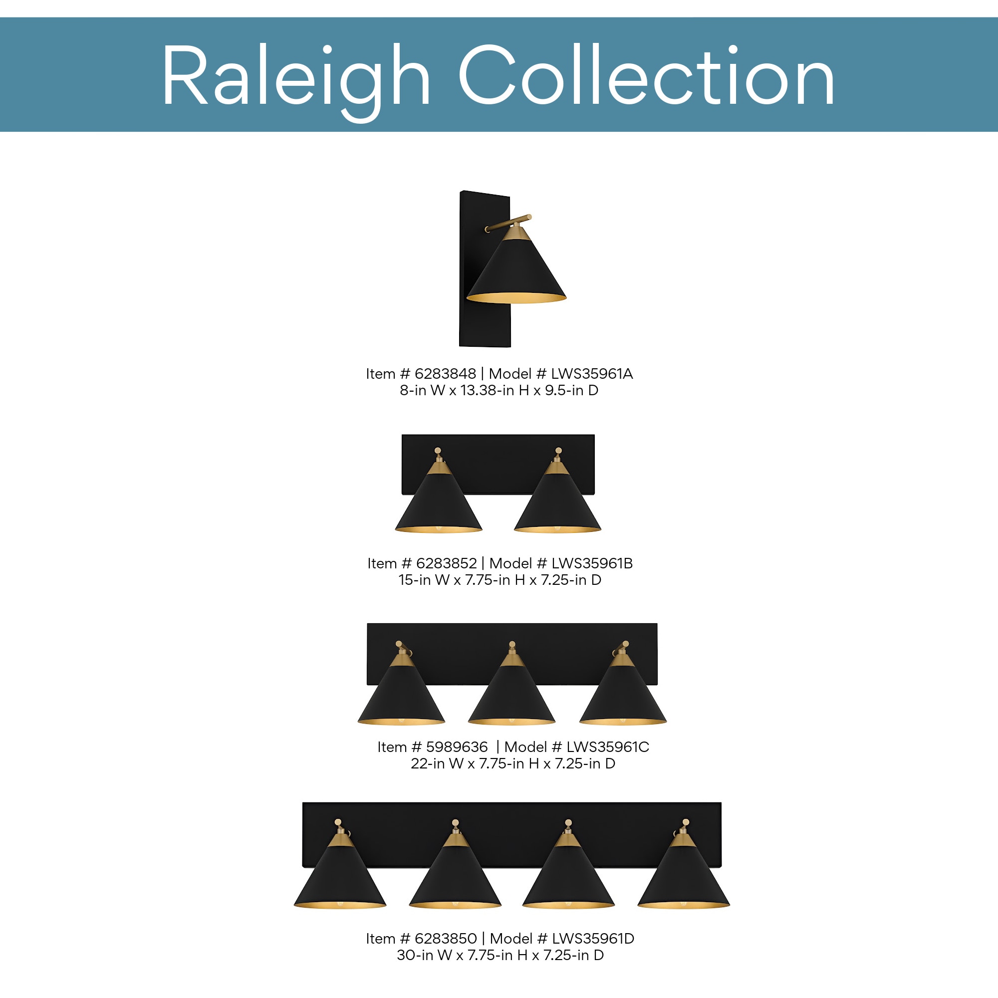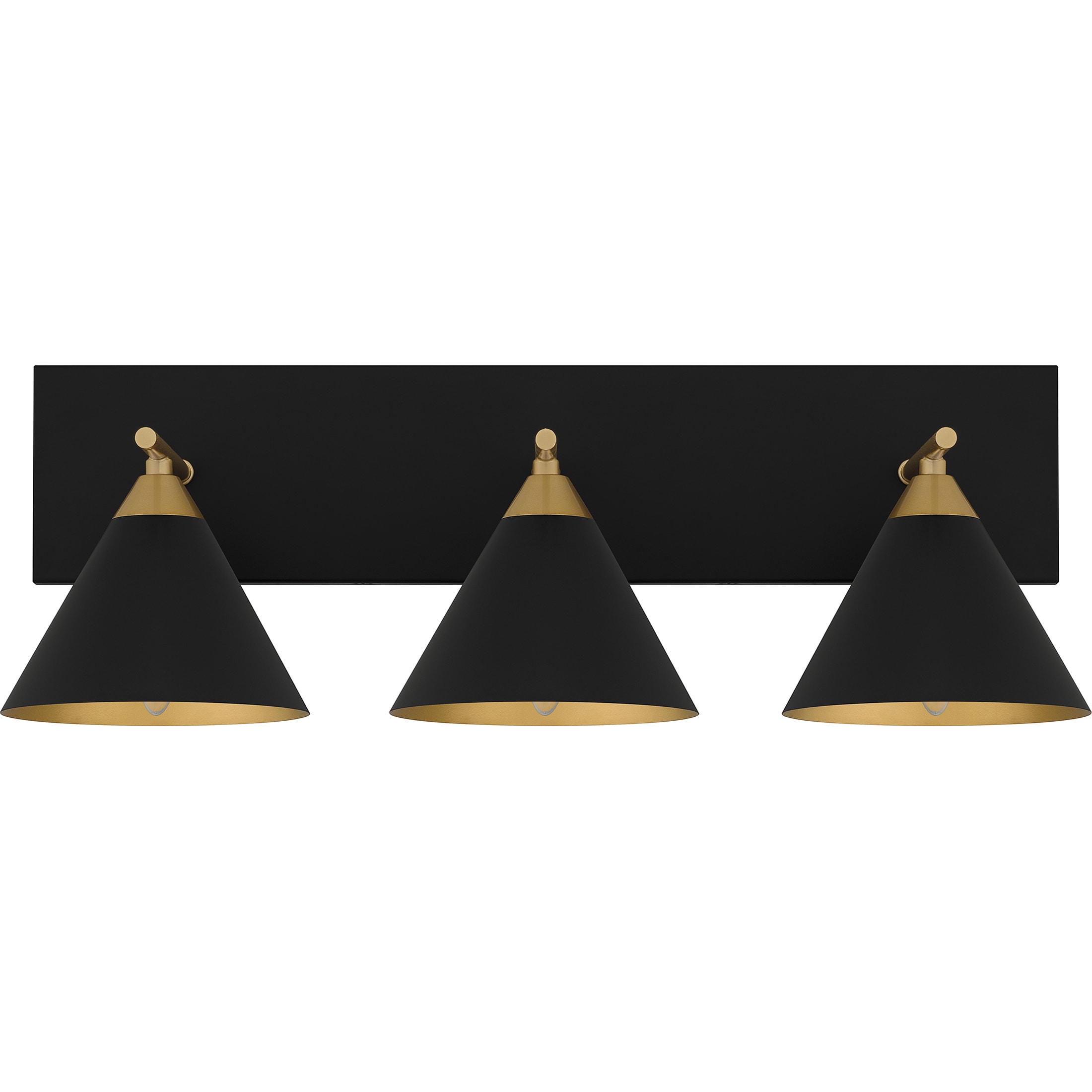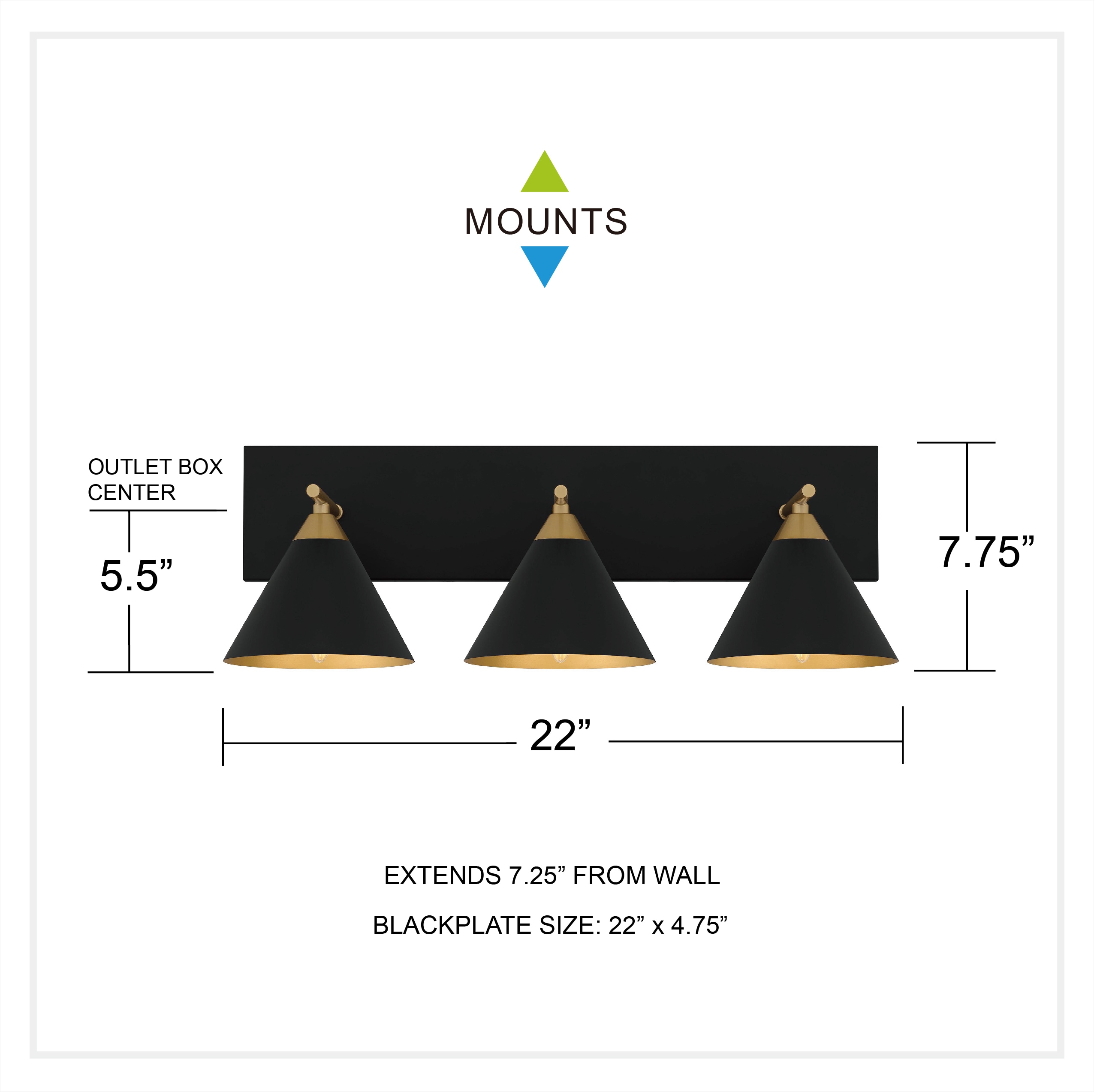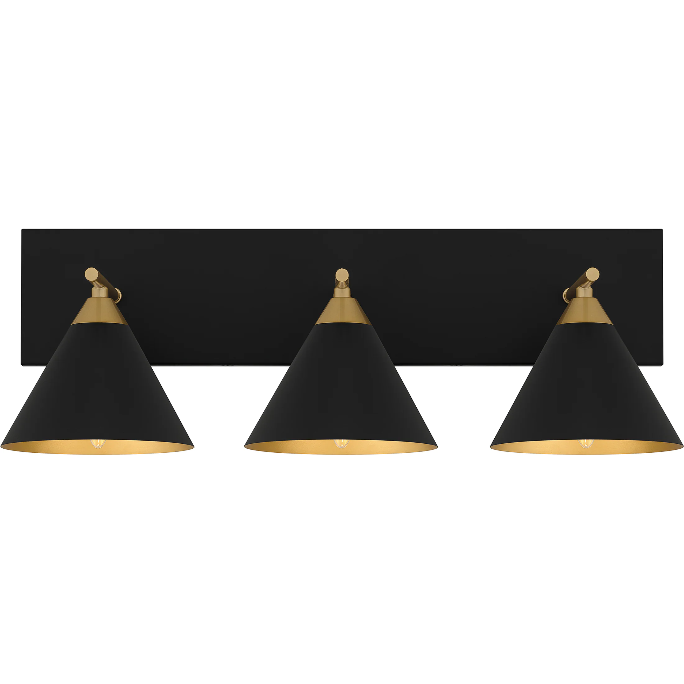 Illuminate your bathroom with sophisticated elegance using our three-light matte black and gold vanity light. The striking combination of matte black and gleaming gold accents creates a chic, modern aesthetic that elevates any space. Each of the three cone-shaped metal shades directs light precisely where you need it, providing optimal illumination for your daily routine. Designed with both style and functionality in mind, this vanity light adds a touch of luxury while offering practical, bright lighting. Easy to install and built to last, it’s the perfect upgrade for your contemporary bathroom. Transform your space with this stunning blend of modern design and timeless appeal. Shop the rest of the Raleigh collection for one, two, three, and four-light vanity light options.