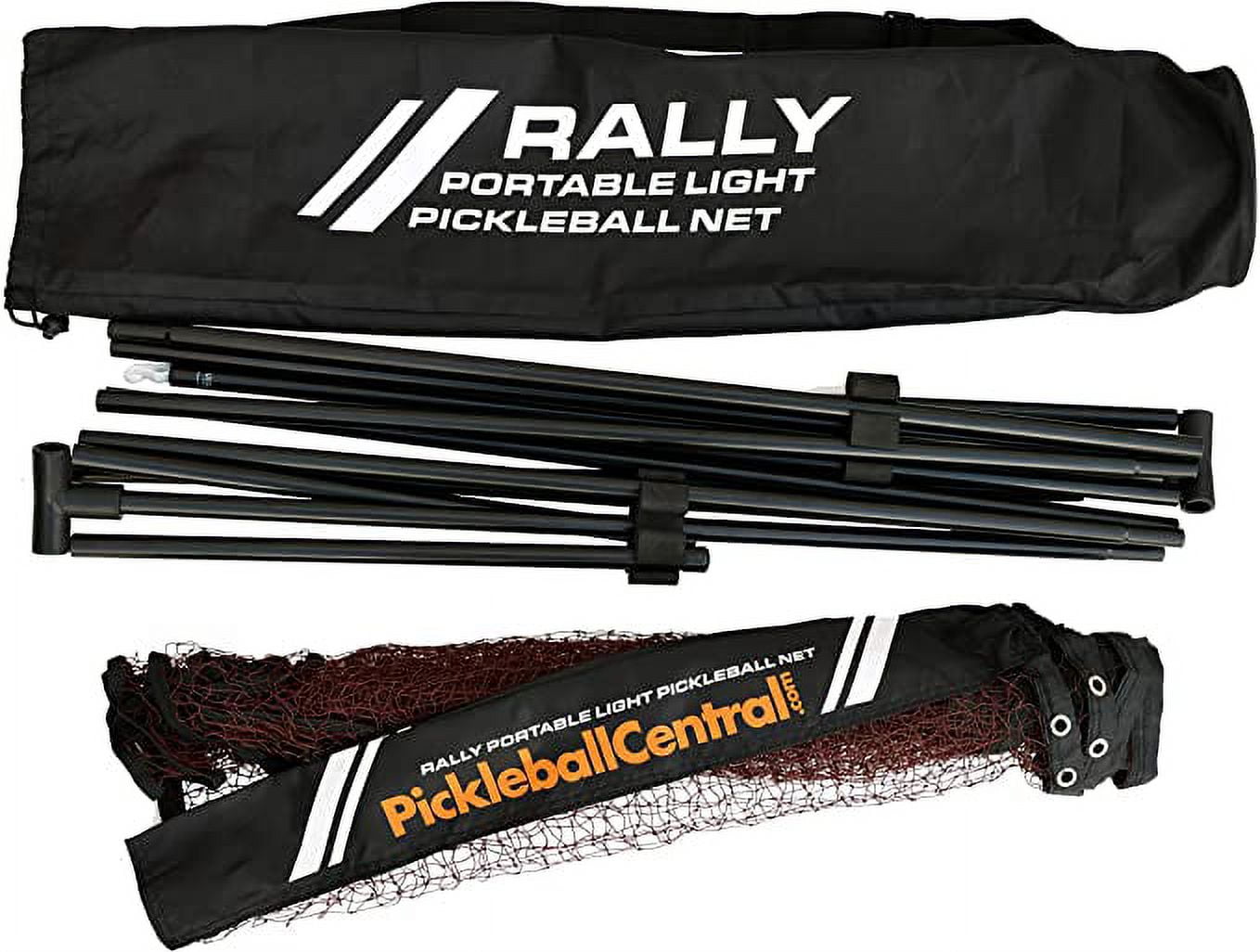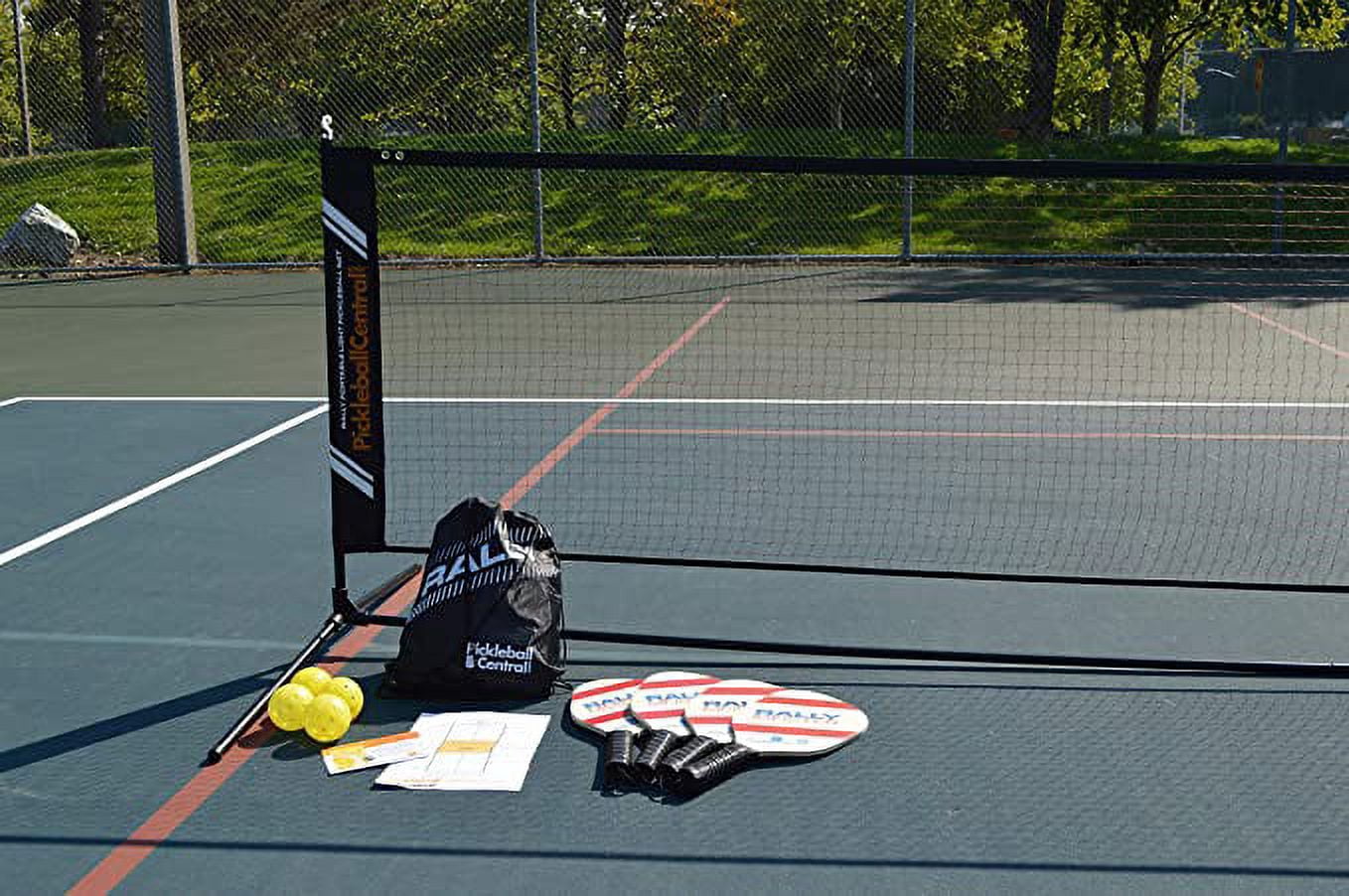 Everything you need to start playing pickleball: Includes 1 Portable Net System with Shoulder Carry bag + 4 Rally Meister Paddles + 4 Pickleballs + Line Marking Chalk + Rules & Strategy Guide + Rally Drawstring Gear Bag Easy Assembly: Shock-cord runs throughout so it sets up like a tent pole. Lightweight and strong. High Quality Components: Features our most popular beginner pickleball paddles, quality pickleballs, line chalk, branded drawstring carry bag and our custom quick-start pickleball rules and strategy guide.