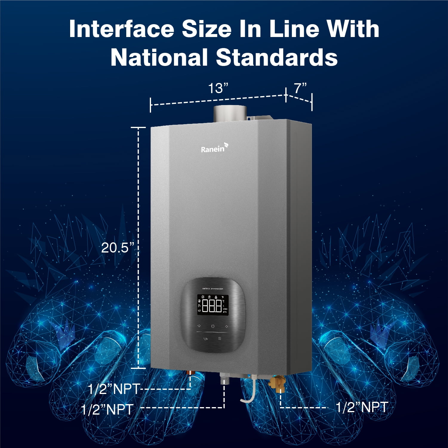 Ranein tankless water heater exclusive Water Saving Setting can save up to 1,100 gallons annually. Reducing the water flow at the tap until the set temperature is reached minimizes the amount of wasted water while waiting for it to get hot. Enjoy continuous hot water where you need it without the wait. Ranein water heater propane powerful heat exchanger means you won’t have to worry about running out of hot water. Wash the dishes, load the laundry, bathe the kids and still have enough hot water to enjoy a bath of your own. Performance: The on-demand tankless water heater boasts a heating capacity of 100,000 BTU and a hot water flow rate of 4.3 gallons per minute (GPM). It can provide continuous hot water for 2-3 water supply points, making it sufficient to meet the hot water needs of a household’s bathroom, kitchen, and bar area. Upgrade features: Four Seasons Function: Automatically adjust the water temperature output based on the seasonal water temperature changes. Kitchen Function: Default water output temperature is 100°F, suitable for kitchen use. Bathtub Function: Adjustable water output quantity with a reminder when the set output quantity is reached, catering to various environmental needs. No Waiting Required: Unlike traditional tank water heaters, tankless water heaters eliminate the need for a 30-minute preheating wait time, allowing you to have unlimited hot water on demand. Save Money: The kit already includes the exhaust pipe, so you don’t need to spend extra money on purchasing it separately. With an oxygen-free copper water tank, it reduces heat loss and lowers energy consumption. Applied with standard 1/2″ NPT water fitting and gas inlet. Recommendation: We strongly advise that all installations of the device adhere to local building and plumbing regulations at the installation location, and should be carried out by licensed professionals. Brand Ranein Product Dimensions 18.89″W x 8.85″H Special Feature Four Seasons Function, Kitchen Function, Bathtub Function, No Waiting Required Color Gray Voltage GPM BTU Capacity Power Source Style Rated Voltage Temp. Rise Range Water Pressure Range Gas Inlet Cold Water Inlet Hot Water Inlet 120 Volts (AC) 4.3GPM 100000 4.3 Gallons gas_powered Propane 120V(AC)/60Hz 95℉-149℉ 3.6-116 PSI NPT 1/2″ NPT 1/2″ NPT 1/2″