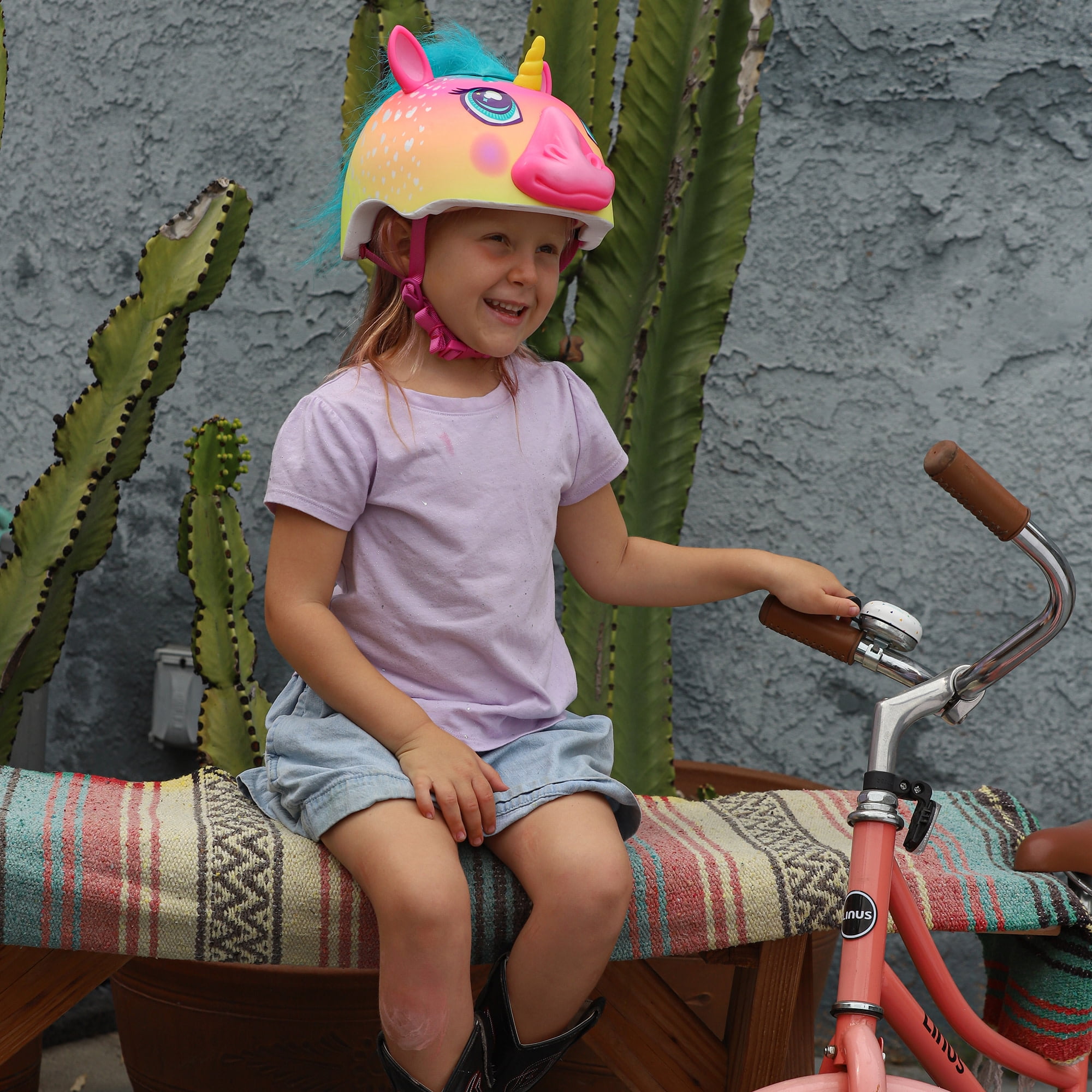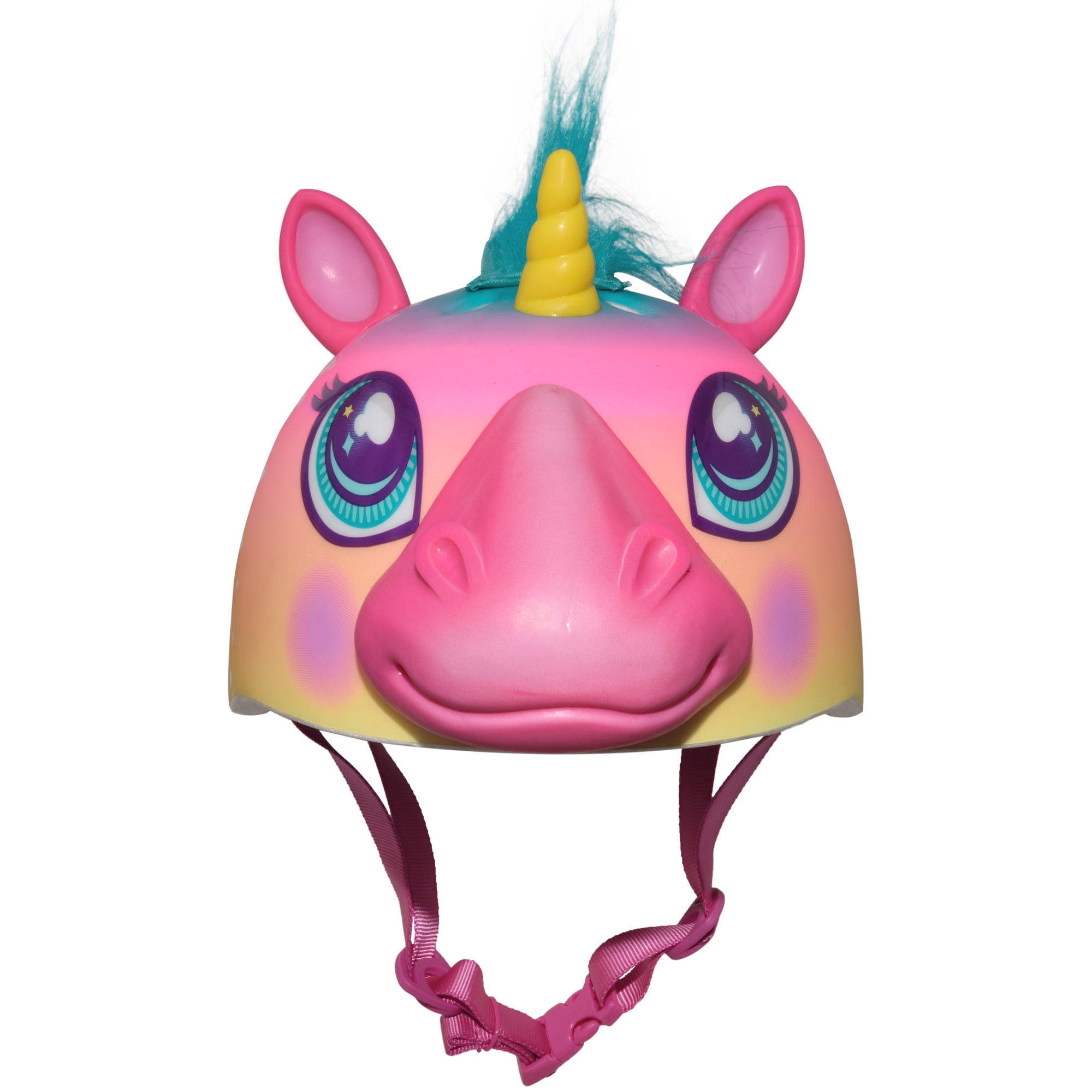 Your little one can learn to ride with confidence while wearing this Raskullz Super Rainbow Unicorn Hair Helmet. It features a 3D muzzle and ears made of durable rubber. The faux hair mane and printed hearts graphic on the back of this girls’ unicorn bike helmet tie it all together for a magical look. Cooling vents help keep your little rider comfortable, especially on warm spring or summer days. Its shell is made of PVC material, while the interior is constructed from expanded polystyrene foam. This Raskullz Super Rainbow Unicorn Hair Helmet is equipped with an adjustable chin strap that’s made of nylon to give your little one a snug, secure and proper fit. It’s a fun and colorful way to keep her safe as she learns to ride and improves her skills. This kids’ unicorn bike helmet is recommended for ages 5-8 years old and for heads measuring 50-54 cm.