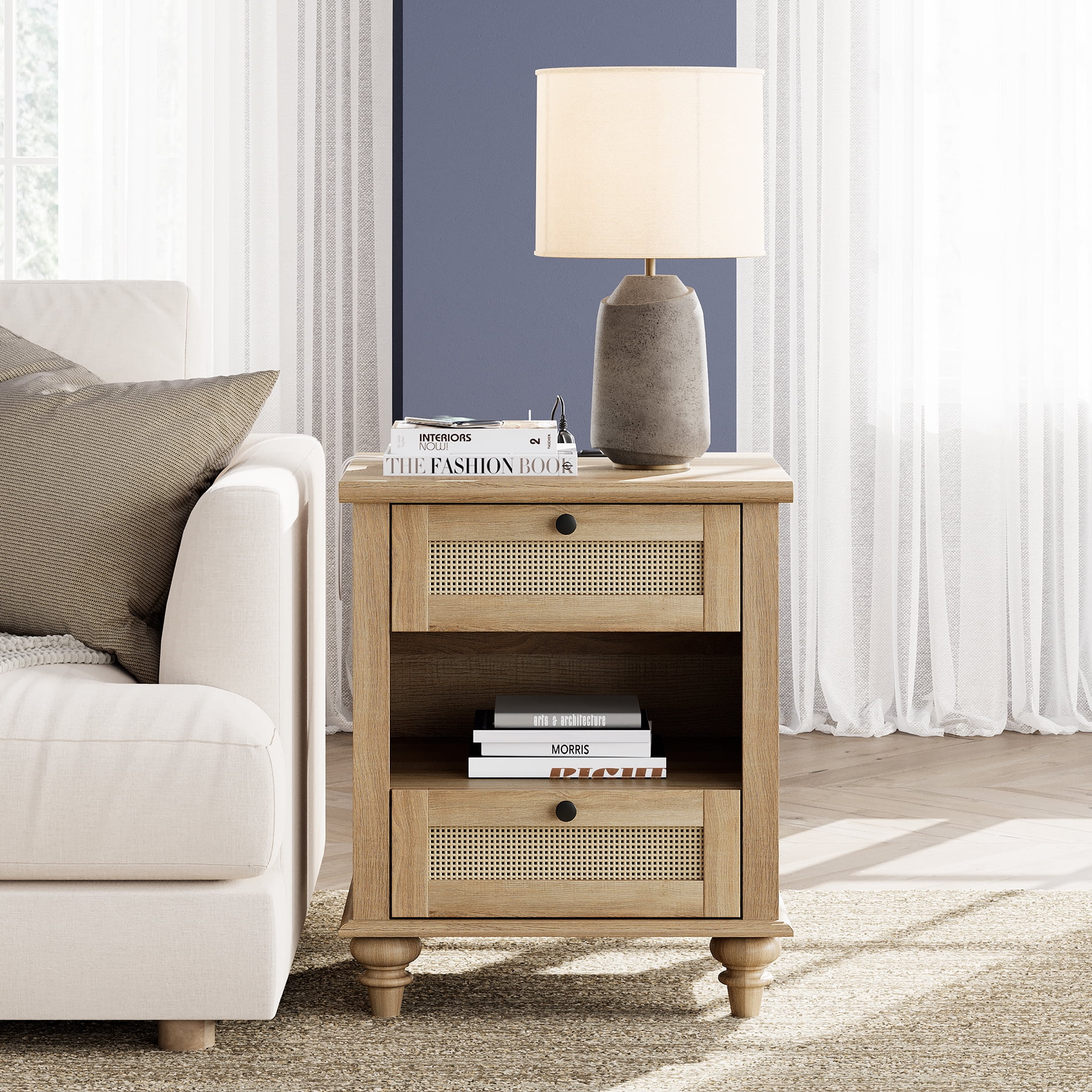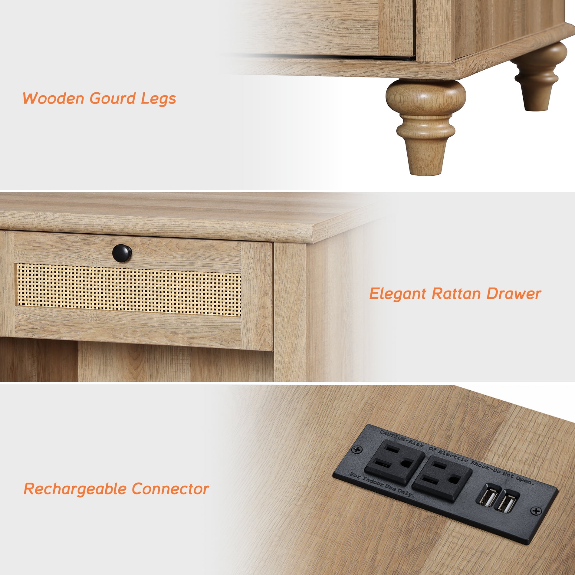 Nightstand with Charging Station: This oak night stand comes with built-in 2 outlets and 2 USB ports, as well as a 6.5 feet power cord. Provide a convenient charging place for your mobile phone, bluetooth earphones, watches, lamp and laptop, everything is within your arm’s reach. Side Table with 2 Drawer: This rattan end table with 2 drawers and 2 cubby gives you plenty of storage space. Enough to store your photos, books, lamps, mobile phones, alarm clocks and other daily necessities, keep your room organized. Solid Structure: Exquisite MDF and wood frame combination providethe bedside table with stable support. And 4 foot pads keep leveling and avoiding scratching the floor. Easy to clean, wipe gently with a damp cloth, the table looks new. Multipurpose Design: This rattan nightstand can be used as an end table in the living room, as office supplies storage in the office, or placed inside the closet to create extra storage. It offers an excellent arrangement for your room to keep all things organized and free of clutter, bringing rustic-chic style to your spaces. Easy Assembly: We have prepared clear step-by-step illustrated instructions and marked them with numbers or letters on each piece of hardware and parts, this makes it easy to find the parts you need. Just simply follow the illustration for each step to find the identically marked parts or hardware and assemble them together, repeat these two simple steps, you can easy to get this nightstand in 30-50 minutes.