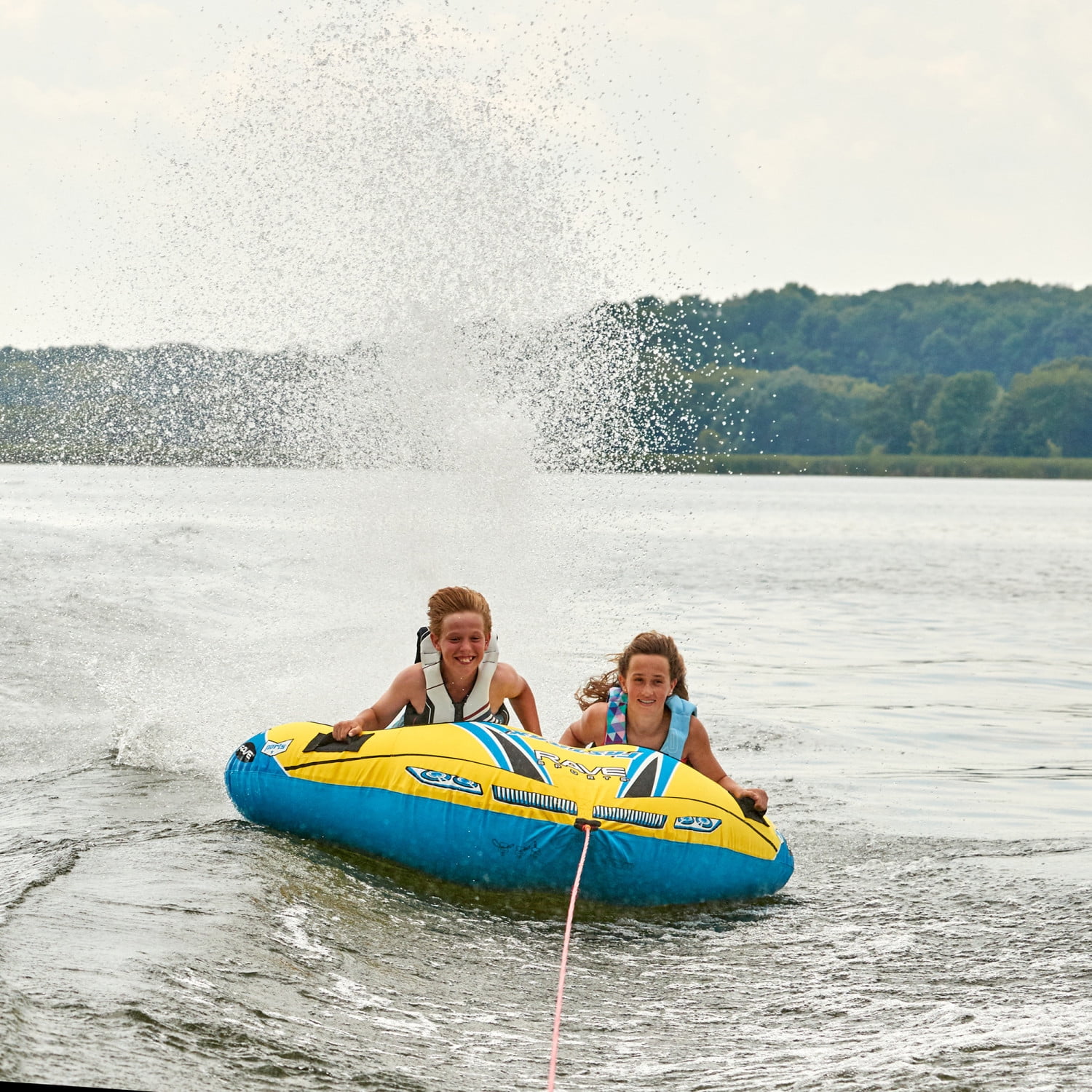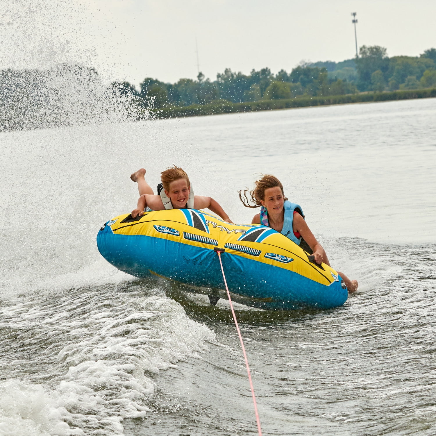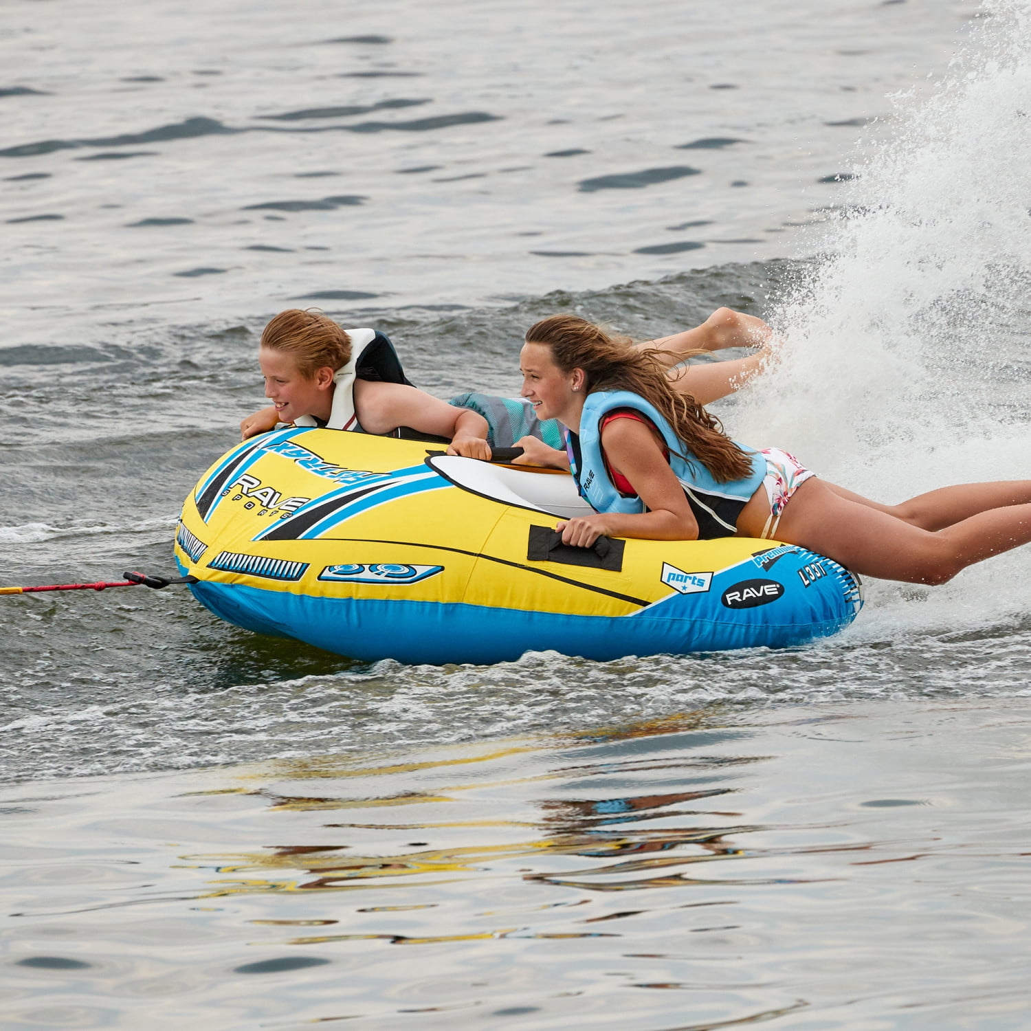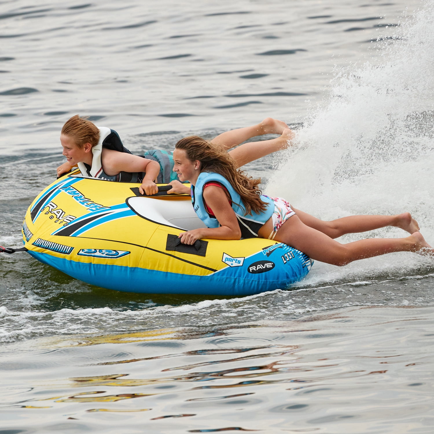 The Fastrax dual donut style tow tube features a Skim-Fast™™ bottom that provides a slick and fast ride making it easy to plane and skim across the wake, four handles, and a quick connect tow point. We added extra excitement with the RAVE Tail™ that shoots water high into the air and alerts other boaters that tubers are under way!