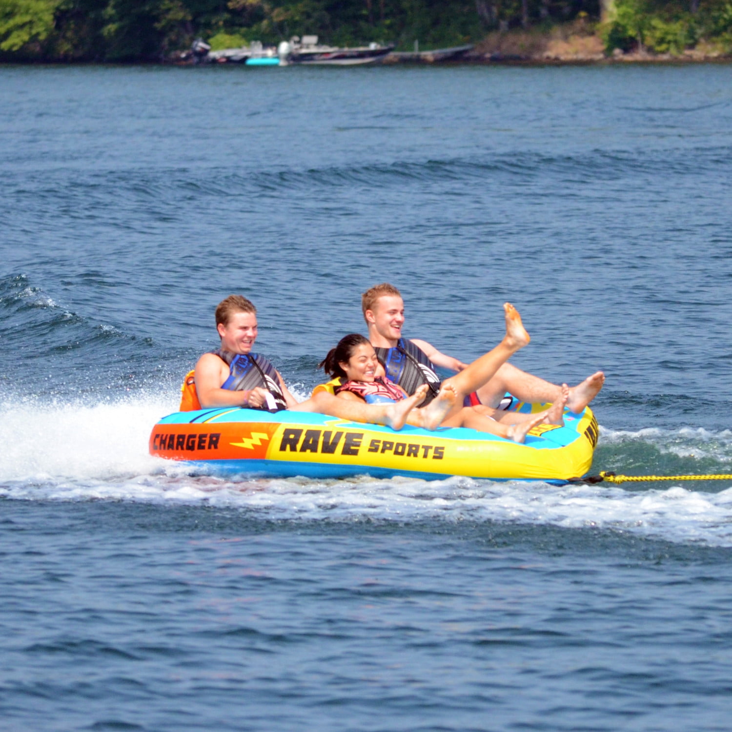 Don’t underestimate this RAVE Sports 3 Rider Towable Charger! This 3 rider tow tube takes thrills and spills to a new level. 3 Rider Towable Charger Sit on top style with comfortable hammock seats 6 handles Tall back rests provide support for a comfortable ride