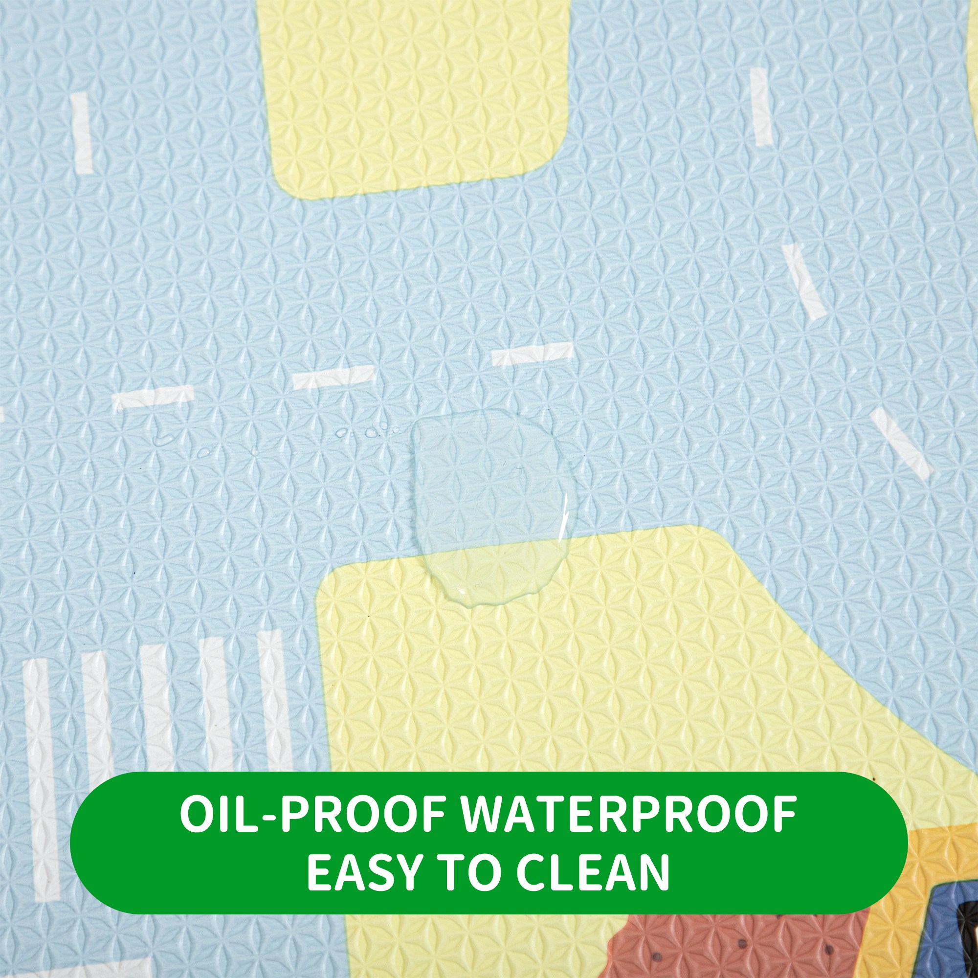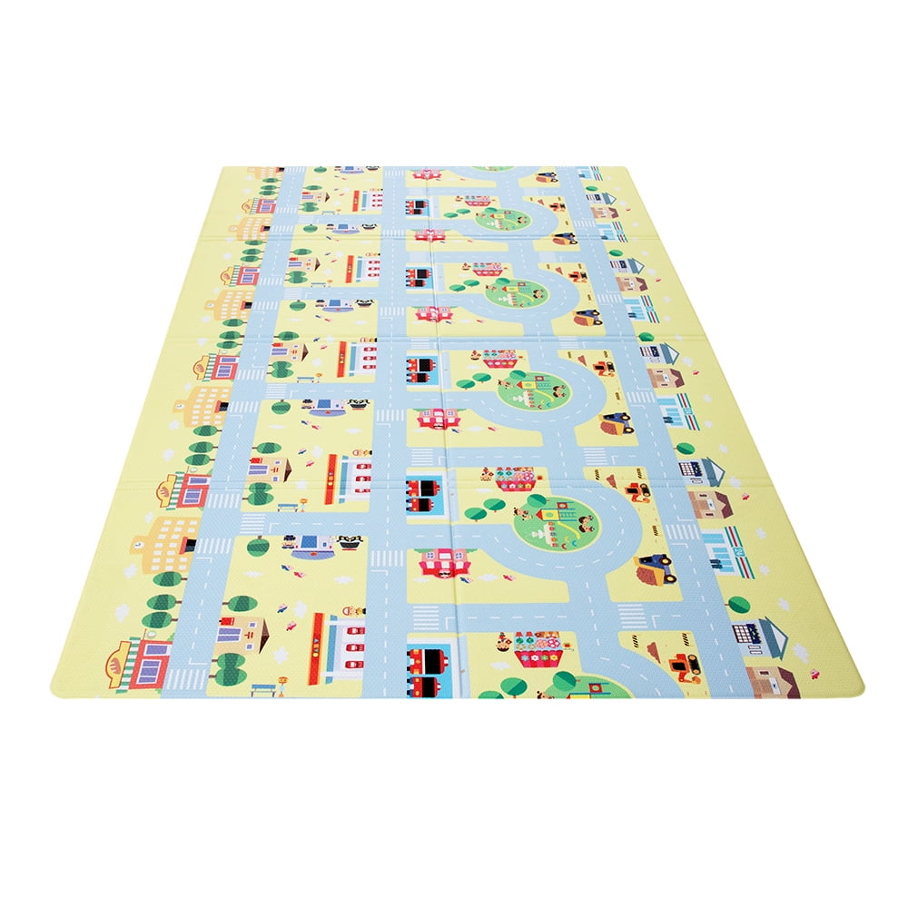 Crawling play mat thickness up to 0.39in. High-Density PVC, soft, Non-toxic, and BPA-free. Waterproof, and easy to clean.