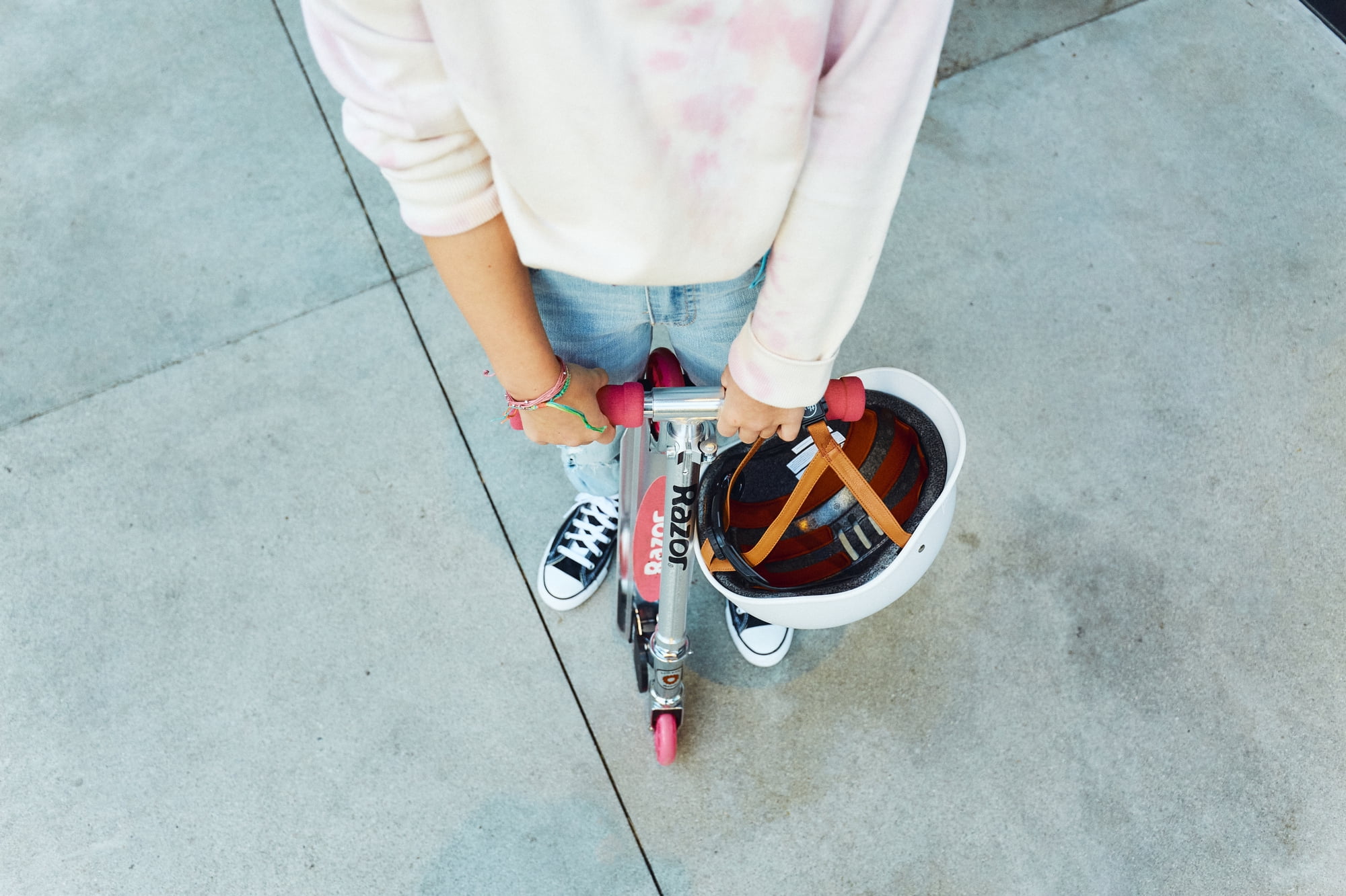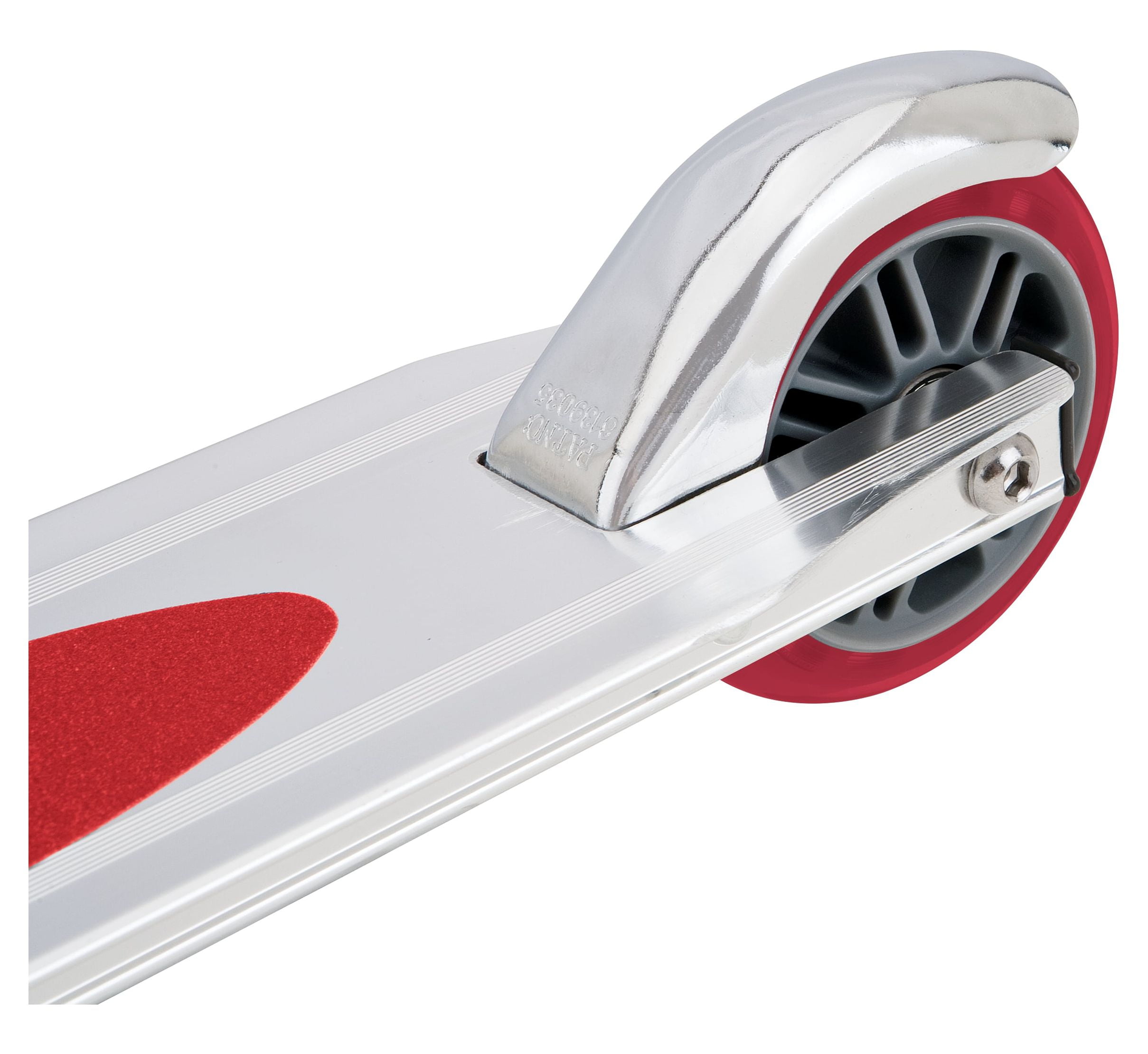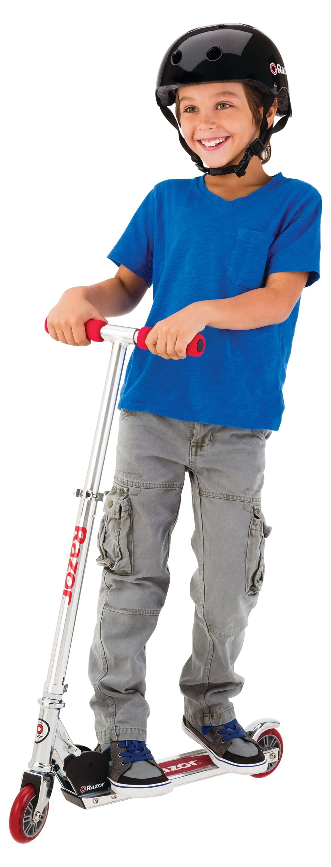 Top quality aluminum construction of the Razor A kick scooter is lightweight yet durable Features our original folding mechanism for quick and easy carry, transport and storage between rides Easy-adjust handlebars can be set to the perfect ride height Additional features include rear-fender brake and urethane wheels T-Tube/Deck: Aluminum Handlebars: Adjustable-height, folding Grips: Foam Downtube: Folding Wheels: Urethane Brake: Rear-fender Age: 5+ Gender: Unisex Max Rider Weight: 143 lb (65 kg) Assembled Product Dimensions:23.9” x 11.3” x 32.4” (607 mm x 288 mm x 823 mm) Product Weight: 4.62 lb (2.1 kg)