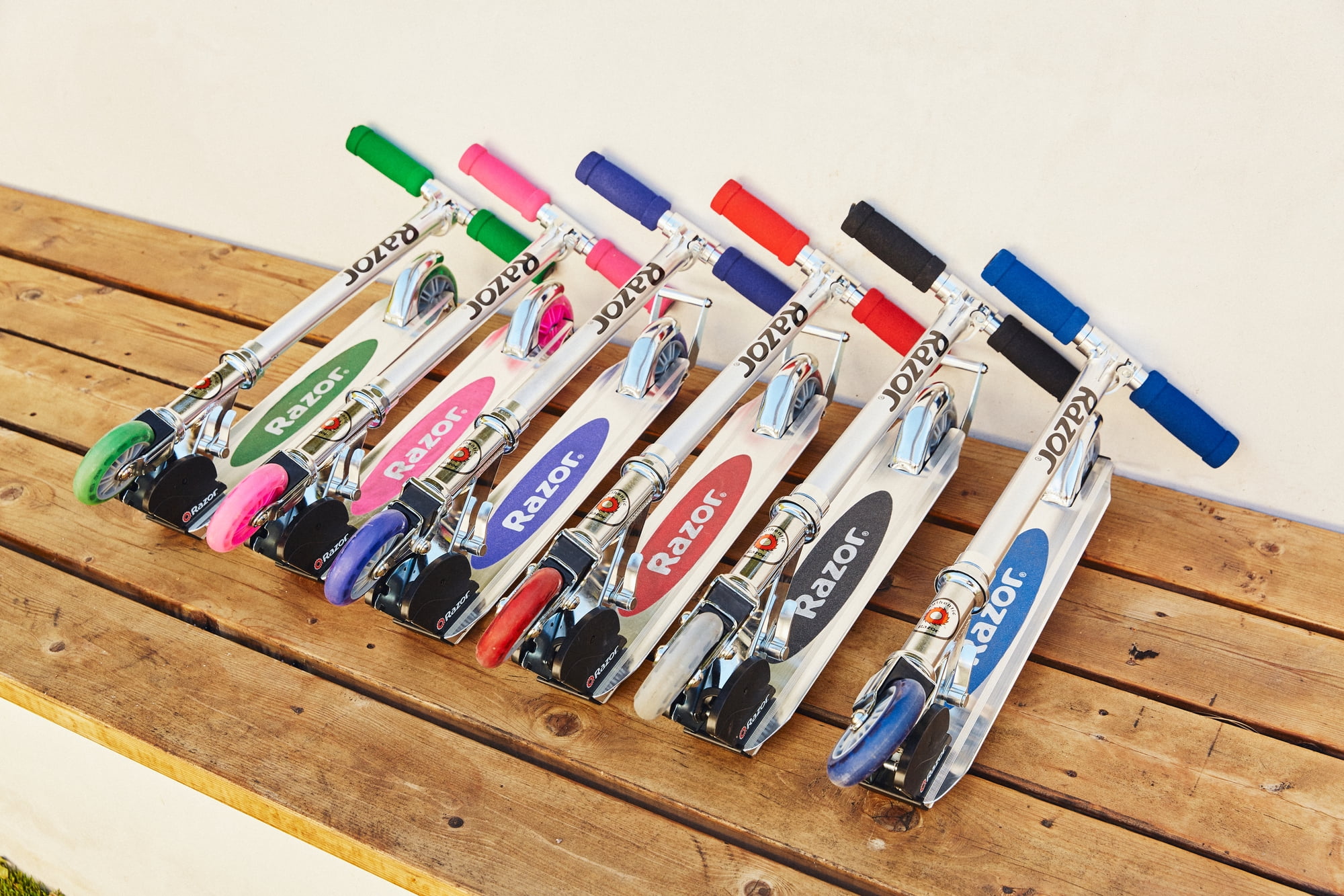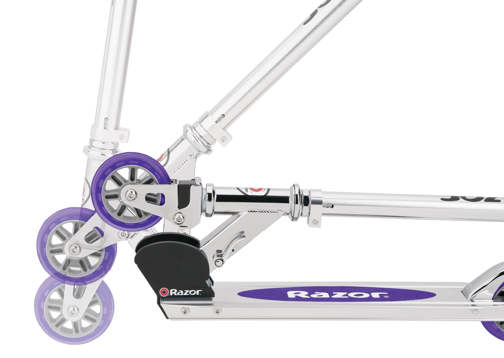 Razor A2 Kick Scooter: The Razor folding scooter is made of aircraft-grade aluminum for sturdiness Enhanced finger guard and patented rear fender brake for better safety Spring-less shock system Improved wheelie bar Urethane 98mm inline-style wheels with ABEC-5 bearings Patented folding mechanism and portability Adjustable handle bar height Folding handle bar lightweight at 6 lbs. Carrying capacity of 143 lbs. Blue handlebars, wheels and deck logo Warranty: 90 days See all Razor. See our entire assortment of bikes and ride on toys at . International Disclaimer: This Razor product is produced for sale in the United States and Canada. The Razor warranty for customers who intend to use it outside of the United States and Canada is not applicable. Razor products produced for and sold in international channels are warrantied as applicable in such foreign countries. Call +1 866 467 2967 or email [email protected] for more details regarding Razor products that require service, were purchased in the United States or Canada, and are now outside the United States or Canada. On these products, which require service, consumers are responsible for all costs including shipping, resulting taxes, duties of replacement parts and local power adapters at the owner’s expense.