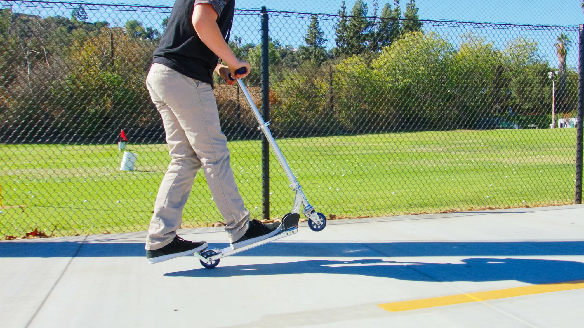 The original kick scooter, the Razor A2 Kick Scooter is fun for kids and teens alike. Great for speeding around the neighborhood, the Razor A2 scooter requires just a few scoots of one’s shoes. Your child can now reach nearby places faster than on foot with this razor kick scooter. The aircraft-grade aluminum tube and deck makes this scooter sturdy, yet lightweight. The braking system has a patented rear fender brake that ensures quick and easy stops. This 2 wheel kick scooter has a springless shock system for uncomfortable rides on the pavement. The 98mm urethane wheel with ABEC 5 bearings of this razor kick scooter offers a comfortable ride. The folding mechanism of the A2 Kick Scooter helps make this scooter portable. When not in use, you can fold and carry this kid’s kick scooter with you almost anywhere.
