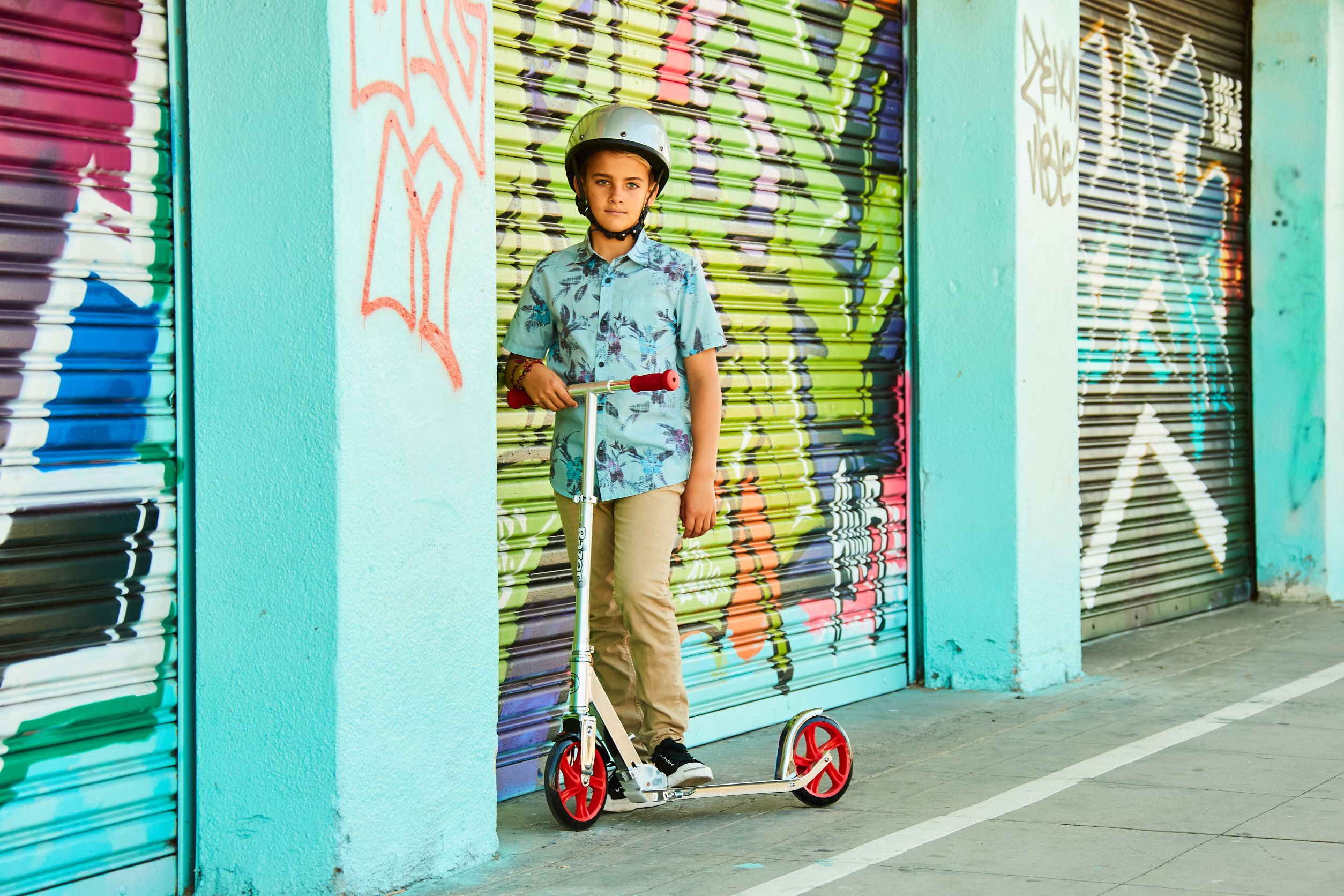 Extra-large, urethane wheels provide a super-smooth and comfortable ride. Light to carry and an ideal companion as a short commute kick scooter. Quick use folding mechanism allows for fast and easy storage Rear-fender brake makes for quick and easy slow and stop when in motion. Retractable kickstand can be kicked forward or back easily and when resting provides a stand for parking the scooter. Anodized finish features bold colors and attention-grabbing graphics. Easy-adjust handlebars include soft foam grips for enhanced comfort. Super-strong, height adjustable, aluminum T-tube and larger deck supports taller riders. Age: 8+ (Kids, Teens, Adults) Gender: Unisex Max Rider Weight: 220 lb (100 kg) Assembled Product Dimensions: 33.9” (86 cm)x 18” (45.7 cm)x 38.6” (98 cm) Product Weight: 8.38 lb (3.81 kg)