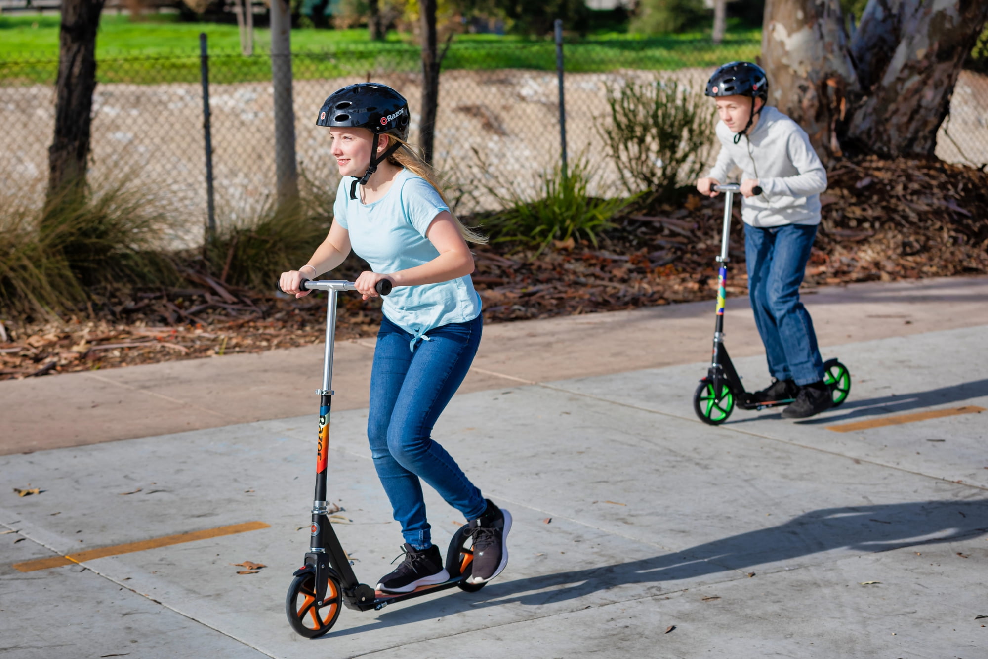 Large, 8-inch (200 mm) urethane wheels provide a smooth ride and activate a unique light show that mirrors the Razor logo as they start spinning. Strong, height adjustable aluminum T-tube and larger deck to support taller riders up to 220 lbs (100 kg). Bold colors and attention-grabbing graphics on both handlebar and deck. Easy folding mechanism and lightweight design allow for fast portability and storage. Rear fender brake makes for quick and easy slowing and stopping. T-tube: Anodized aluminum with multi-color graphic decal Handlebars: Adjustable-height, folding Grips: Foam Downtube: Folding Deck: Anodized aluminum with multi-color, full-deck grip tape Wheels: Light-up hub, 8″(200 mm), urethane Brake: Rear-fender Kickstand: Retractable Age:8+ Max Rider Weight: 220 lbs (100kg) No assembly required Color: Orange, Green Assembled Product Dimensions: 33.9″ x 16.9″ x 38.6″ (86 cm x 43 cm x 98 cm) Product Weight: 8.75 lbs (3.97 kg)