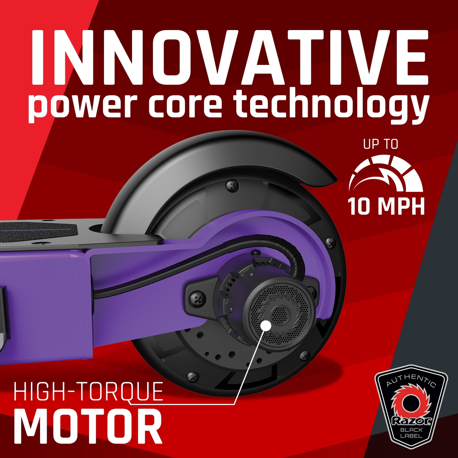 Powered by Power Core – Innovative Power Core technology features a high-torque, maintenance-free hub motor that generates speeds up to 10 mph (16 km/h) – top speed in its class. Smooth Moves – An 8″ (200 mm) pneumatic front tire delivers a smoother ride on uneven terrain. Intuitive Control – Thumb-activated throttle, hand-operated front brake, and rear-fender brake put you in control of starts and stops. Safe and Stable – Rear-wheel drive apportions greater weight to the rear, enhancing both drive traction and ease of steering. Sturdy and Stylish – All-new design with an all-steel deck and frame, plus an airless, flat-free rear tire for a solid ride. Run Time: Up to 35 minutes of continuous use Battery: 12V sealed lead-acid, rechargeable (Battery charger included) Electrical system certified compliant with UL2272 by Guangdong UTL Co., LTD., an accredited testing lab. U.S. and International Patents Pending Some Assembly Required Age: 8+ Age Group: Child, Tween Gender: Unisex Max Rider Weight: 120 lbs (54 kg) Assembled Product Dimensions: 33.62″ (85.4 cm) x 15.75″ (40.0 cm) x 35.03″ (89.0 cm) Product Weight: 21.52 lbs (9.8 kg)