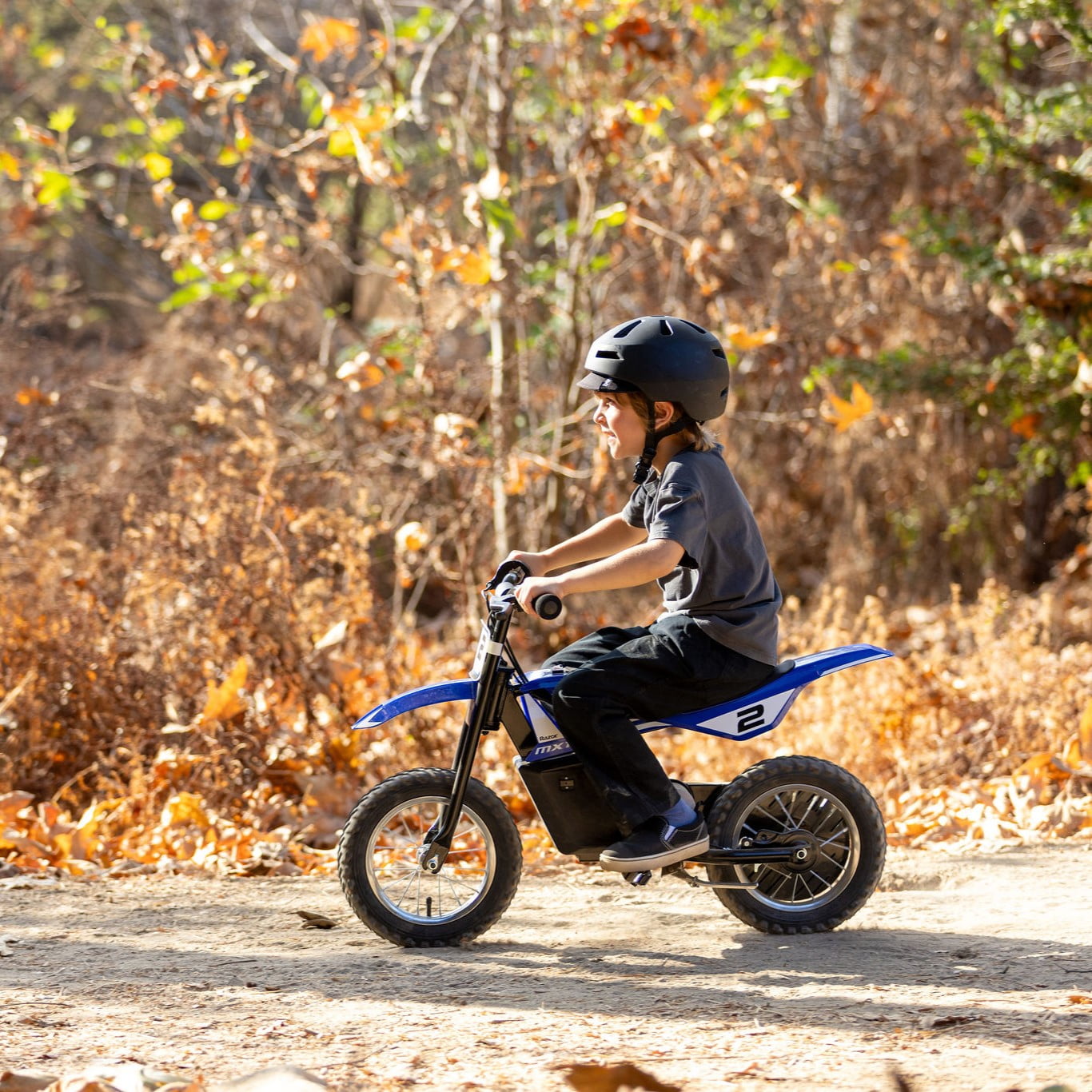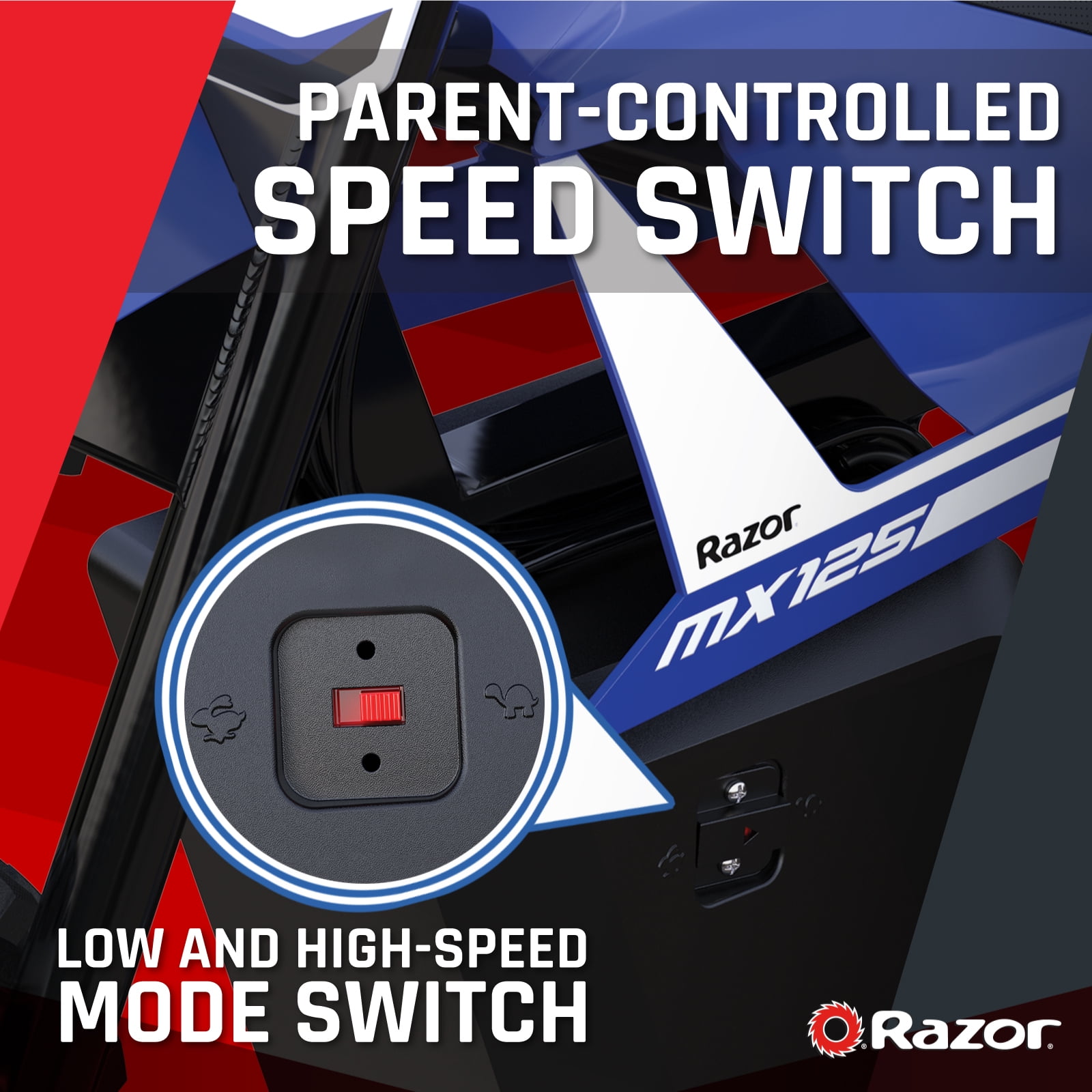Razor’s smallest electric-powered dirt bike, the MX125 helps younger riders build confidence on dirt, delivering top-notch performance with authentic MX-frame geometry, motocross-style tires and twist-grip throttle for a true-to-life dirt bike ride. Rear-wheel drive delivers better weight and balance control for greater safety and stability, while the high-torque, chain-driven electric motor powers riders up to 8 mph (13 km/h) in default High Speed Mode. Additionally, a high/low speed control switch allows parents to limit their child’s MX125 to a top speed of 5 mph (8 km/h) for younger riders and beginners. It’s the perfect introduction to the excitement and adventure of off-road riding.