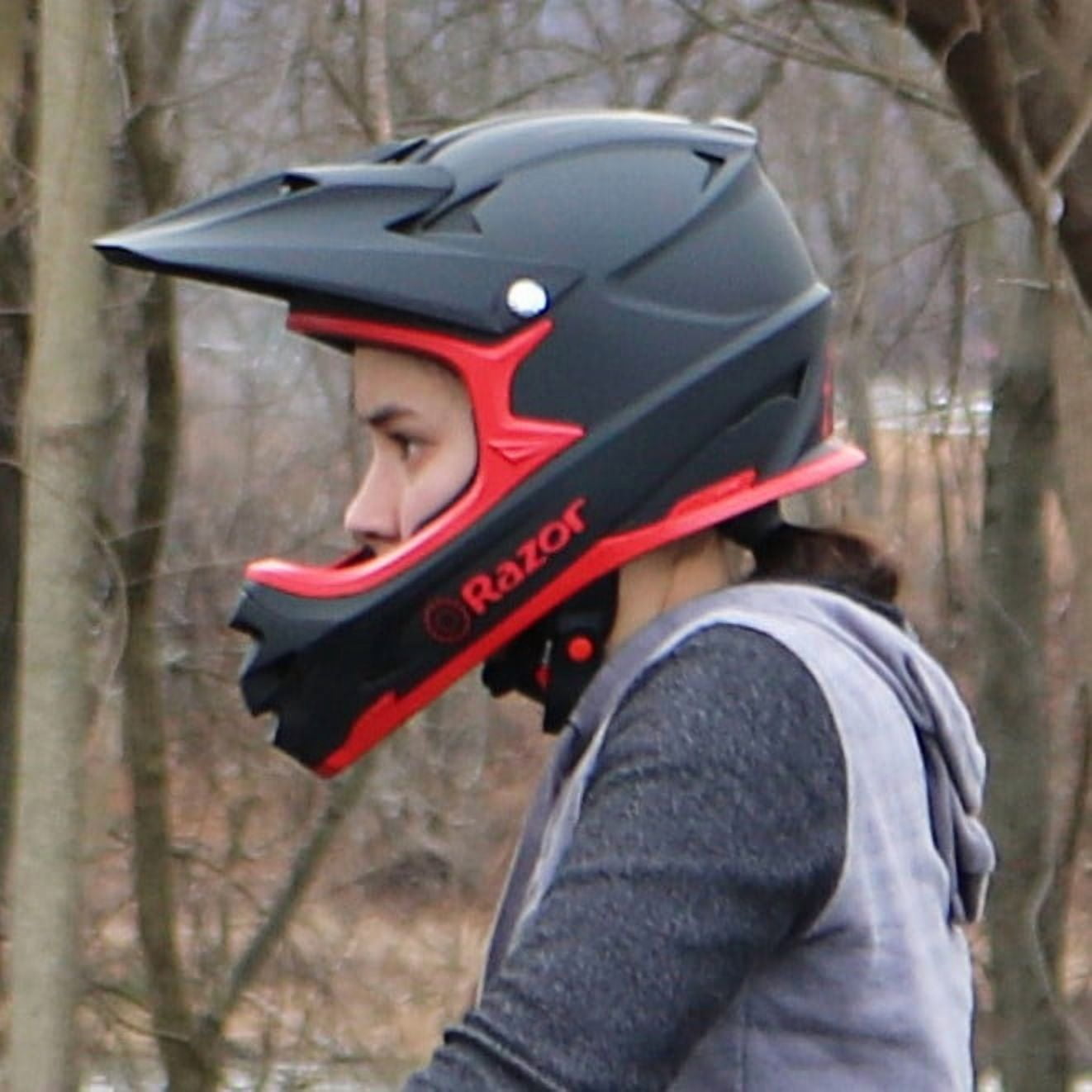 The Razor full-face helmet in black/red provides complete coverage to offer your child the ultimate safety. It includes vents that help keep your child cool on those heated rides. The black full-face helmet also contains extra pads for a personalized fit and extra security in the case of falls. The large eye ports are specially designed to accommodate goggles for eye protection. It contains an adjustable visor and strap for a comfortable fit and to ensure it stays in place while they’re active. It complies with CPSC guidelines and offers a practical safety solution for all of your child’s outdoor activities. Built with quality and safety in mind, it’s a good choice for keeping your child secure while they are riding their bike, skating on the streets, or cruising around on their skateboard.