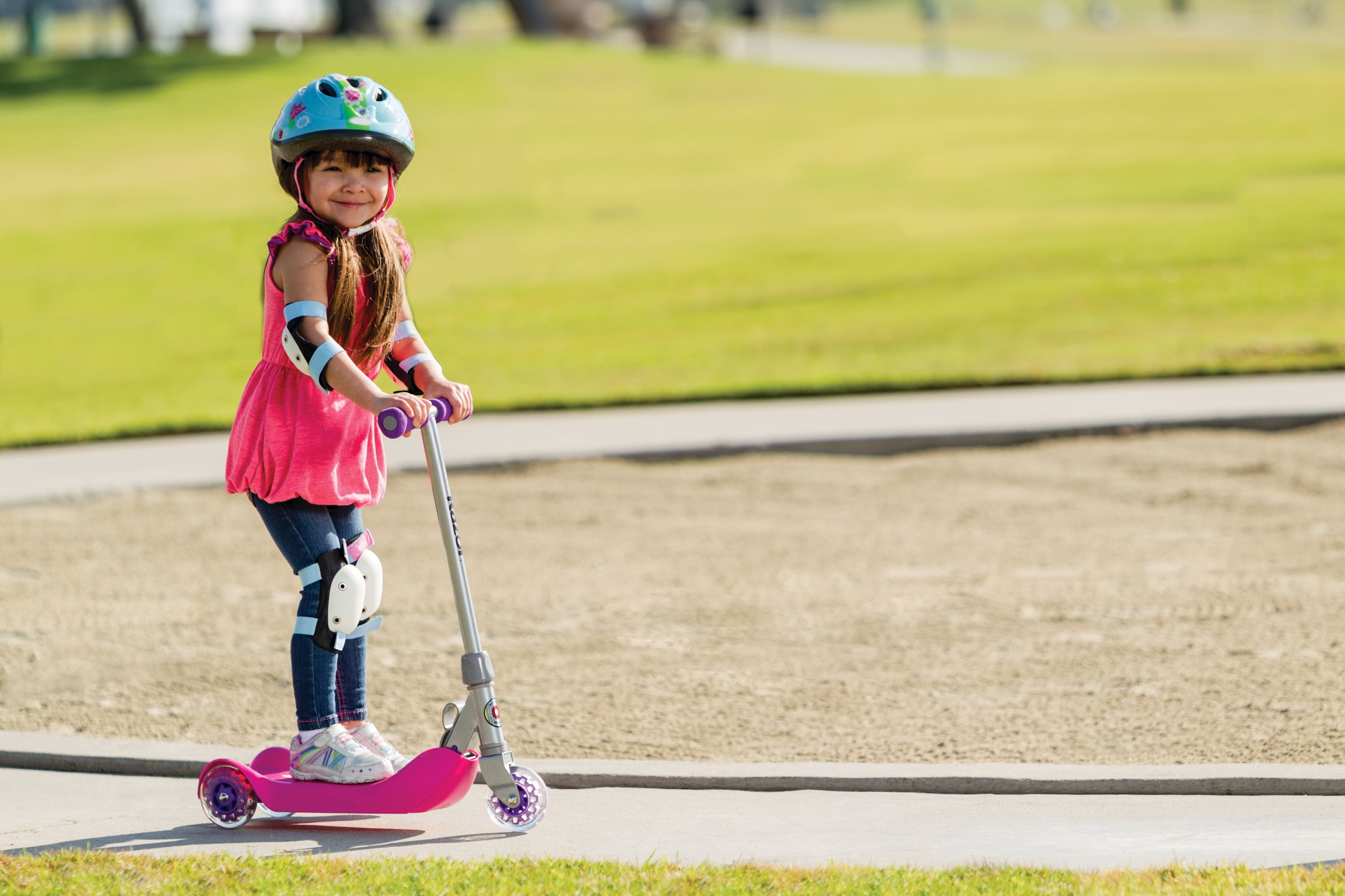 The Razor Jr. Folding Kiddie Kick Scooter features an all-new design with a cool retro-inspired style. This folding kick scooter also comes with a child safety latch on the folding mechanism for security. The three-wheel design of the Razor Jr. Kick Scooter provides stability and helps children build coordination. This Razor Jr. Folding Kiddie Kick Scooter also provides easy-grip handles and ample foot room, so it is easy for kids to ride. The steering column, t-tube, and handlebars on the Razor Jr. Kick Scooter are constructed out of aircraft-grade aluminum that ensures a durable and lightweight design. When assembled, the Razor Jr. Folding Kiddie Kick Scooter measures 13.5″ long x 29.5″ wide x 26″ high. This Razor Jr. Scooter is recommended for children between the ages of 3 and 5 years old. (Gender: Unisex; Product Net Content: 1 each).