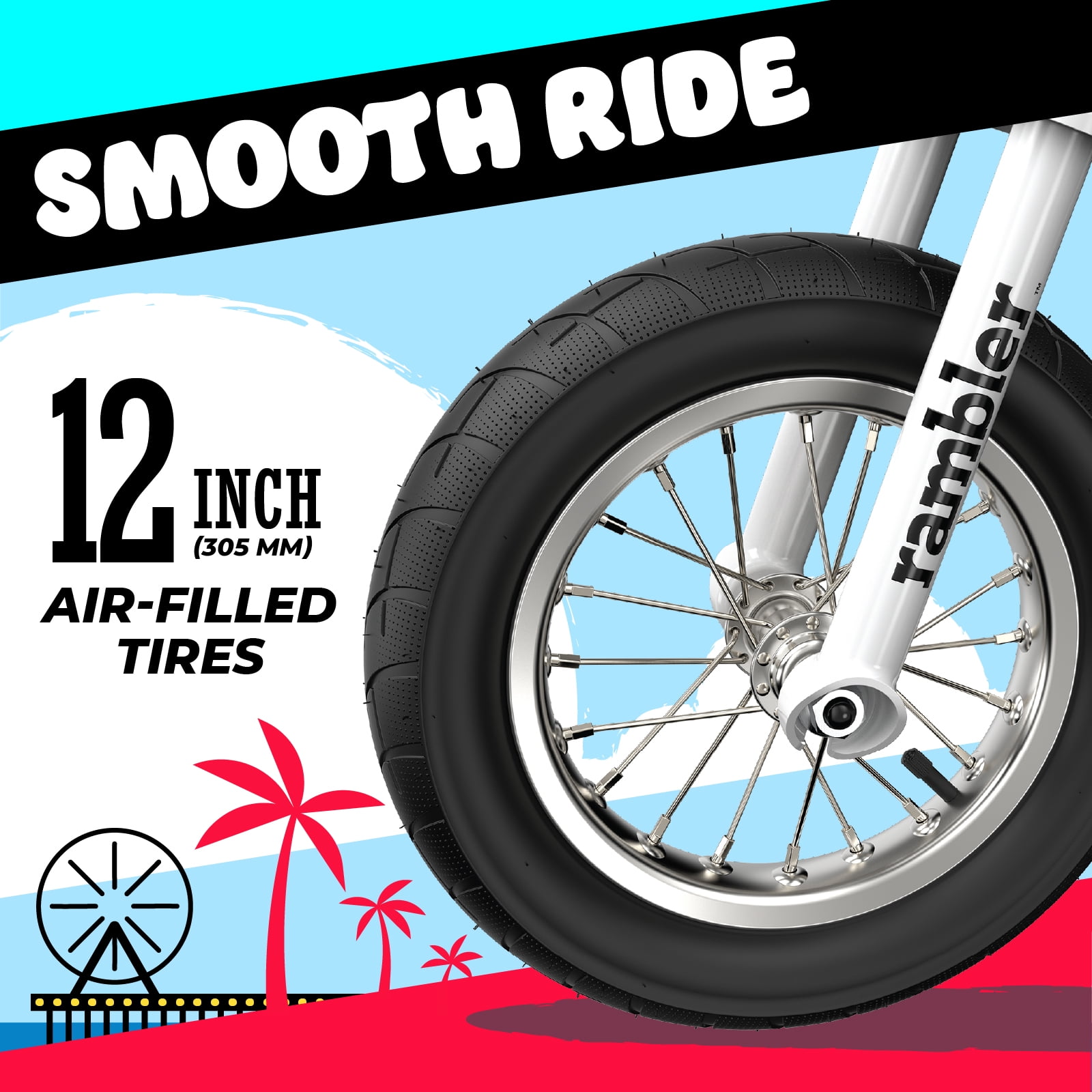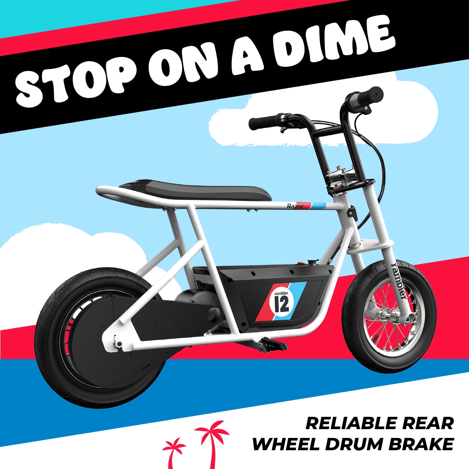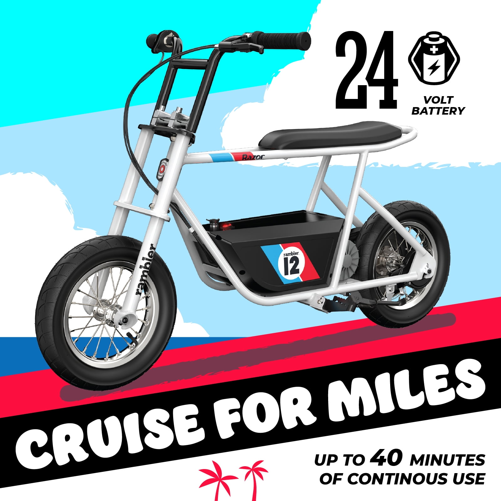 The Razor Rambler 12 has arrived – A modernized take on the vintage mini bike phenomenon. A combination of style, efficiency, and power make this quality electric minibike a top-of-the-line riding experience for teenagers. Efficient and eco-friendly – High-torque 250-watt motor delivers speeds up to 14 mph (23 km/h), and a rechargeable 24-volt battery system helps achieve up to 40 minutes of continuous ride time on a single charge. Smooth and versatile – Super wide, 12″ (305 mm) pneumatic tires are heavy duty to tackle rough surfaces. Sturdy and Durable – With a high-quality steel build, the Rambler 12 is a solid and durable electric ride that stands up to rugged use. Sitting stylish – The Rambler 12 features an elongated, banana-style, padded seat that lets you sit high and mighty. Battery: 24V (two 12V) sealed lead-acid, rechargeable (battery charger included) Electrical system certified compliant with UL2272 by Guangdong UTL Co., LTD., an accredited testing lab. Color: White Age: 13+ Age Group: Teen Gender: Unisex Max Rider Weight: 170 lb (77 kg) Some assembly required Assembled Product Dimensions: 44.8″ x 25.2″ x 29.1″ (114 cm x 57 cm x 74 cm) Product Weight: 47.7 lb (21.7 kg)